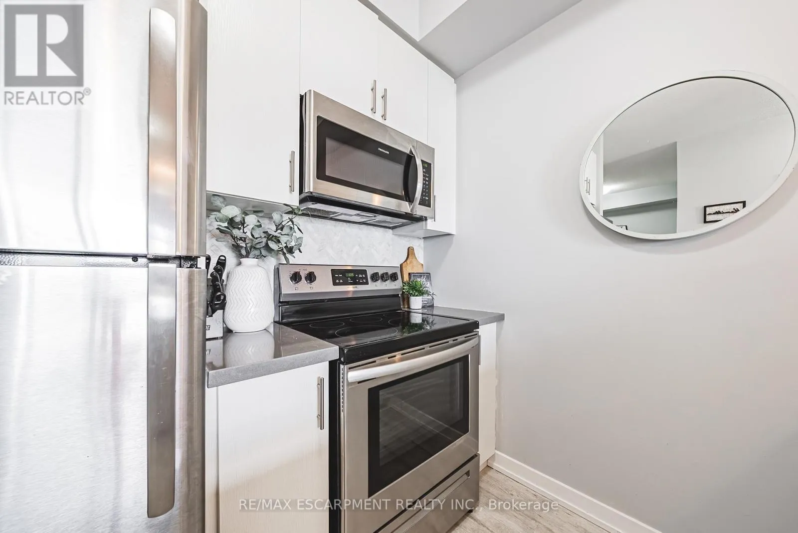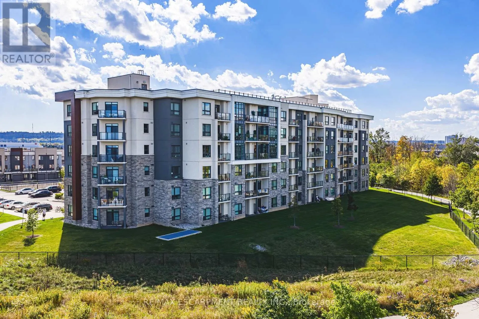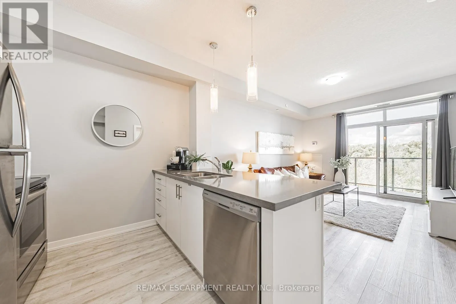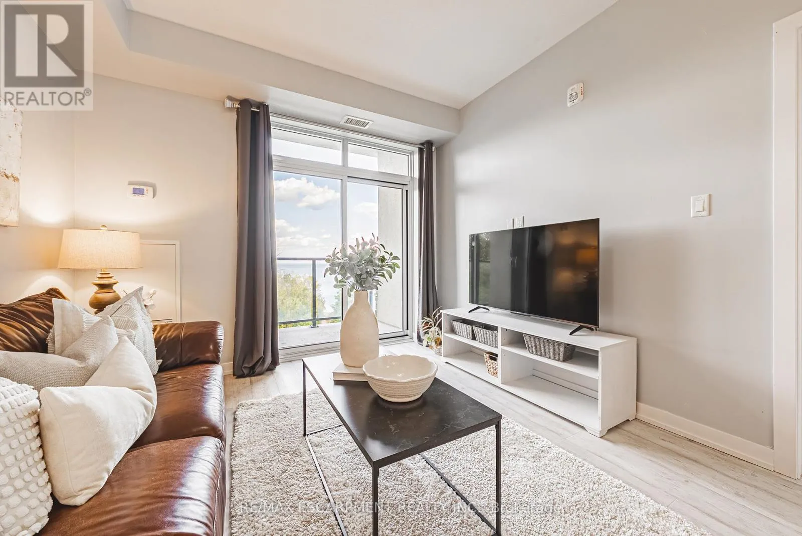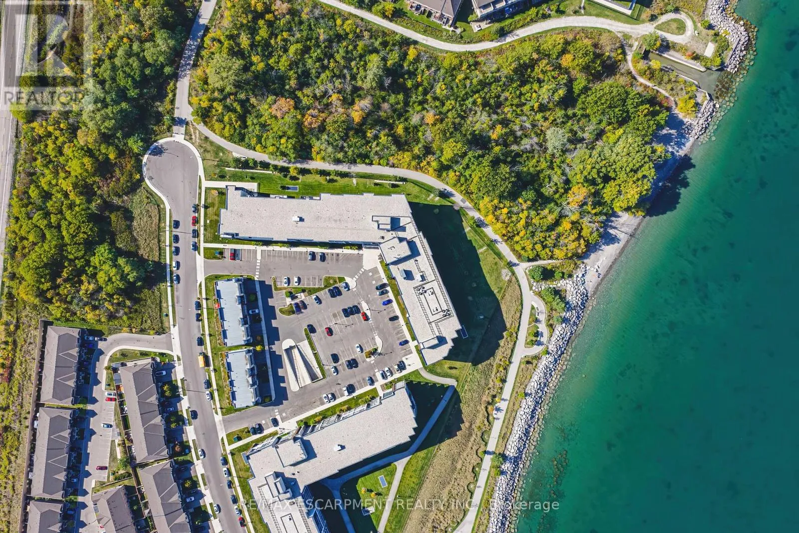 Cross Streets: Millen Road. ** Directions: SHOREVIEW PLACE & MILLED ROAD. This 1 Bed + Den condo offers a modern, open-concept layout with upgrades throughout and an unbeatable spot right along the water. Floor-to-ceiling windows let in tons of natural light and frame stunning views of Lake Ontario, whether you're in the kitchen, living room, or bedroom. The interior is sleek and stylish with a neutral colour scheme, oversized porcelain tile, 9' ceilings, and no carpet just clean, modern finishes like quartz counters, a chevron-tiled backsplash, soft-close cabinets, and stainless steel appliances. The kitchen also includes a large island, deep fridge cabinet, smooth-top stove, and Moen pull-down faucet a solid setup whether you cook a lot or just like the space to entertain. Theres a flexible den space too, perfect for working from home or hosting guests. Step out onto your private balcony to enjoy morning sunrises or an evening glass of wine with nothing but clear lake views ahead. This unit is part of the Sapphire Condos community, backing onto a waterfront trail and private beach that connects to the 8km Hamilton lakeside path ideal for biking, walking, or just getting outside. Amenities include a rooftop patio, gym, party room, secure bike storage, underground parking, and in-suite laundry. Heating and cooling are via energy-efficient geothermal. You're minutes from the QEW, LINC, and the new GO station for easy commuting, and close to local wineries, restaurants, and shopping when you want to unwind. If you're looking for easy, modern living right on the water, this is it! (id:27476)