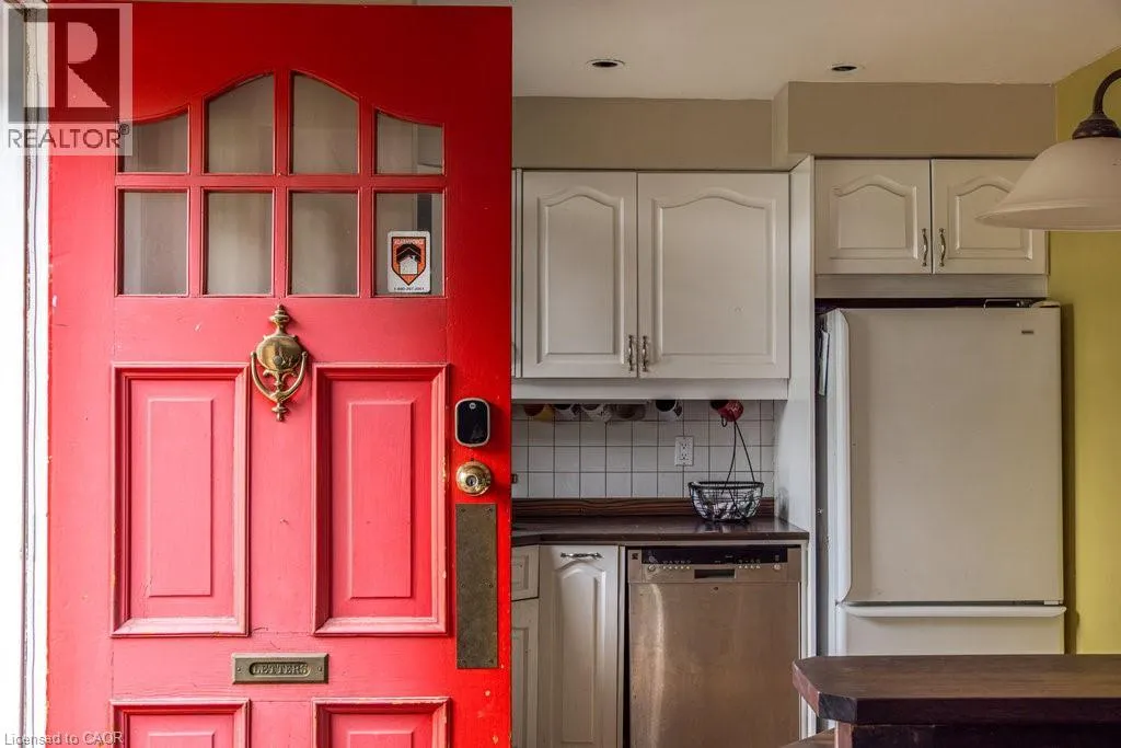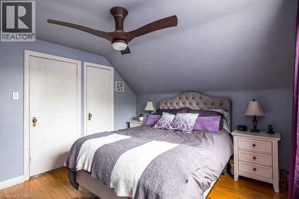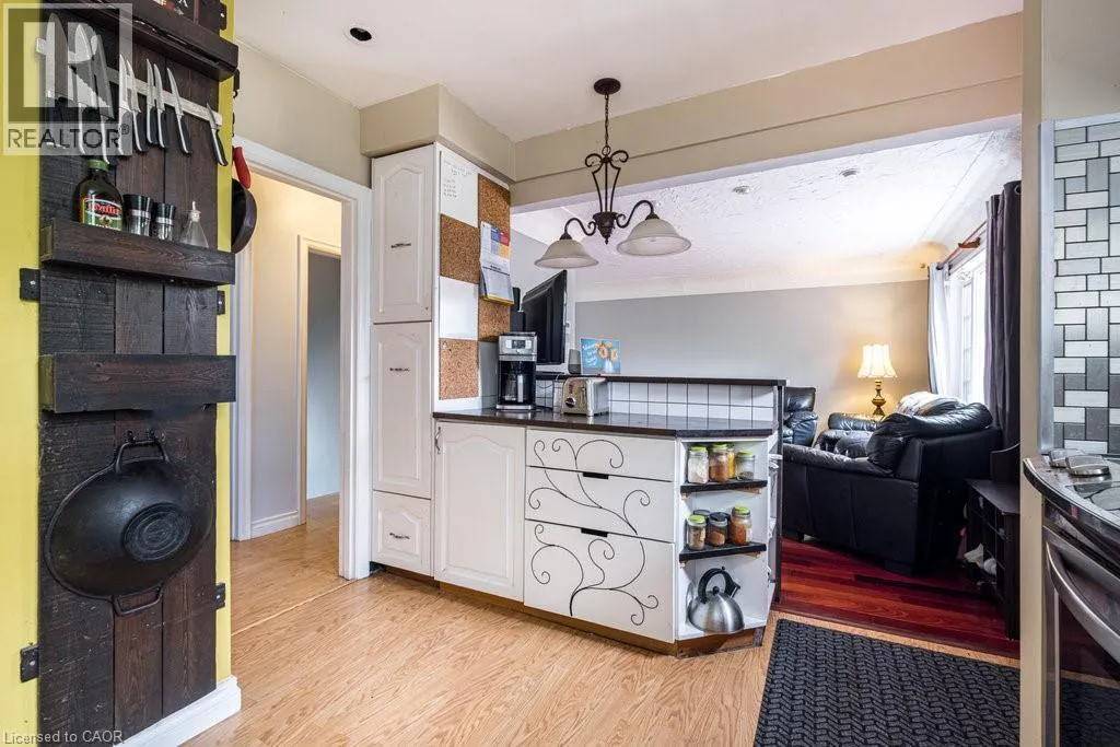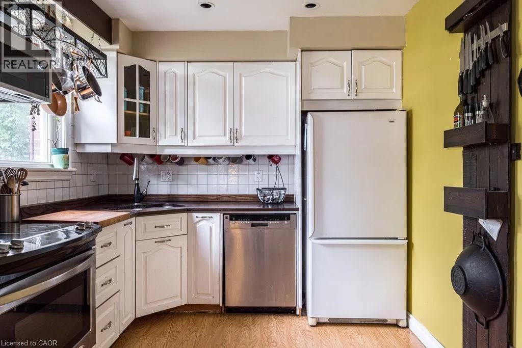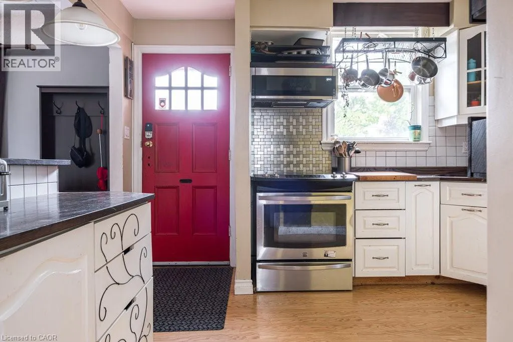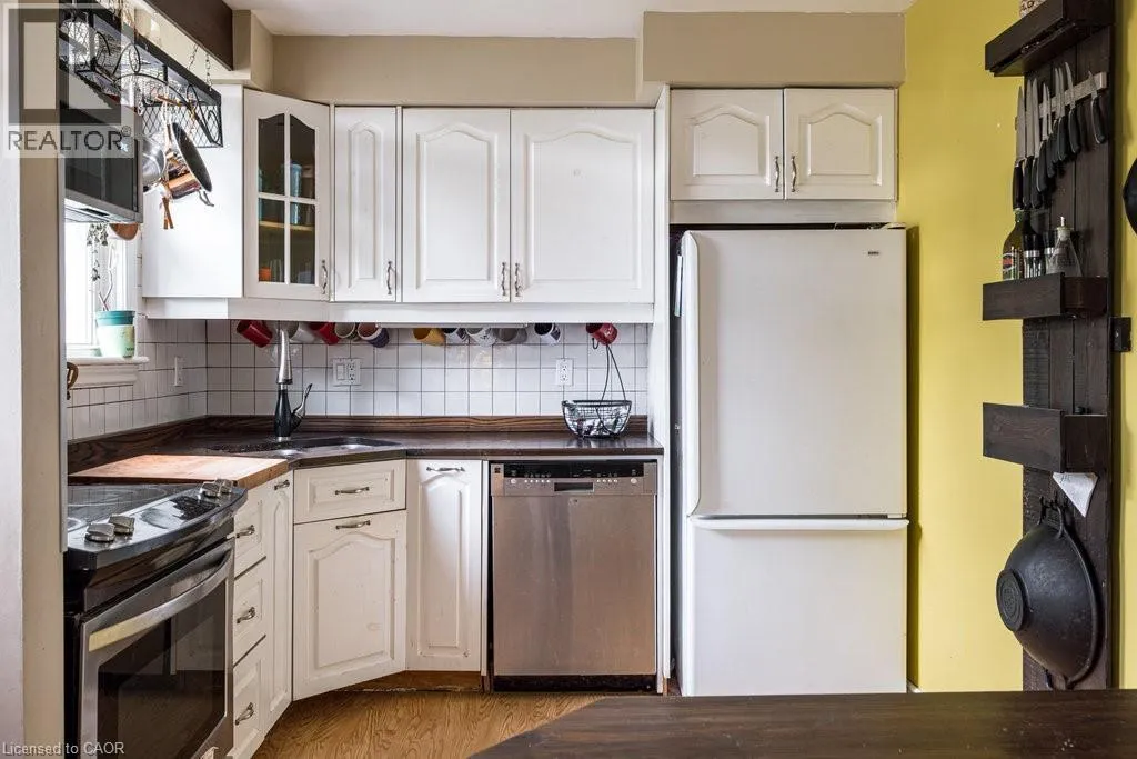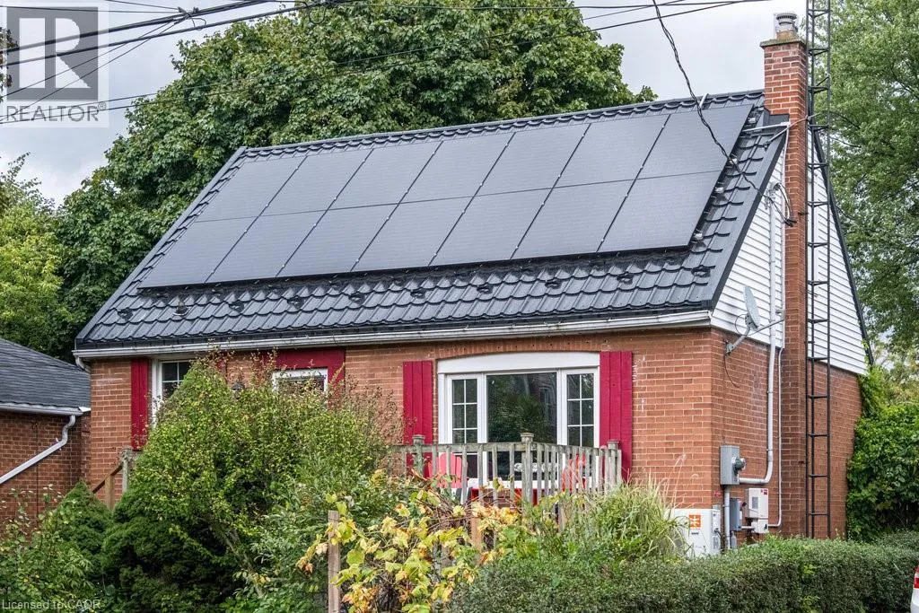 East of Upper Wellington between Queensdale Avenue and Brucedale Avenue. Welcome to this beautifully maintained 3-bed, 2-bath detached home with a fully finished basement, located in a desirable neighbourhood where charm meets comfort. From the moment you arrive, youâll be impressed by the inviting front porch, lovely gardens, and fruit trees - a true gardenerâs delight. Step inside to discover a freshly painted interior with hardwood floors, high cove ceilings, and an updated kitchen (2021) with modern finishes. The open-concept living and dining areas feature a built-in bar and entertainment unit, perfect for family gatherings or quiet evenings at home. A main floor bedroom and full 4-piece bath add convenience and flexibility for guests or multi-generational living. Upstairs, youâll find two bright bedrooms with large windows, deep closets, and vaulted ceilings. The lower level offers exceptional space with a cozy recreation room, home office/guest room, laundry room with Bosch washer and dryer, and an electric fireplace for added warmth. This home has been thoughtfully updated and energy-efficiently enhanced with a metal roof (2018 & 50-year warranty), high-efficiency windows (2010), owned solar panels, a new hot tub pump (2023), owned water heater (2022), and owned heat pump with an extra built-in heater for colder days. Recent updates include new front steps and plumbing (2025). Spray foam insulation ensures year-round comfort in this home very sweet home! Enjoy a private, fully fenced backyard perfect for relaxing or entertaining, plus a detached single-car garage with shelving and a 240-amp plug for an electric vehicle. A truly move-in-ready home that blends warmth, efficiency, and character, all within a peaceful setting youâll love coming home to each and every day. (id:27476)