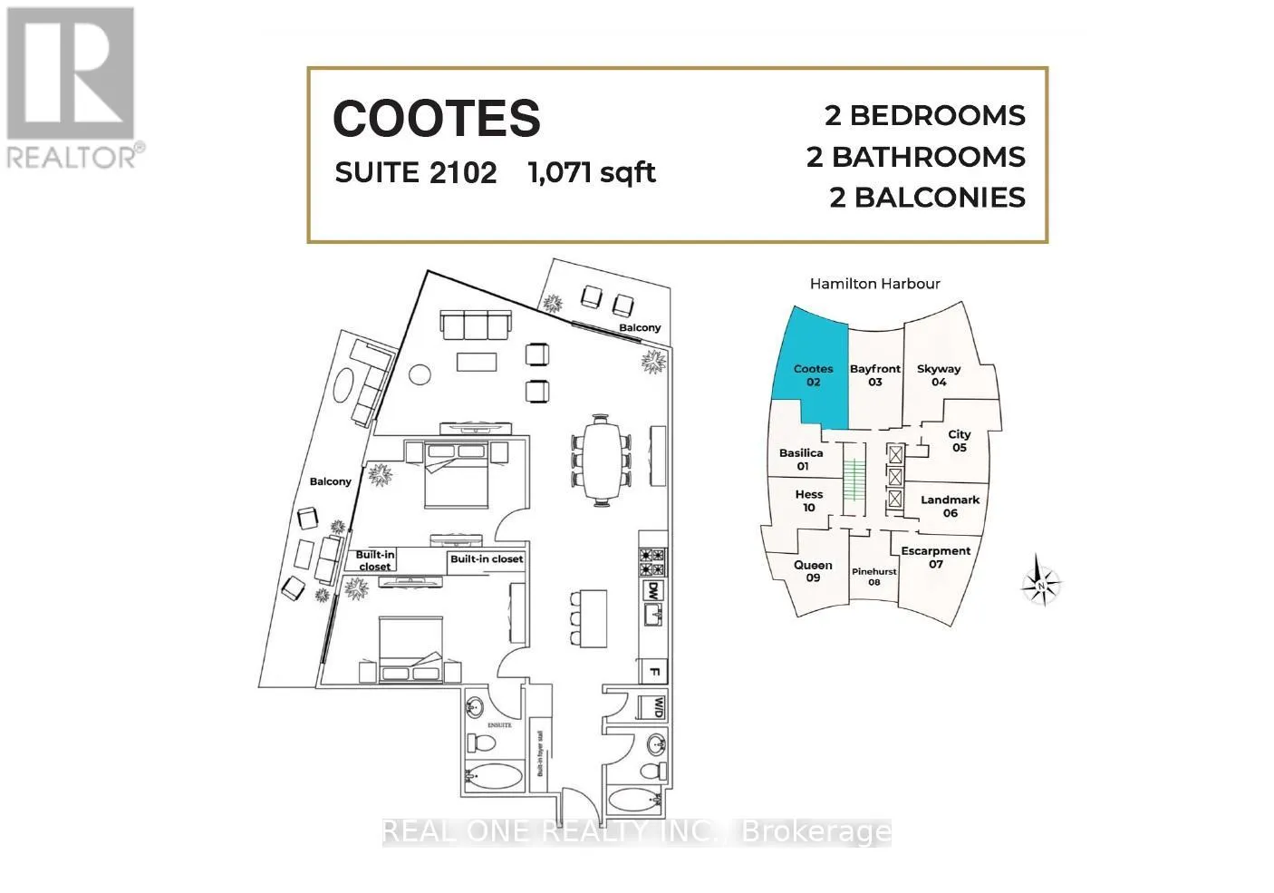 Cross Streets: George & Caroline. ** Directions: Caroline St S to George St. Marquee Residence Is One Of The Most Sought-After Luxury Condo Buildings In The Heart Of Downtown Hamilton A Modern, 5-Year-New Landmark And The Second-Tallest Building In The City. This 1071 sqft Spacious Two-Bedroom Corner Unit On The 21st Floor Offers Two Oversized Balconies With North And West Views Overlooking The Escarpment And The Lake. A Sleek Kitchen Featuring A Central Island, Quartz Countertops, Backsplash, European-designed Custom Cabinetry And Stainless-Steel Appliances. Vinyl Flooring Throughout. Two Bright Bedrooms With Built-In Closet Organizers, And Large Windows That Fill The Home With Abundant Natural Light. In-Suite Laundry Included. Residents Enjoy Top-Notch Amenities, Including A Gym, Yoga Studio, Two Party Rooms,Complete With Kitchenette, Lounge Chairs, Fireplace And Billiards Table, And An 8th-Floor Outdoor Terrace Ideally Located Just One Block From Hess Village, Nations Supermarket, Samir Supermarket, Jackson Square, And The New McMaster Family Practice. HSR And GO Bus Stops Are Right At Your Doorstep. Close To McMaster Children's Hospital, St. Joseph's Healthcare Centre, And Hamilton General Hospital. No Smoking Building. Other Units With Various Sizes And Layouts Are Also Available, Offering Sweeping Views Of The Waterfront, Escarpment, And Downtown Skyline. Indoor Parking Available at Extra $150/Month. Available Immediately. Flexible Possession. (id:27476)