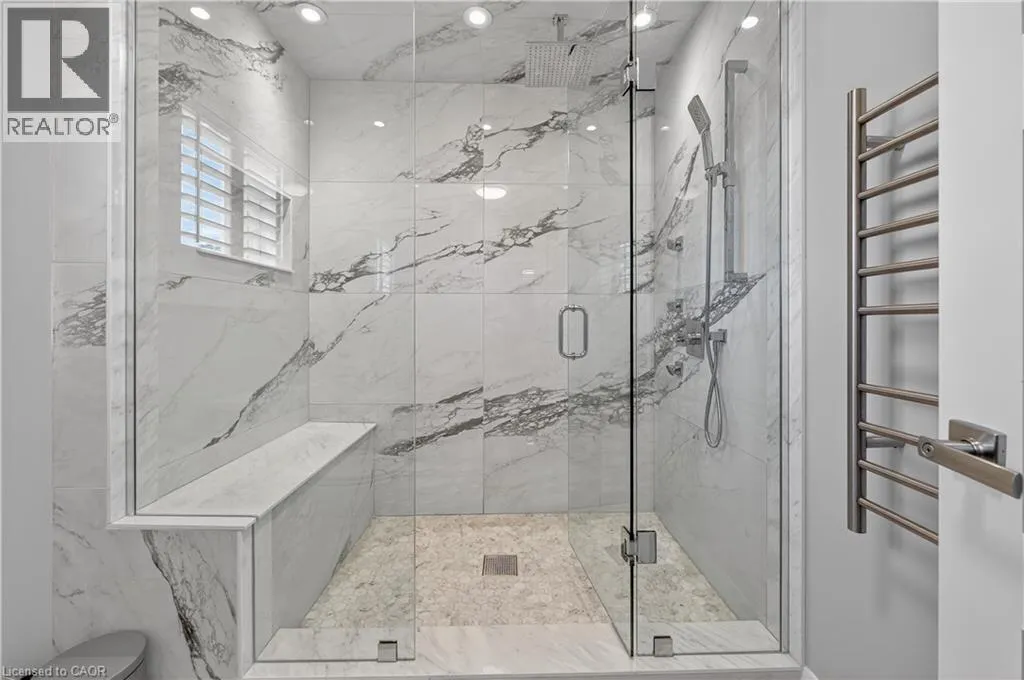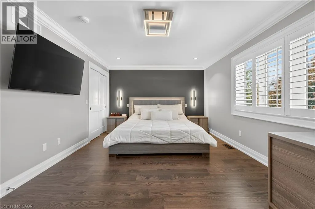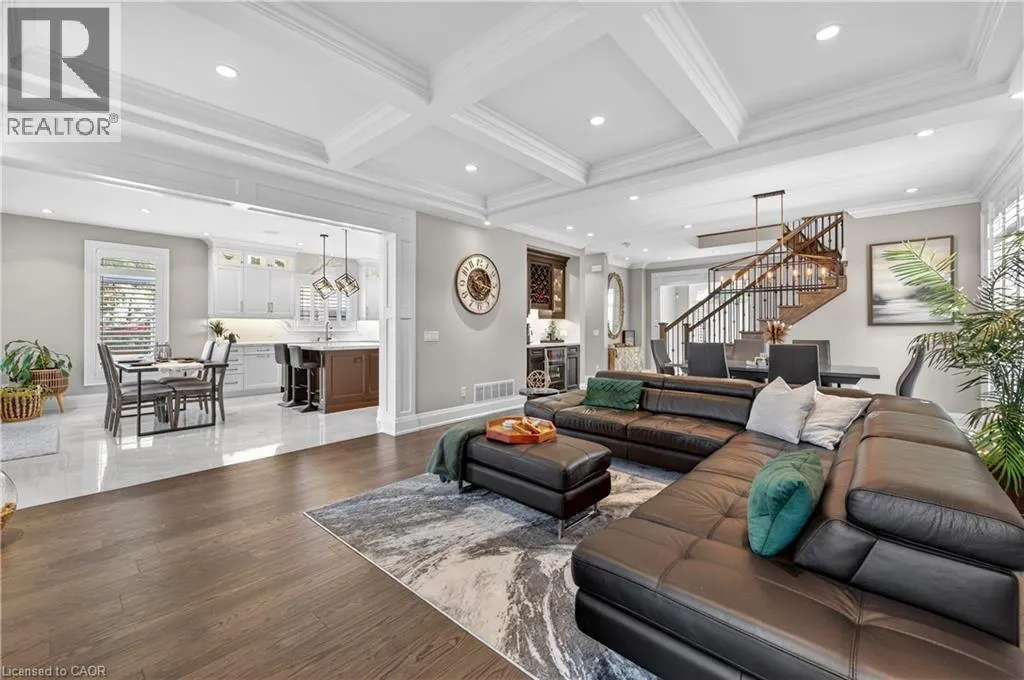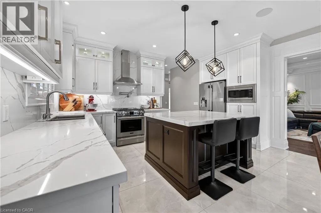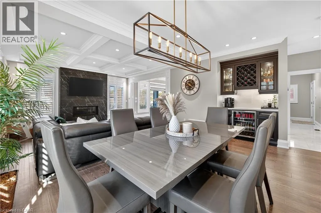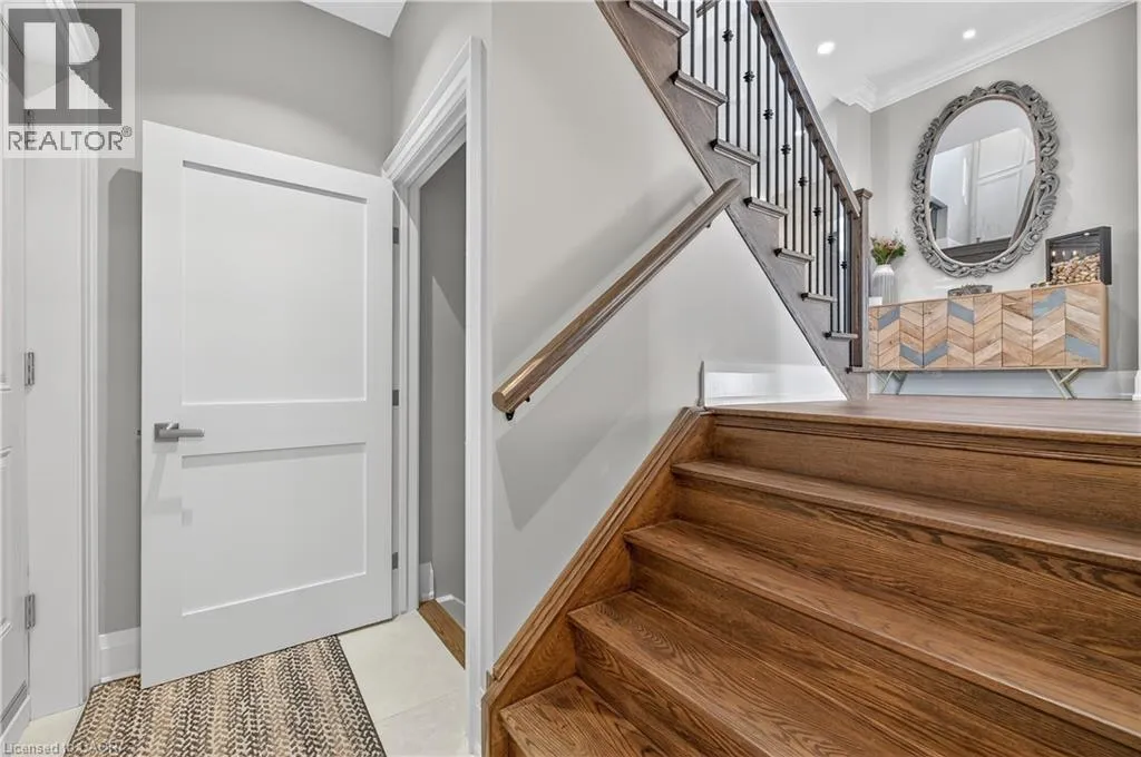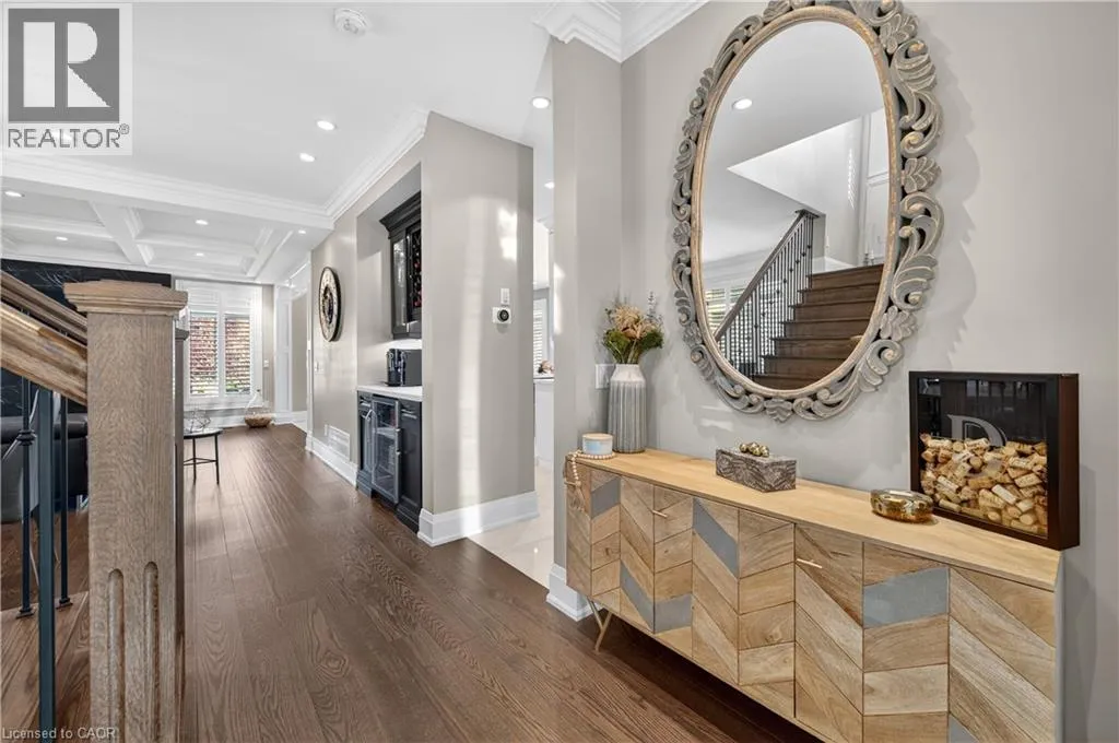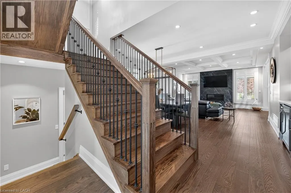 Upper Wellington & Fennell Prepare to be impressed by this meticulously crafted, fully custom 3-bedroom, 2.5-bathroom residence offering 2,531 sq ft of luxurious living on a generous 50x108 ft lot. From the moment you arrive, the homeâs full brick and stone façade, arched windows, and covered porch speak to the quality and pride of ownership throughout. Inside, every detail is elevated â engineered hardwood and porcelain tile span the entire home. Solid wood interior doors, coffered ceilings, pot lights (including on all 4 sides of the homeâs exterior), and crown moulding define each space with sophistication. The kitchen is an entertainerâs dream, complete with custom cabinetry, quartz countertops, high-end appliances, in-ceiling speakers, and a spacious island. It opens effortlessly to a dining area and large living room anchored by a floor-to-ceiling stone gas fireplace and built-in wet bar. The primary suite is a sanctuary, offering a large walk-in closet with custom cabinetry and a dedicated makeup station. The ensuite bath includes a double vanity, quartz countertops, and a private water closet. Upstairs bathrooms also feature quartz surfaces and private toilet rooms for added convenience. A wide staircase enhances flow, and thoughtful extras include central vac with in-wall hose systems on every level, closet lighting throughout, and California shutters. Step outside to a covered back porch and fully fenced backyard where freshly planted cedars promise enhanced privacy in the seasons to come. The unfinished basement â with its own private side entrance and insulated subfloor â offers endless possibilities. With a double-car garage and four-car driveway, this property checks every box for luxury, comfort, and long-term livability. (id:27476)