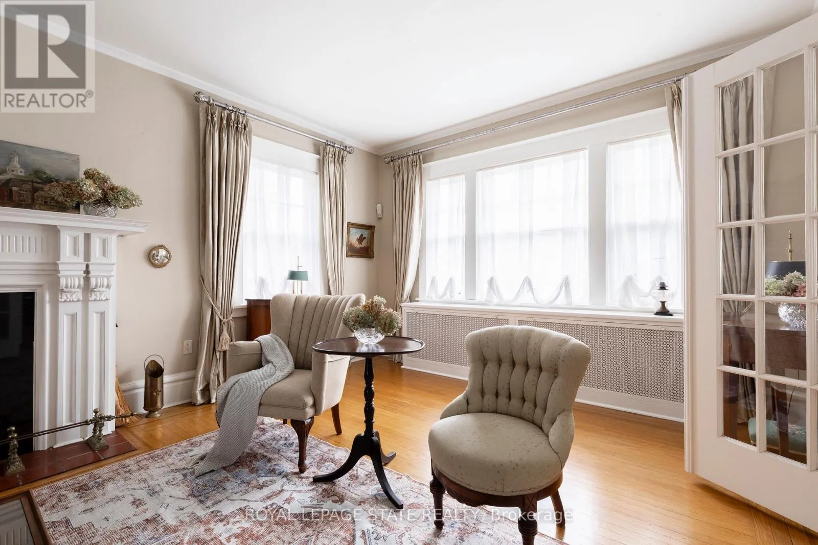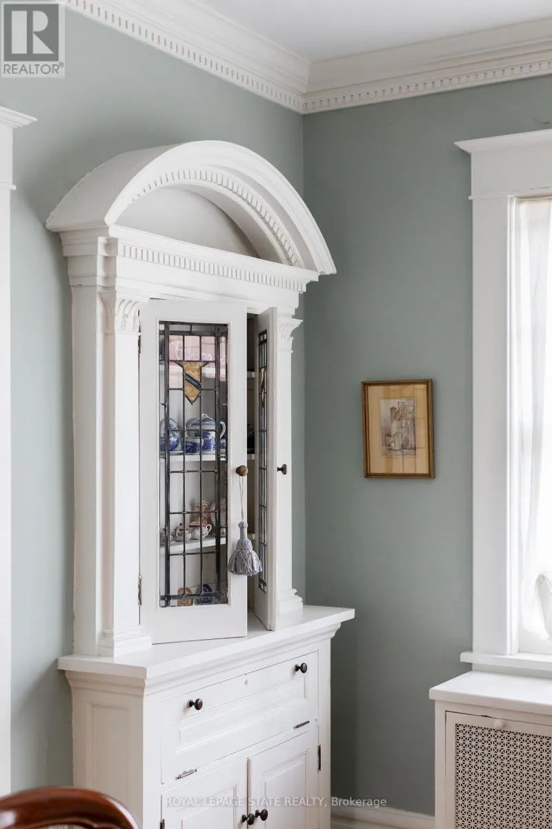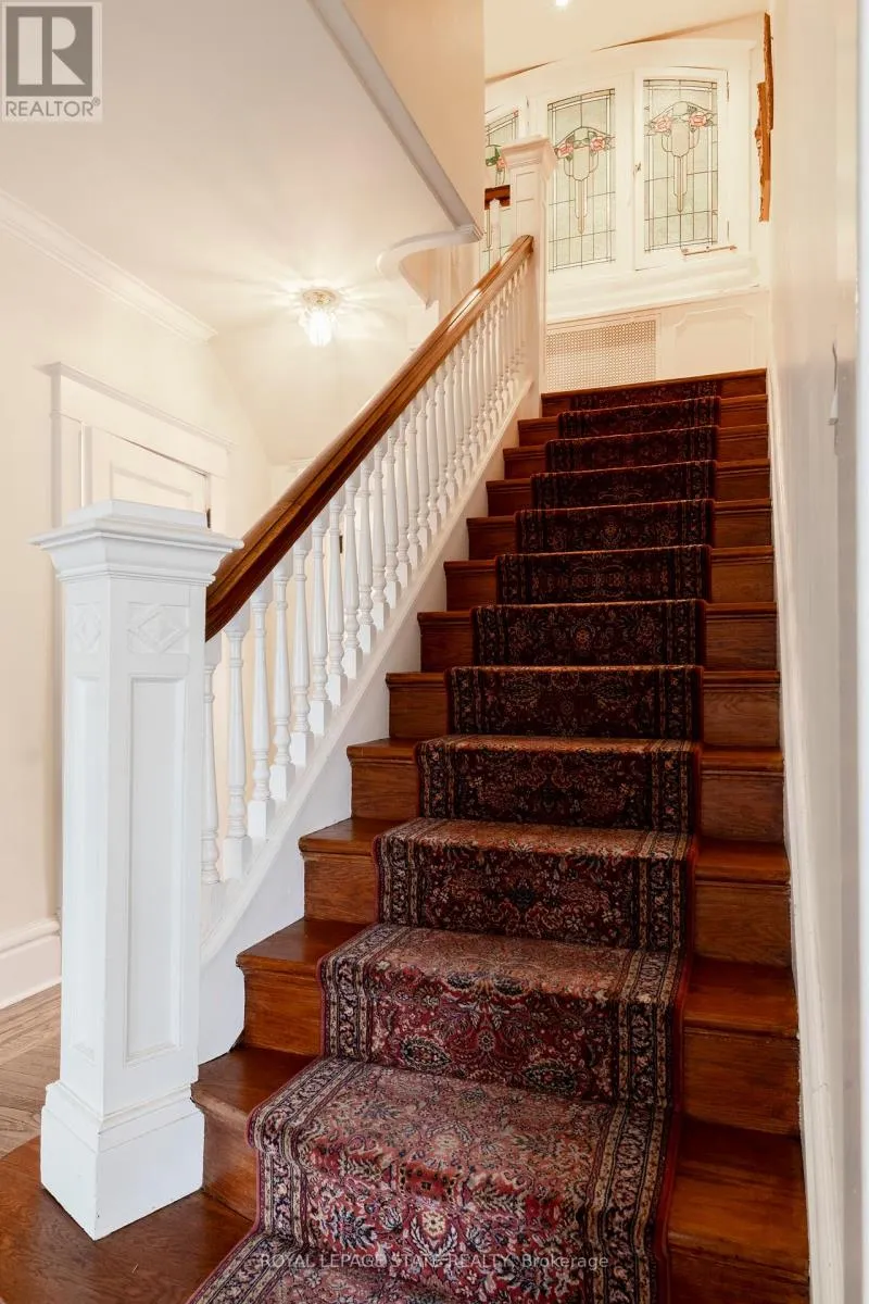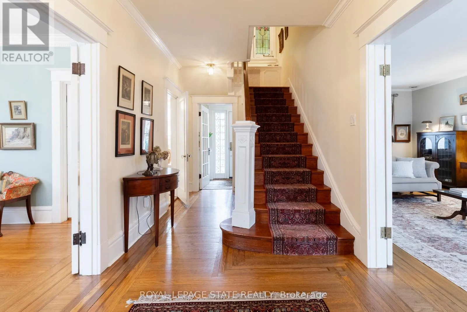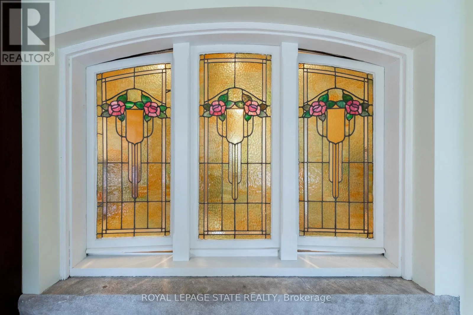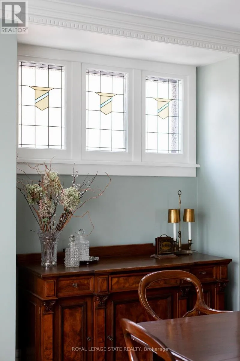 Cross Streets: Markland Street. ** Directions: From James S/Markland, W on Markland, N on MacNab S. This stately 2.5-stry residence sits on a mature 46' x 85.33' lot in Hamilton's prestigious Durand neighbourhood. Showcasing timeless curb appeal, the front walkway leads to a covered porch framed by Doric columns & an entry door w/ wrought-iron grillwork. Inside, a grand foyer w/ crown moulding, a sweeping staircase & French doors introduces elegant principal rms. The formal liv rm feat a gas FP, an intricate mantle w/ hidden side cabinet, & windows overlooking both gardens. The adjoining din rm impresses w/ built-in cabinetry, leaded stained glass, and rich millwork throughout. The kitchen is a showpiece, featuring heated limestone floors, custom cabinetry w/ beveled glass, marble counters, under-cab lighting, pantry, & premium S/S appliances incl a Viking gas range, Sub-Zero fridge, & Miele d/w. Surrounded by windows, it opens to a covered porch w/ a Phantom screen, perfect for indoor-outdoor living. A handy mudroom w/ dbl mirrored closet completes the main lvl. Heading up the main staircase, a landing of stained glass welcomes you to the 2nd level, feat a 25.9' x 13' primary suite w/ sitting area, dual closets, & access to a bright den/sunroom (heated flrs). 2 add'l bdrms - one w/ a bay window & ensuite, the other with garden views - plus a 4-pc bath w/ a jetted tub, stained glass, & hand-painted murals complete this lvl. The 3rd lvl offers a private bdrm retreat w/ a 3-pc ensuite, skylights, gas FP, storage, & cozy sitting nooks. The lower lvl adds laundry w/ custom cabinetry, a 2-pc bath, storage & workshop space. Outside, enjoy a private yard w/ a fountain, covered composite porch, retractable awning, gas BBQ hookup, detached garage + surfaced parking for 2 & security lighting. Add feat incl: hardwood flrs, custom window coverings, c/air, HEPA air purifier, a security sys & more. Walkable to the Locke St cafés, boutiques, art galleries, hospitals, GO Transit, parks & trails - Durand offers historic character & an unmatched lifestyle of quiet sophistication. (id:27476)