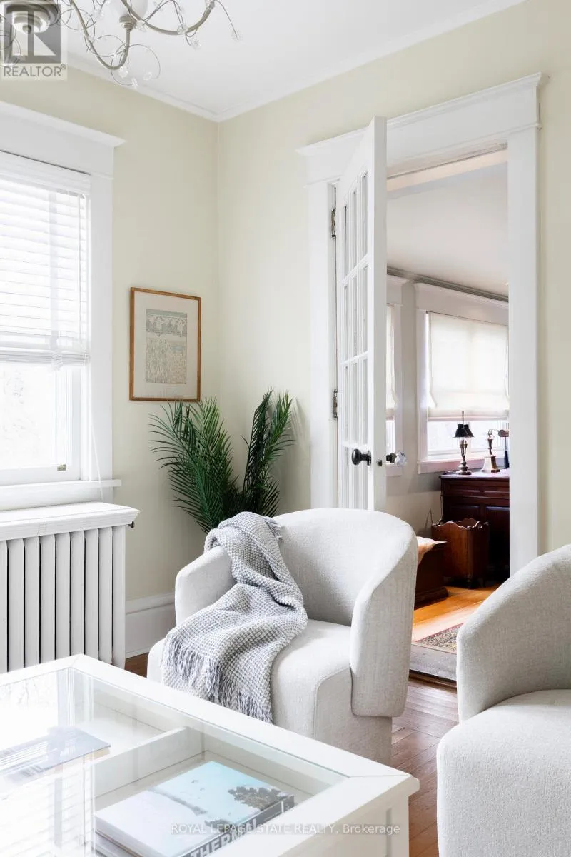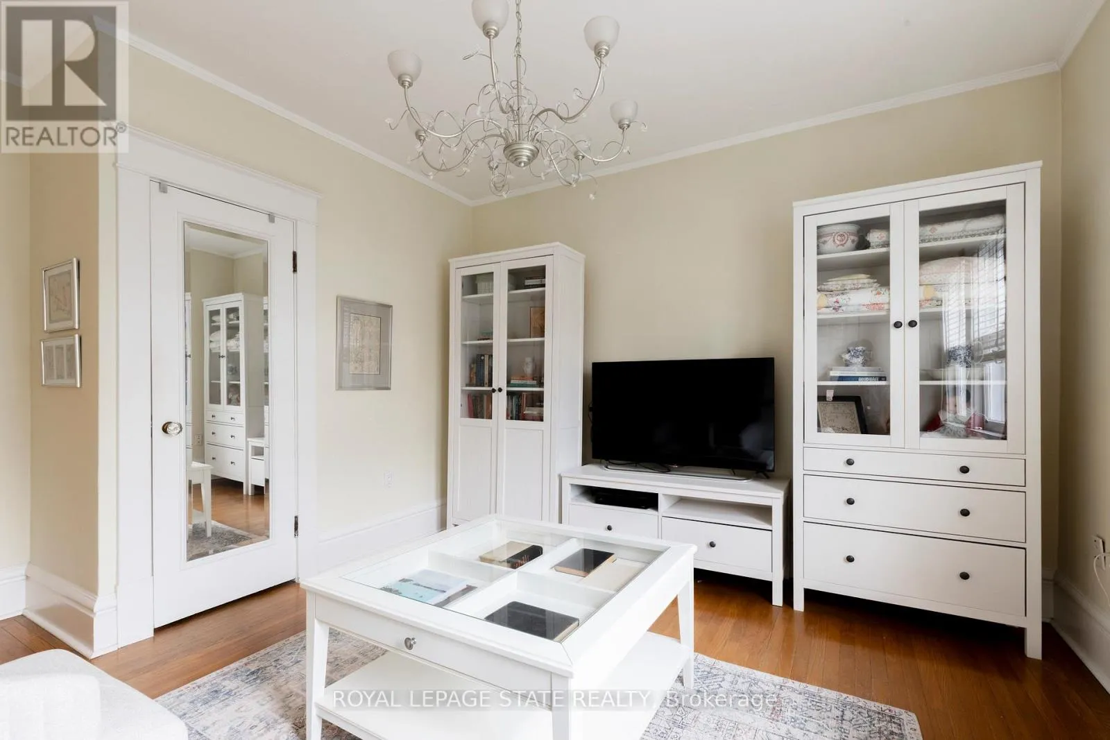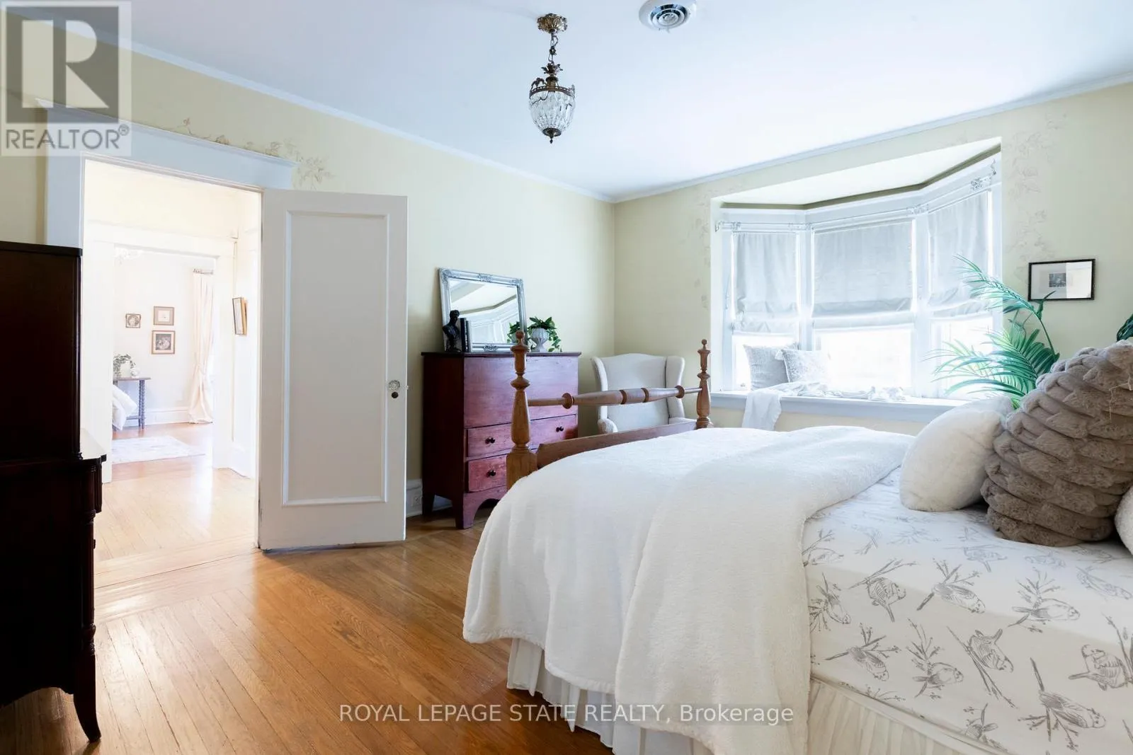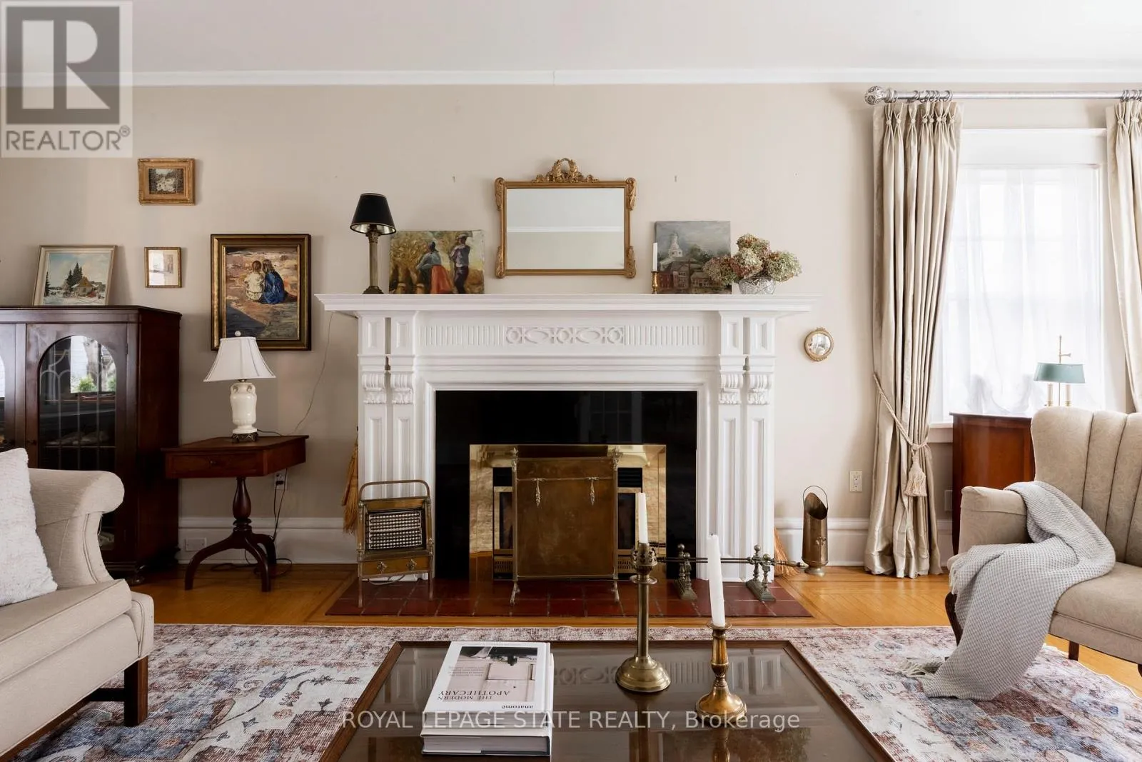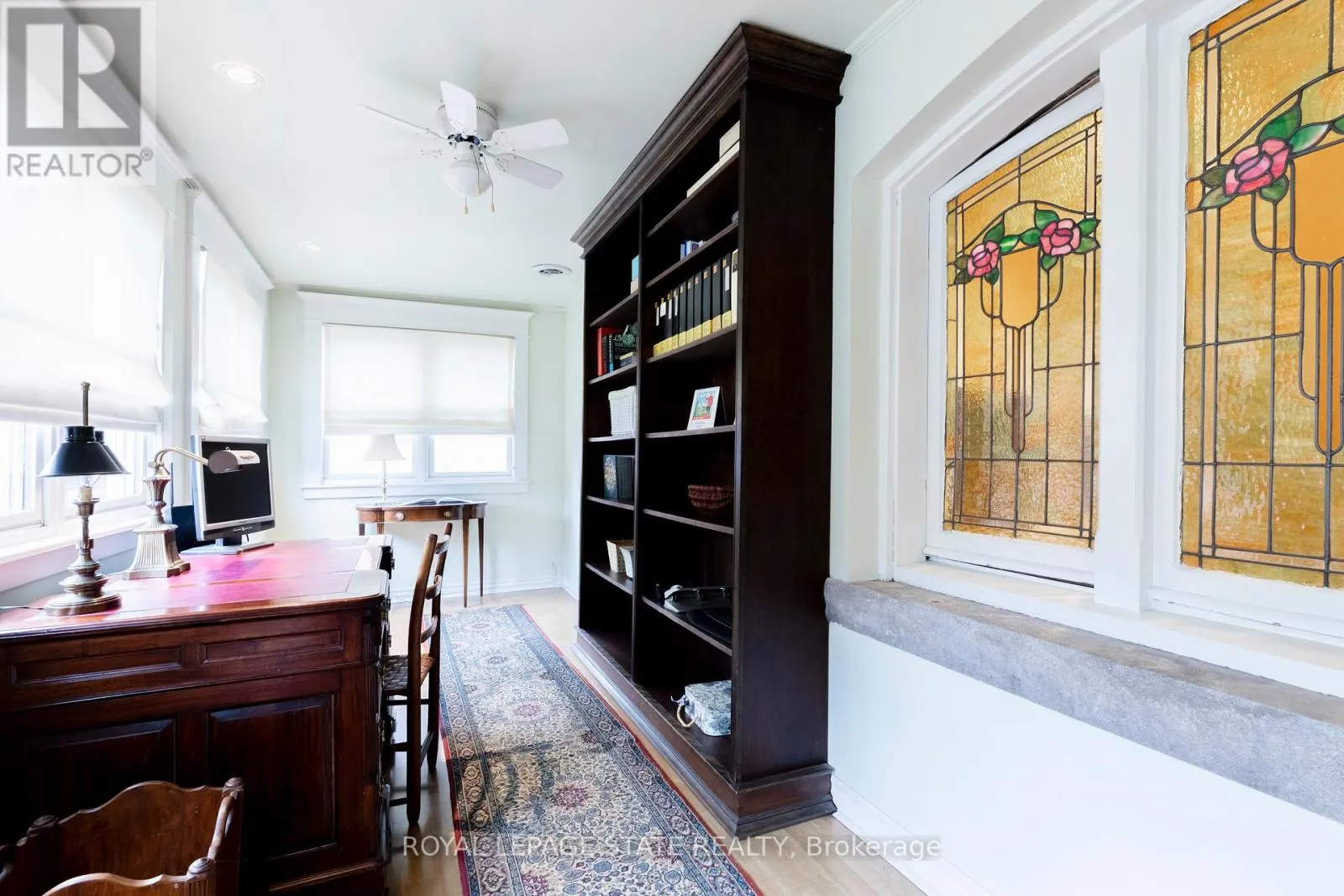 Cross Streets: Markland Street. ** Directions: From James S/Markland, W on Markland, N on MacNab S. This stately 2.5-stry residence sits on a mature 46' x 85.33' lot in Hamilton's prestigious Durand neighbourhood. Showcasing timeless curb appeal, the front walkway leads to a covered porch framed by Doric columns & an entry door w/ wrought-iron grillwork. Inside, a grand foyer w/ crown moulding, a sweeping staircase & French doors introduces elegant principal rms. The formal liv rm feat a gas FP, an intricate mantle w/ hidden side cabinet, & windows overlooking both gardens. The adjoining din rm impresses w/ built-in cabinetry, leaded stained glass, and rich millwork throughout. The kitchen is a showpiece, featuring heated limestone floors, custom cabinetry w/ beveled glass, marble counters, under-cab lighting, pantry, & premium S/S appliances incl a Viking gas range, Sub-Zero fridge, & Miele d/w. Surrounded by windows, it opens to a covered porch w/ a Phantom screen, perfect for indoor-outdoor living. A handy mudroom w/ dbl mirrored closet completes the main lvl. Heading up the main staircase, a landing of stained glass welcomes you to the 2nd level, feat a 25.9' x 13' primary suite w/ sitting area, dual closets, & access to a bright den/sunroom (heated flrs). 2 add'l bdrms - one w/ a bay window & ensuite, the other with garden views - plus a 4-pc bath w/ a jetted tub, stained glass, & hand-painted murals complete this lvl. The 3rd lvl offers a private bdrm retreat w/ a 3-pc ensuite, skylights, gas FP, storage, & cozy sitting nooks. The lower lvl adds laundry w/ custom cabinetry, a 2-pc bath, storage & workshop space. Outside, enjoy a private yard w/ a fountain, covered composite porch, retractable awning, gas BBQ hookup, detached garage + surfaced parking for 2 & security lighting. Add feat incl: hardwood flrs, custom window coverings, c/air, HEPA air purifier, a security sys & more. Walkable to the Locke St cafés, boutiques, art galleries, hospitals, GO Transit, parks & trails - Durand offers historic character & an unmatched lifestyle of quiet sophistication. (id:27476)
