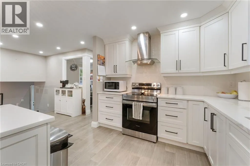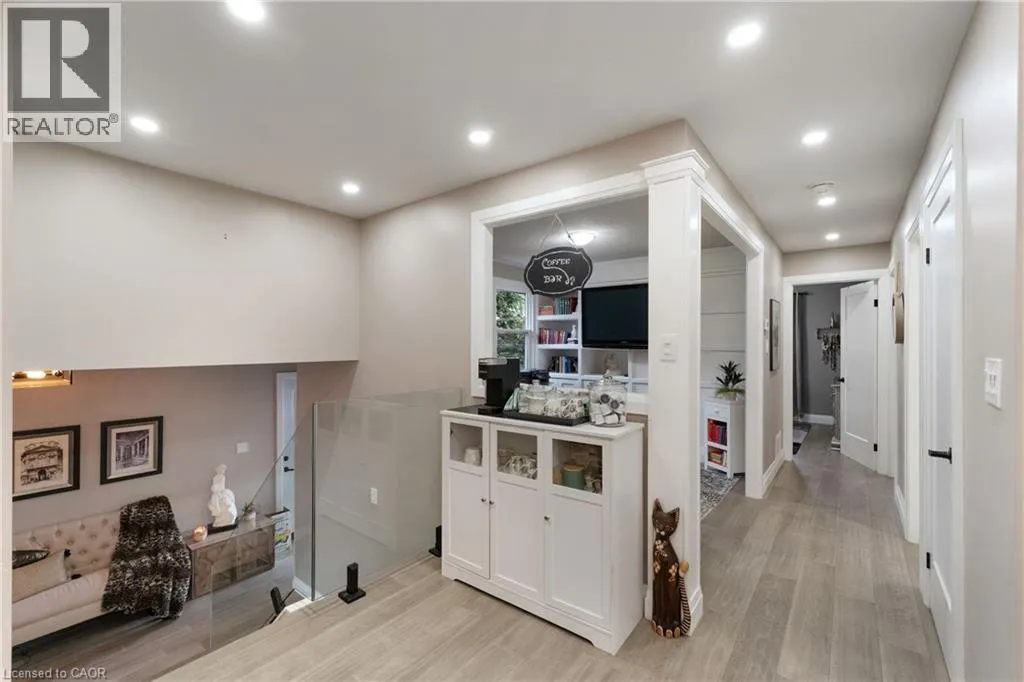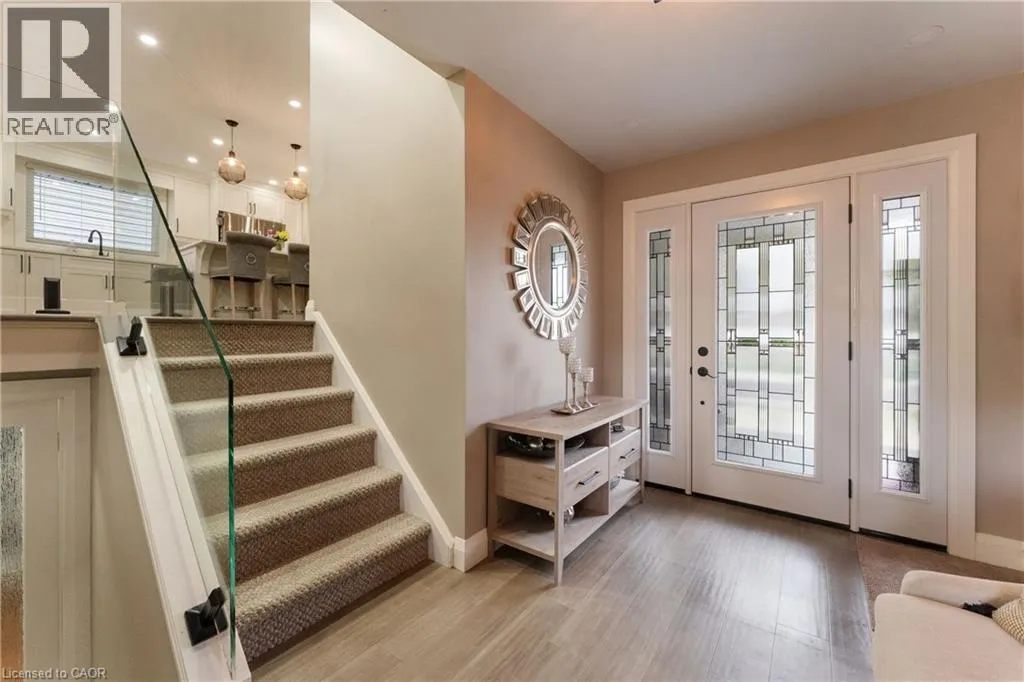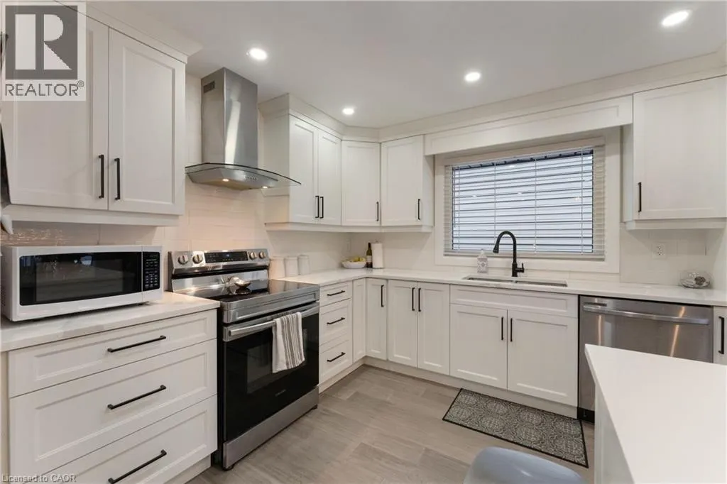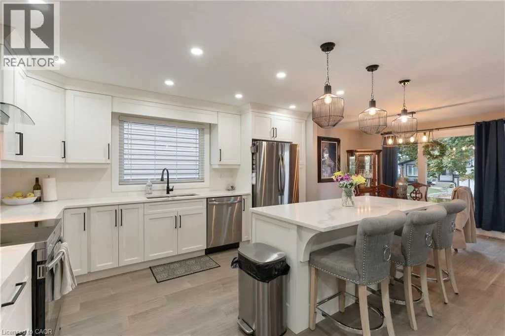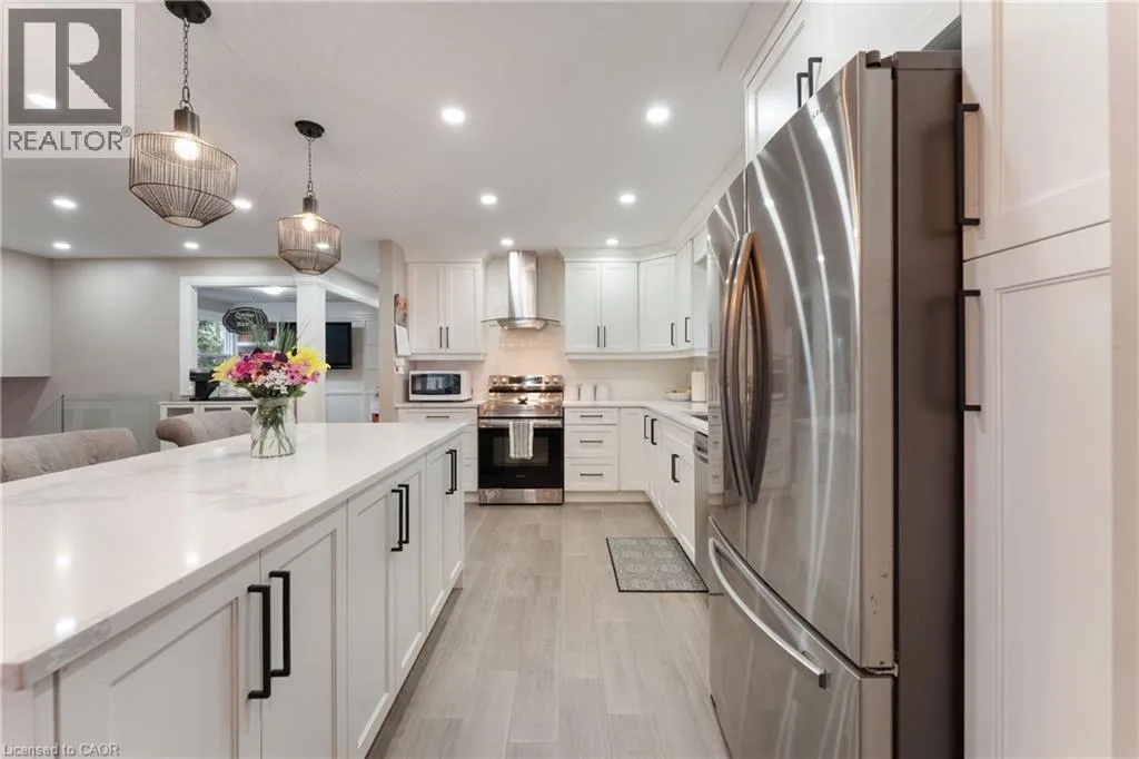 Greenhill to Bunkerhill to Hanover Pl Bright, well-appointed raised-ranch bungalow in the heart of the Gershome neighbourhood, offering an exceptional turnkey living opportunity. The home features a fully self-contained in-law suite with its own walk-out entrance, perfect for multi-generational living. Both levels showcase custom kitchens with quartz counters, stainless appliances, ample storage and stylish finishes. The main level greets you with engineered hardwood, pot lights, crisp trim, and a seamless flow from living to dining to kitchen. The main floor den could easily revert back to a third bedroom. Two designer bathrooms (one on each level) feature custom vanities and modern fixtures. In the lower level, the in-law space includes its own laundry and living areas, giving total autonomy to residents. Many systems and finishes have been renewed: high-efficiency furnace, AC, windows, exterior roof, fascia, eavestrough, insulated garage door, new front entry door, updated doors/trim/hardware throughout, and repointed/epoxy coated foundation steps. The yard is a private oasis with a steel-roofed gazebo, custom luxury playhouse, inground sprinkler, exposed-aggregate patio, gas BBQ hookup, and new fencing. Situated in Gershome, youâll enjoy proximity to schools, parks, transit, and quick access to the Red Hill Valley Parkway. Summers can be spent golfing at nearby Glendale Golf & Country Club, or hiking the trails and escarpment. This home is truly move-in ready and versatile. (id:27476)