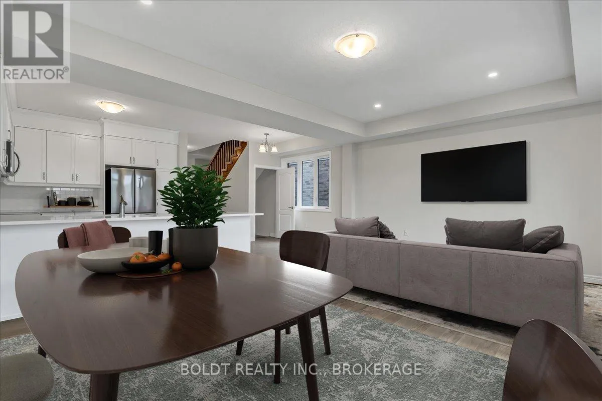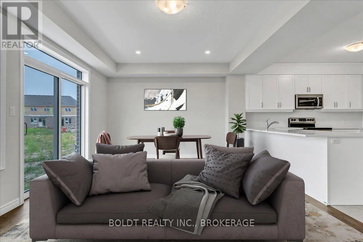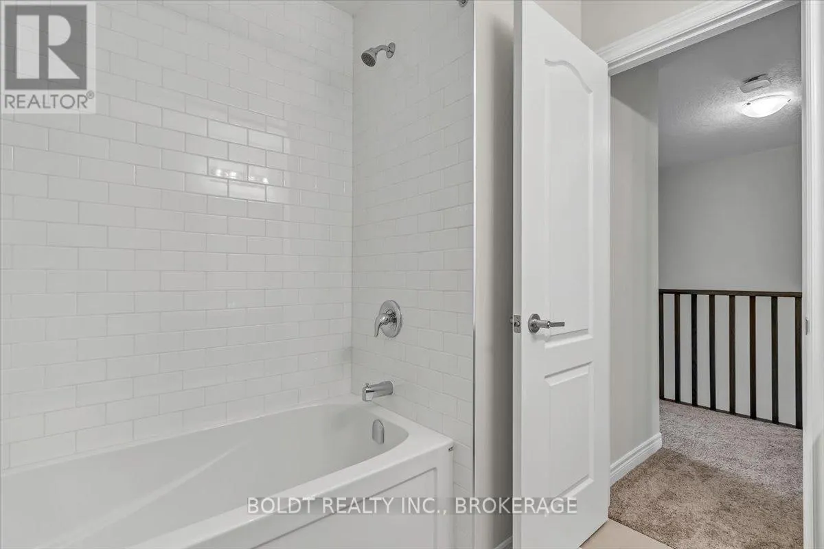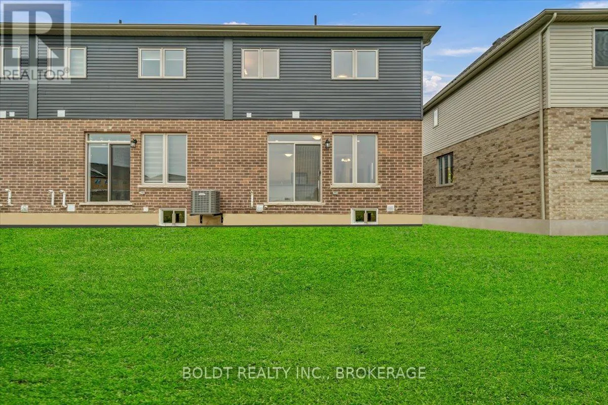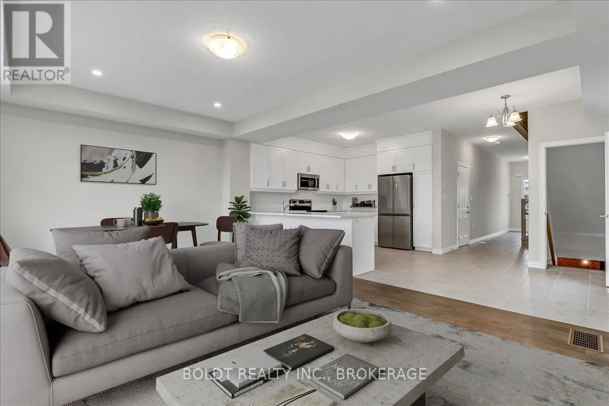 Cross Streets: Tanglewood Dr/Maggie Johnson. ** Directions: Turn left on Tanglewood drive from Maggie Johnson Drive. We are pleased to introduce to you this two year old luxury townhome built by John Bruce Robinson. This end unit 3 bedroom townhome is perfectly located on Tanglewood Drive with existing homes. As you approach this home you are presented with a modern exterior design featuring brick, stone, and vinyl siding. Covered porch to enjoy your morning coffee. The driveway allows for two parking spots and is not shared with an adjacent home. As you enter the home you are presented with a spacious foyer and 2-piece bathroom. Staircase perfectly located with oak railing and wide hallway leading to your open concept living space. The kitchen has many upgrades which includes stainless-steel appliances, cabinets finished to the ceiling with elegant crown moulding, plenty of cabinet space, upgraded quarts countertop with tile backsplash, breakfast bar with ample amount of space for your family to use in the busy mornings. The living room features engineering hardwood floors that are ready to be designed and furnished to your liking with sliding doors leading to the backyard and large windows giving the space plenty of natural light. On the second level you are presented with a spacious primary bedroom which features a large bathroom with his & hers sink, stand-up shower & glass door, and large walk-in closet. The main 4-piece bathroom features tile flooring and surrounding the tub. The other two bedrooms have plenty of space for your family. The walk-in laundry room has closed in tile floor & drain for the washer & dryer for ease of mind. The basement layout allows for easy separation of utility room and open space to be finished to your liking. Walking distance to all the amenities you need and easy access to regional road 56. Book your private showing today! (id:27476)