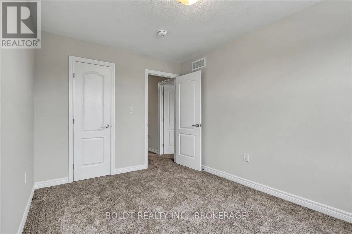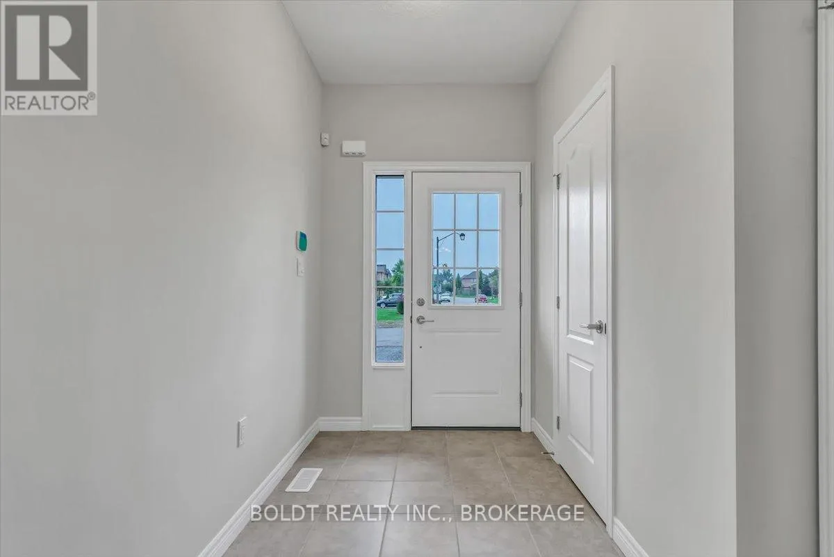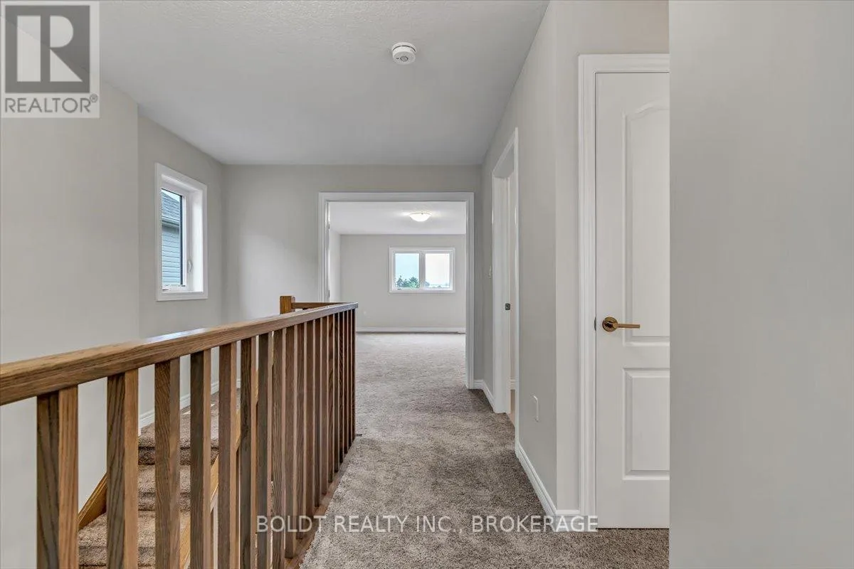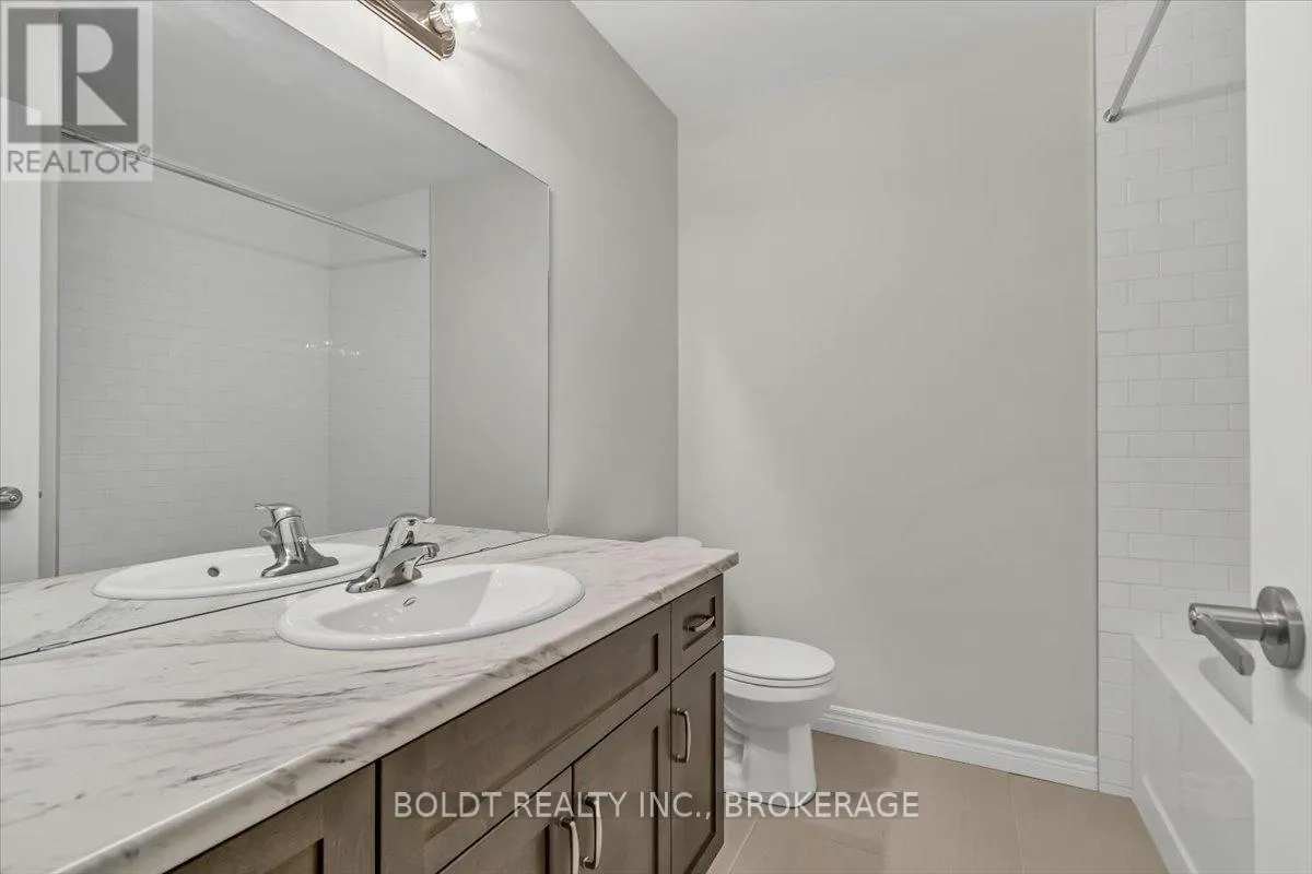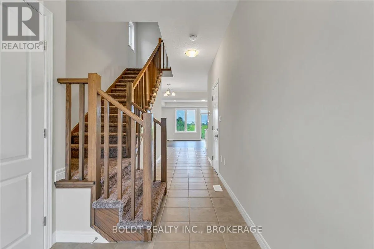 Cross Streets: Tanglewood Dr/Maggie Johnson. ** Directions: Turn left on Tanglewood drive from Maggie Johnson Drive. We are pleased to introduce to you this two year old luxury townhome built by John Bruce Robinson. This end unit 3 bedroom townhome is perfectly located on Tanglewood Drive with existing homes. As you approach this home you are presented with a modern exterior design featuring brick, stone, and vinyl siding. Covered porch to enjoy your morning coffee. The driveway allows for two parking spots and is not shared with an adjacent home. As you enter the home you are presented with a spacious foyer and 2-piece bathroom. Staircase perfectly located with oak railing and wide hallway leading to your open concept living space. The kitchen has many upgrades which includes stainless-steel appliances, cabinets finished to the ceiling with elegant crown moulding, plenty of cabinet space, upgraded quarts countertop with tile backsplash, breakfast bar with ample amount of space for your family to use in the busy mornings. The living room features engineering hardwood floors that are ready to be designed and furnished to your liking with sliding doors leading to the backyard and large windows giving the space plenty of natural light. On the second level you are presented with a spacious primary bedroom which features a large bathroom with his & hers sink, stand-up shower & glass door, and large walk-in closet. The main 4-piece bathroom features tile flooring and surrounding the tub. The other two bedrooms have plenty of space for your family. The walk-in laundry room has closed in tile floor & drain for the washer & dryer for ease of mind. The basement layout allows for easy separation of utility room and open space to be finished to your liking. Walking distance to all the amenities you need and easy access to regional road 56. Book your private showing today! (id:27476)
