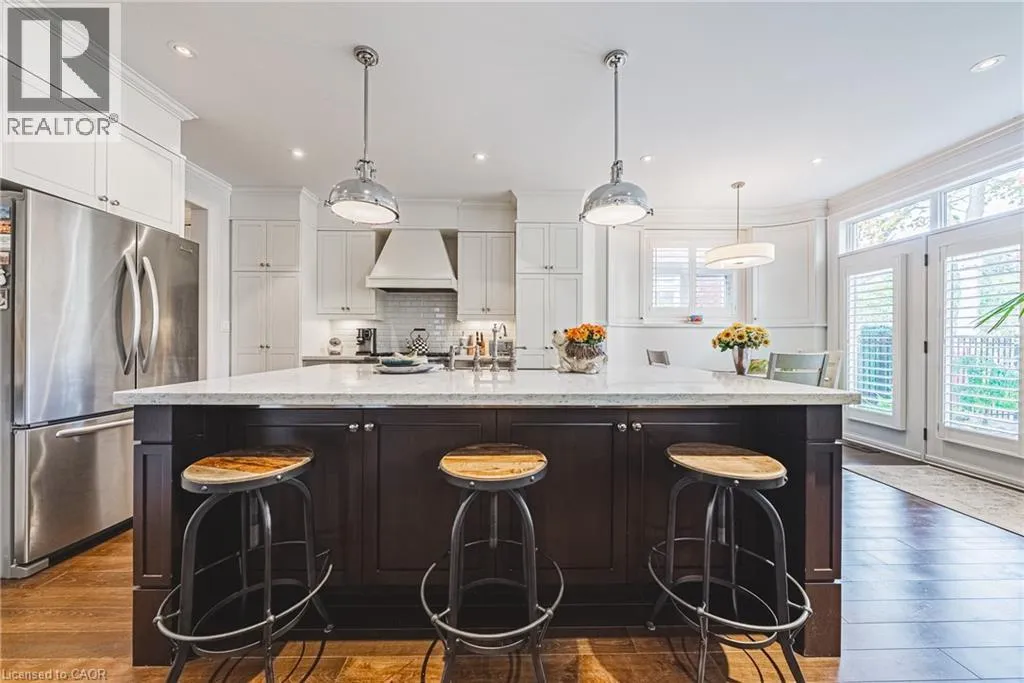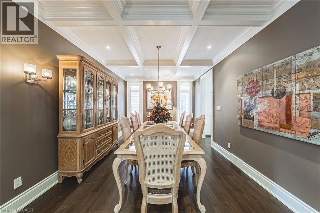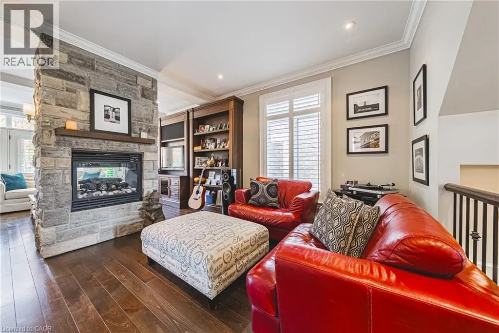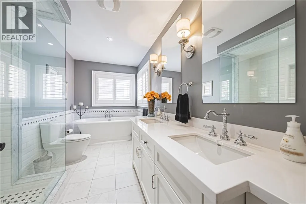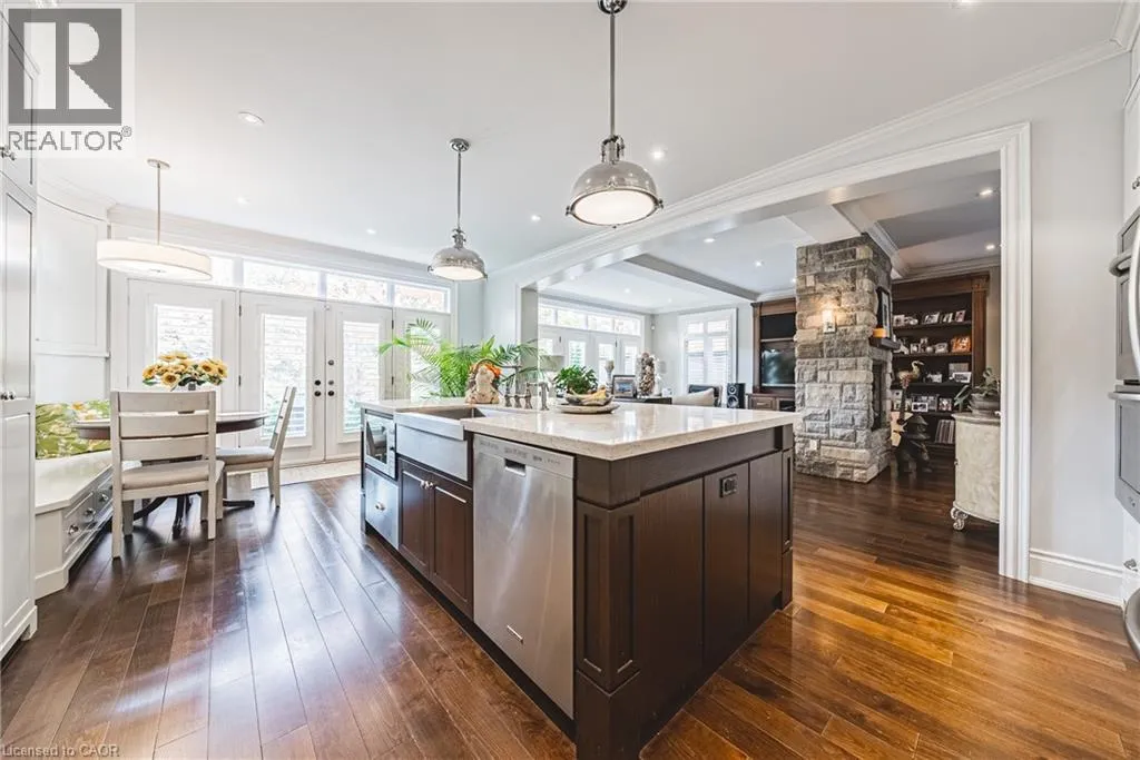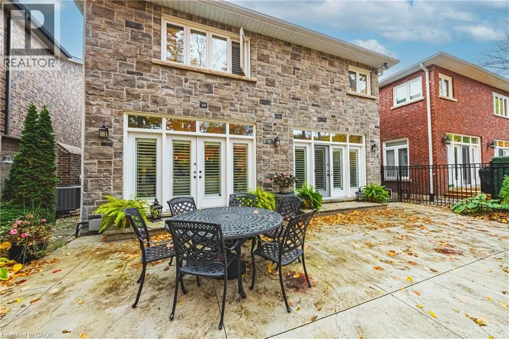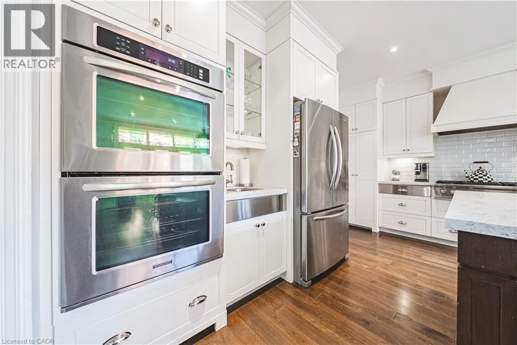 Sydenham St to Alma St Situated in prestigious Olde Dundas on a private ravine lot with panoramic views of Sydenham Creek and the surrounding conservation, this solid-stone Neven-built residence combines timeless craftsmanship with refined luxury. Inside, smooth 10-foot coffered ceilings, intricate custom millwork, and hardwood floors flow through the open-concept design. The chefâs kitchen, featuring a gas Viking stove with built-in ovens, anchors the main level and opens to elegant living and dining spaces framed by oversized windows overlooking the forest. Upstairs, two primary suites each offer a spa-inspired ensuite and walk-in closet, ideal for extended family or guests. A dumbwaiter provides seamless service between levels, while thoughtful finishes such as a heated double garage and concrete driveway, backyard walkway, and rear patio reflect quality and durability throughout. The fully finished lower level includes a bedroom, full bath, recreation area, and separate access, perfect for guests, in-laws, or a future suite. Set on a quiet cul-de-sac, just moments from trails, top-rated schools, and the historic charm of downtown Dundas. (id:27476)