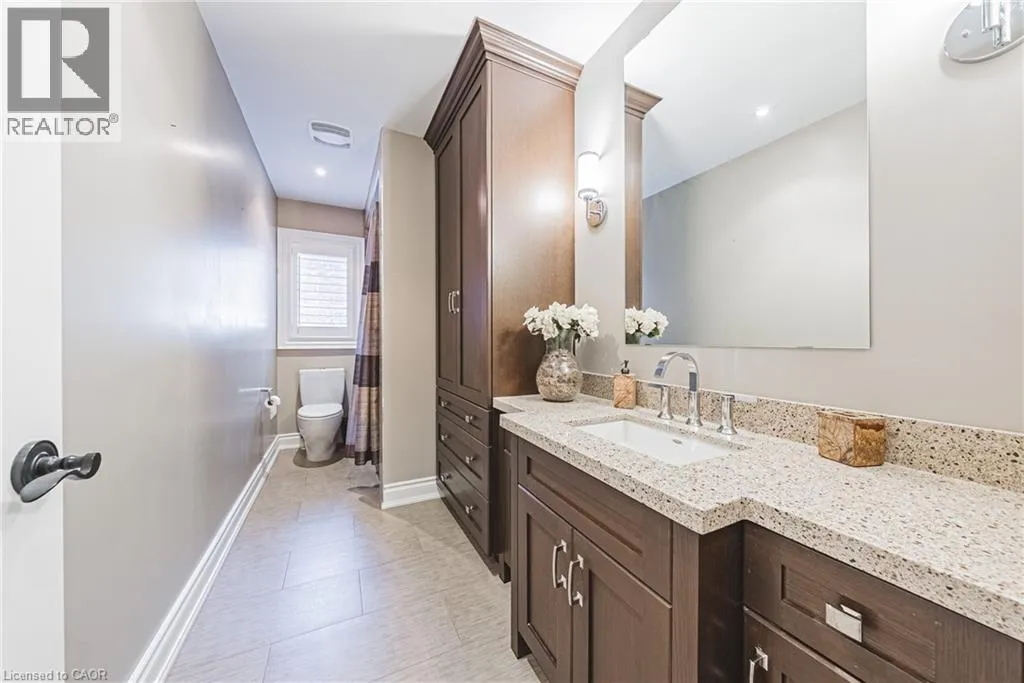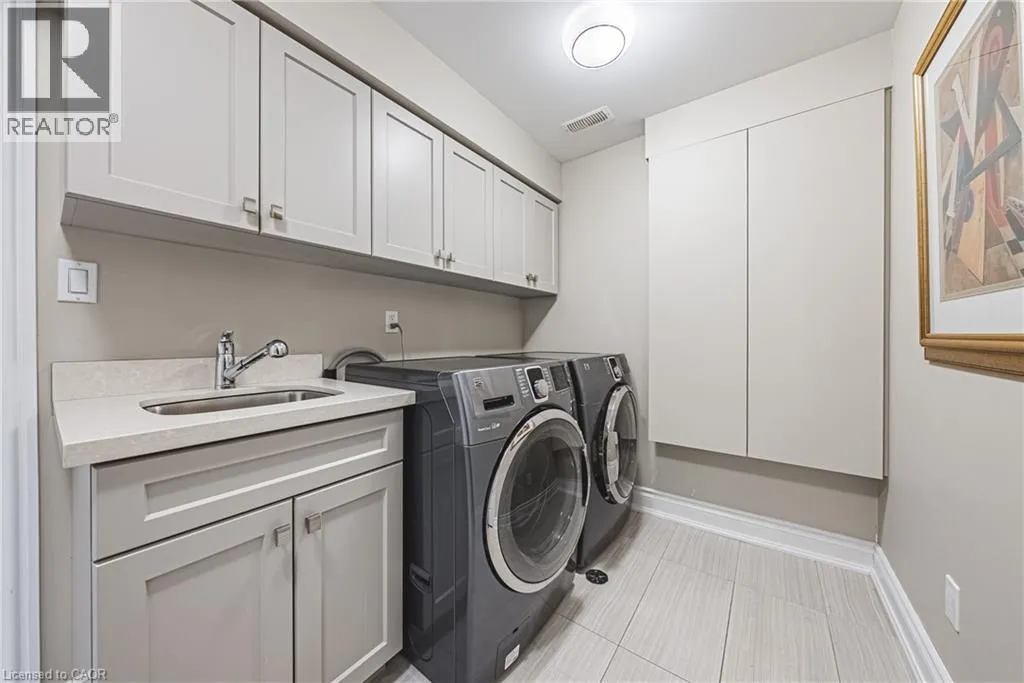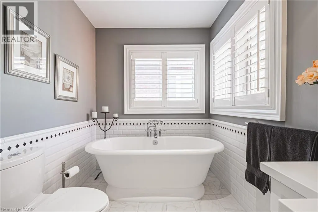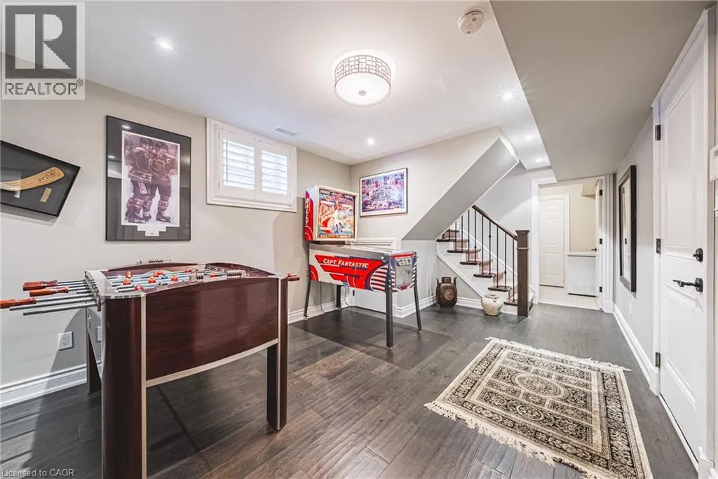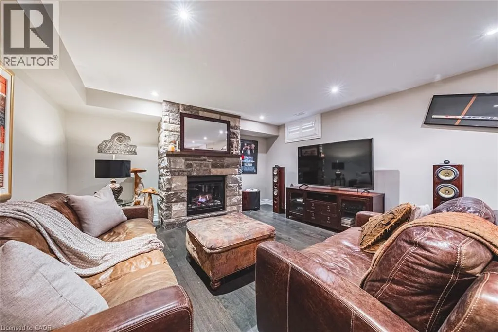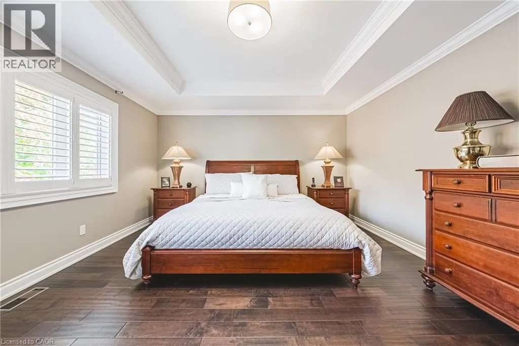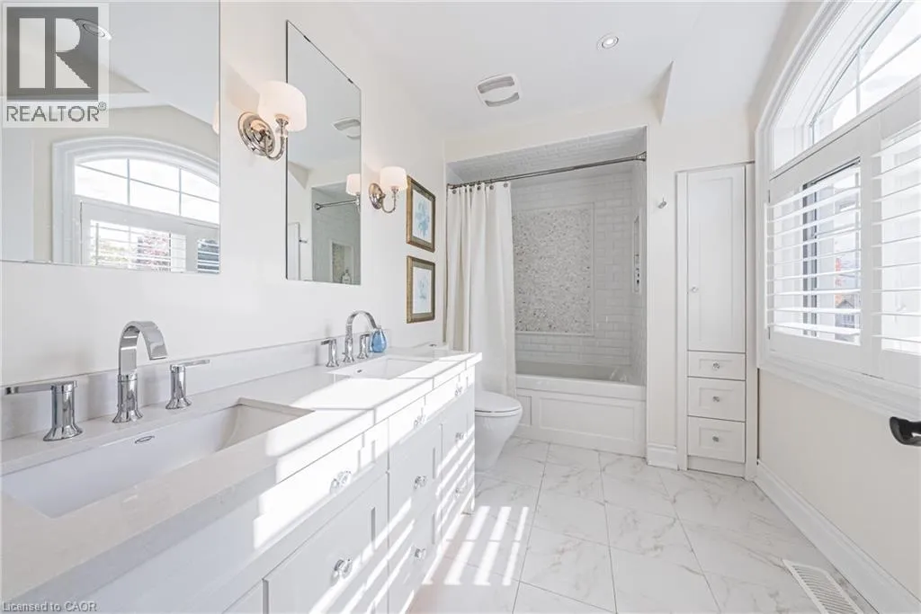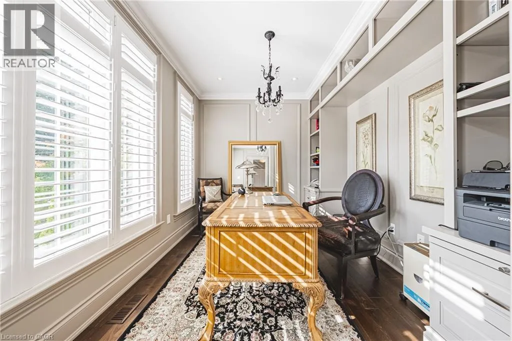 Sydenham St to Alma St Situated in prestigious Olde Dundas on a private ravine lot with panoramic views of Sydenham Creek and the surrounding conservation, this solid-stone Neven-built residence combines timeless craftsmanship with refined luxury. Inside, smooth 10-foot coffered ceilings, intricate custom millwork, and hardwood floors flow through the open-concept design. The chefâs kitchen, featuring a gas Viking stove with built-in ovens, anchors the main level and opens to elegant living and dining spaces framed by oversized windows overlooking the forest. Upstairs, two primary suites each offer a spa-inspired ensuite and walk-in closet, ideal for extended family or guests. A dumbwaiter provides seamless service between levels, while thoughtful finishes such as a heated double garage and concrete driveway, backyard walkway, and rear patio reflect quality and durability throughout. The fully finished lower level includes a bedroom, full bath, recreation area, and separate access, perfect for guests, in-laws, or a future suite. Set on a quiet cul-de-sac, just moments from trails, top-rated schools, and the historic charm of downtown Dundas. (id:27476)