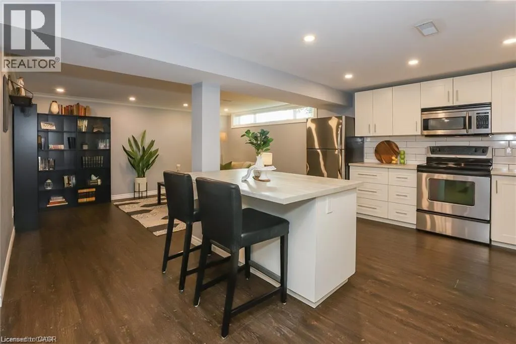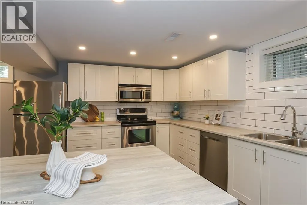 Lincoln Alexander Parkway to Mohawk Road. East on Mohawk Road. Left onto Buckingham Drive. Welcome home to this stylish 1-bedroom + den, 1-bath apartment offering comfort, convenience, and modern design. With 8-foot ceilings, pot lights throughout, and a spacious open-concept kitchen and living area, this space feels bright and inviting. The modern kitchen features stainless steel appliances, an oversized island, and plenty of room to cook and entertain. The bedroom offers generous space and a double closet for easy storage, while the den provides the perfect spot for a home office, creative studio, or possibly second bedroom. Youâll also enjoy a large 3-piece bathroom, in-suite laundry, and a small private outdoor areaâideal for relaxing after work. One driveway parking spot is included. All utilities (hydro, water, gas) are included in the rent, offering exceptional value and stress-free living. Located in a quiet, family-friendly neighbourhood just minutes from local amenities, this home is perfect for young professionals seeking style and simplicity in one convenient package. (id:27476)