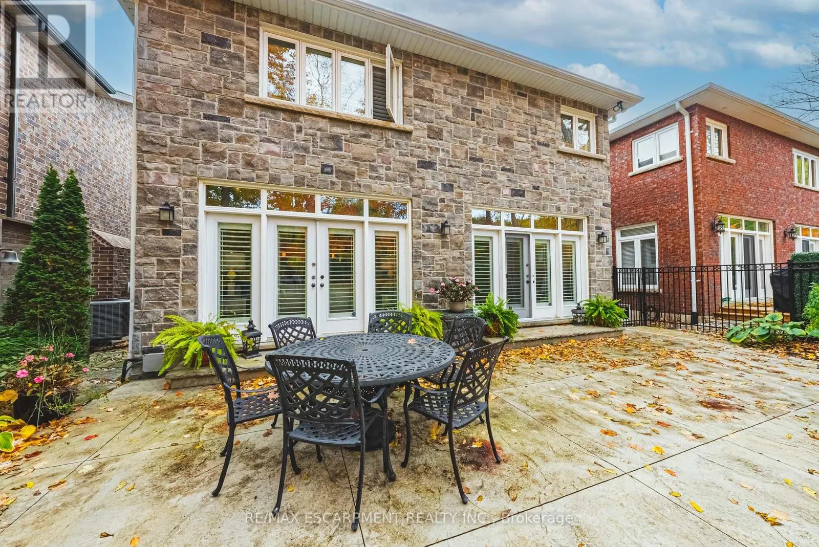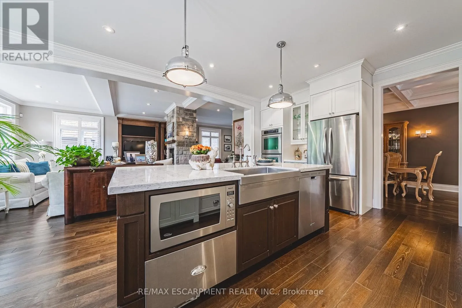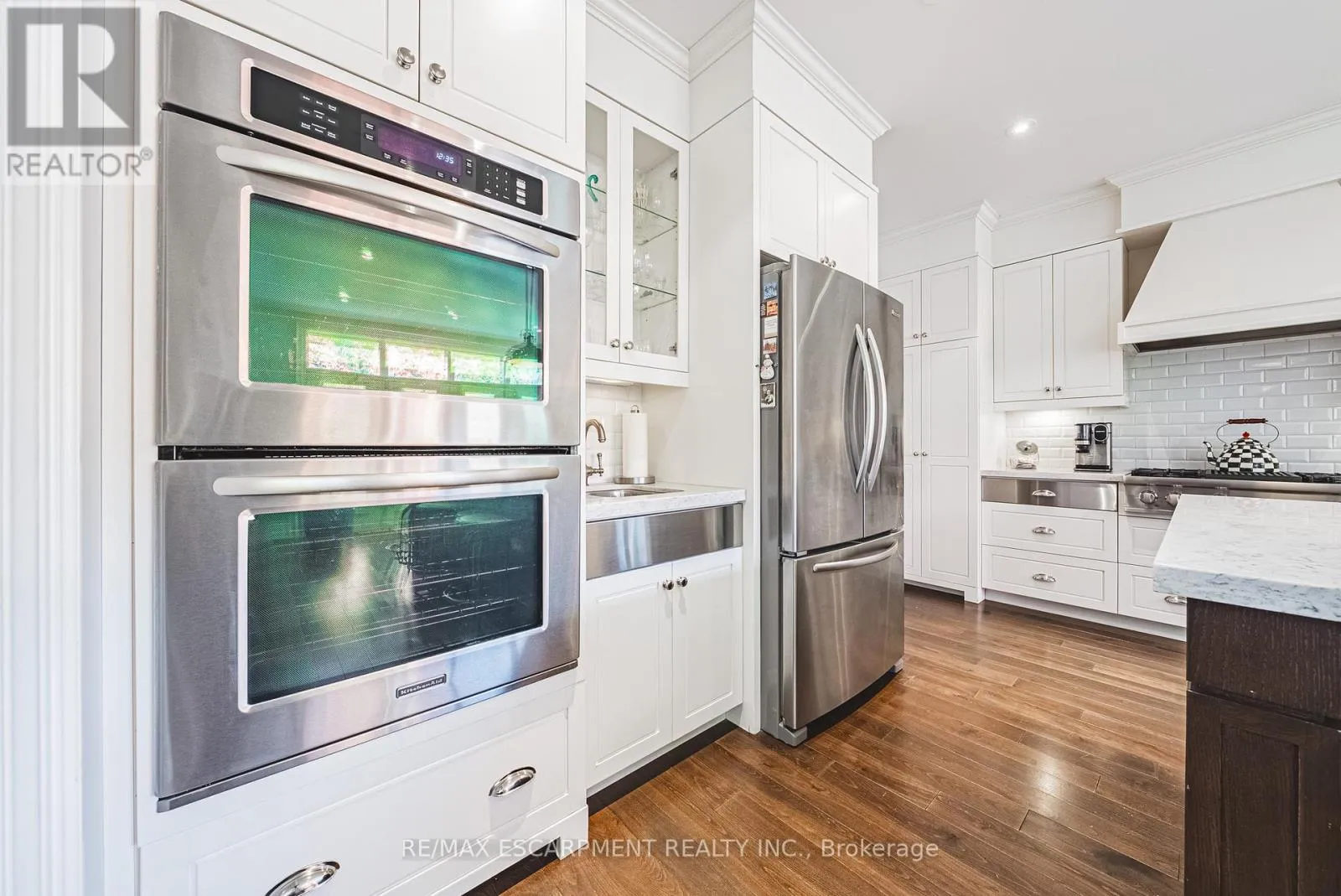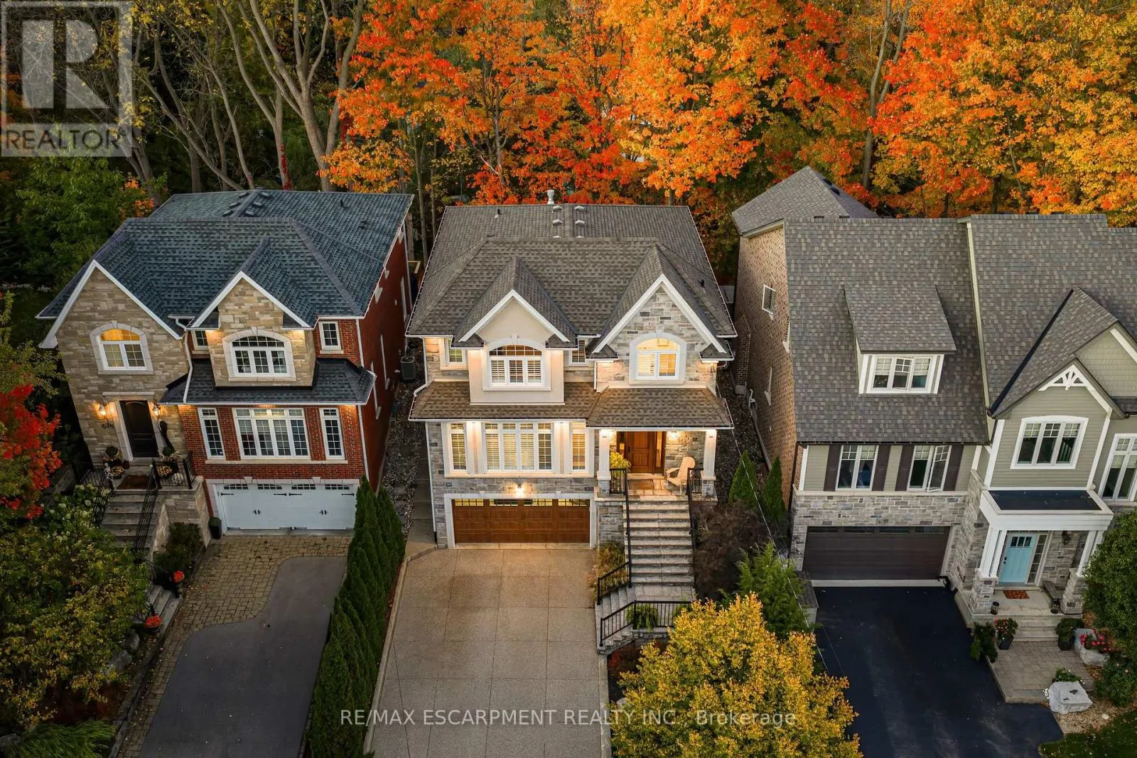 Sydenham St to Alma St Situated in prestigious Olde Dundas on a private ravine lot with panoramic views of Sydenham Creek and the surrounding conservation, this solid-stone Neven-built residence combines timeless craftsmanship with refined luxury. Inside, smooth 10-foot coffered ceilings, intricate custom millwork, and hardwood floors flow through the open-concept design. The chef's kitchen, featuring a gas Viking stove with built-in ovens, anchors the main level and opens to elegant living and dining spaces framed by oversized windows overlooking the forest. Upstairs, two primary suites each offer a spa-inspired ensuite and walk-in closet, ideal for extended family or guests. A dumbwaiter provides seamless service between levels, while thoughtful finishes such as a heated double garage and concrete driveway, backyard walkway, and rear patio reflect quality and durability throughout. The fully finished lower level includes a bedroom, full bath, recreation area, and separate access, perfect for guests, in-laws, or a future suite. Set on a quiet cul-de-sac, just moments from trails, top-rated schools, and the historic charm of downtown Dundas. (id:27476)