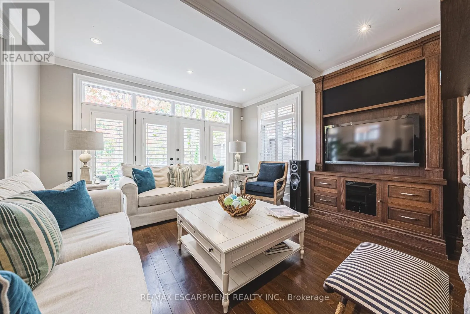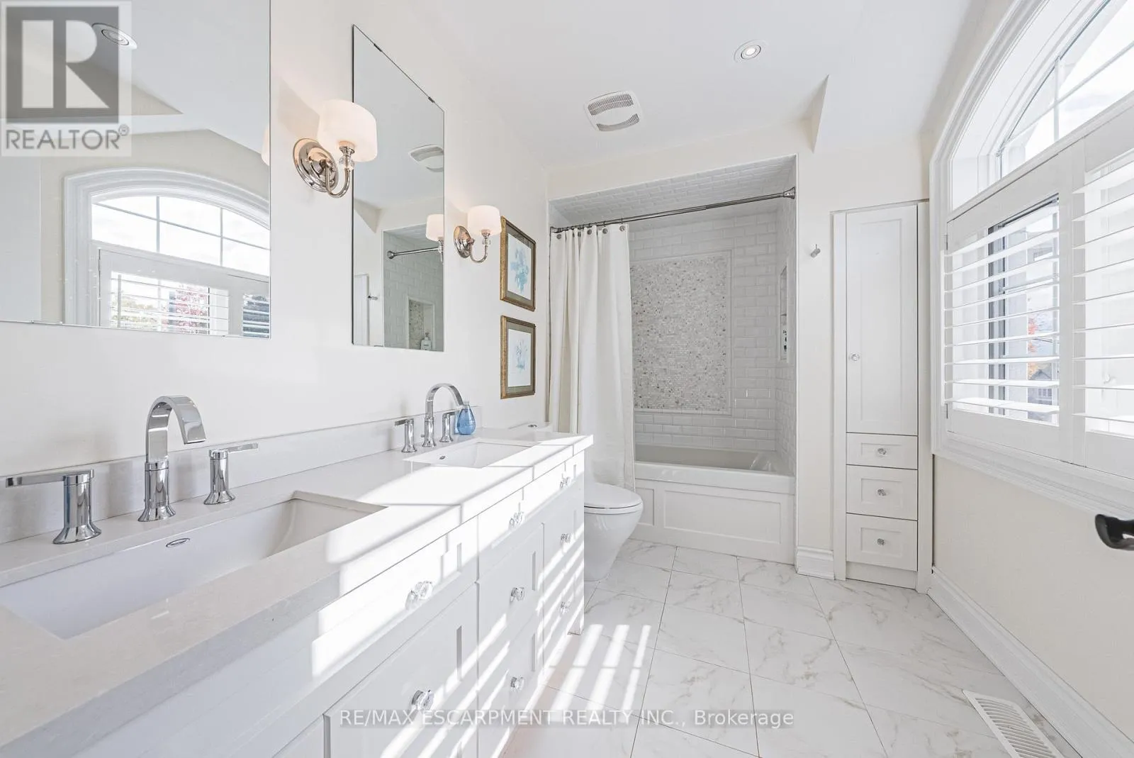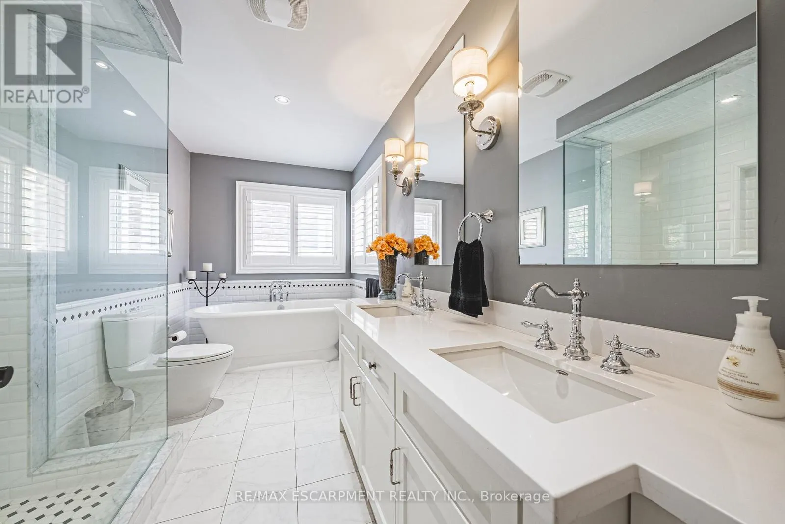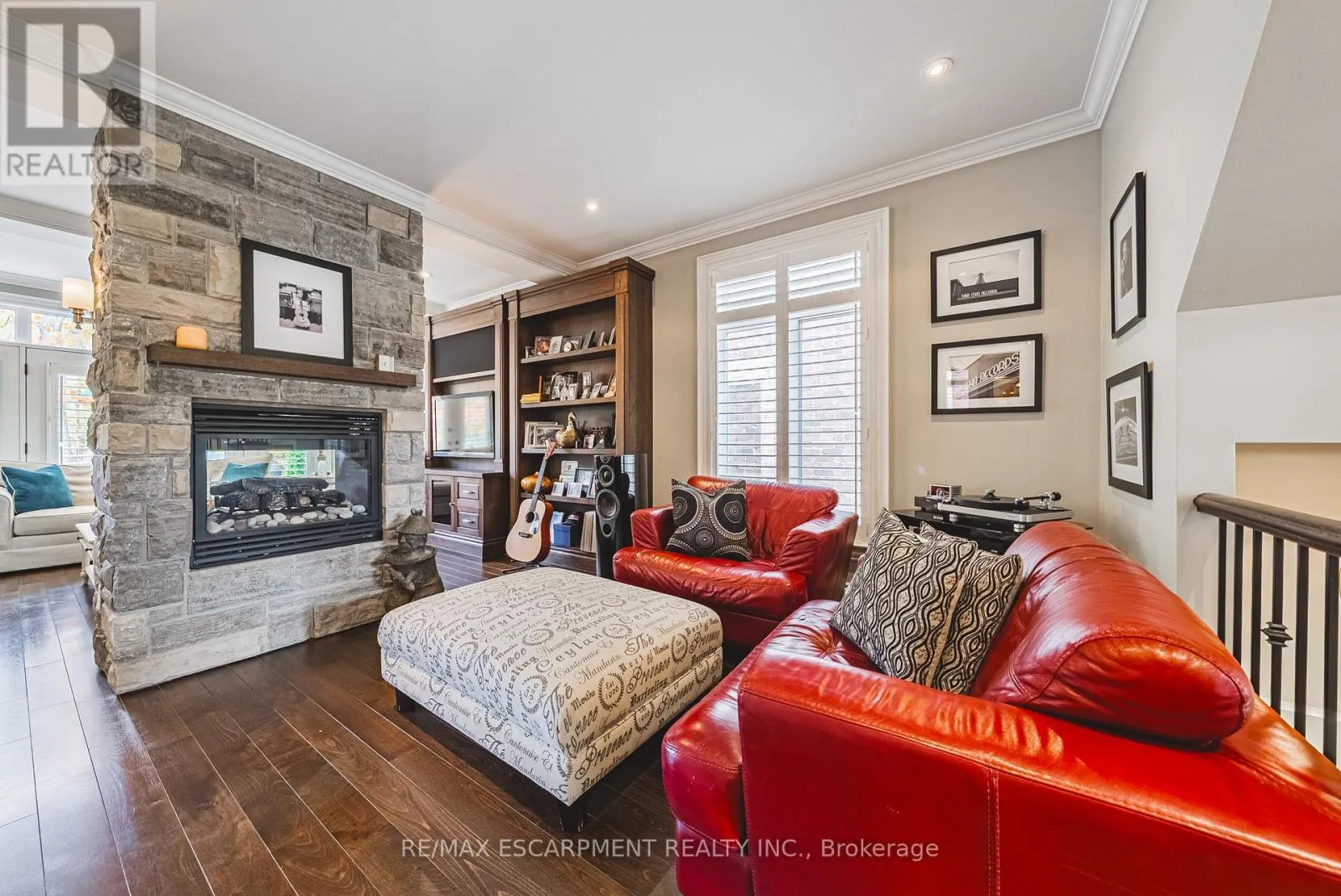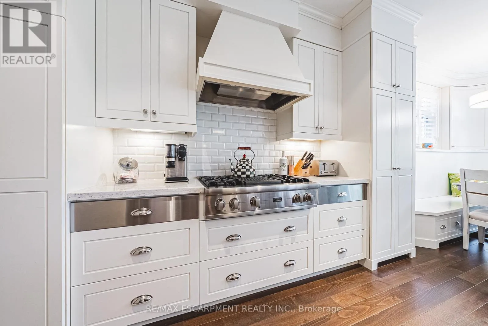 Sydenham St to Alma St Situated in prestigious Olde Dundas on a private ravine lot with panoramic views of Sydenham Creek and the surrounding conservation, this solid-stone Neven-built residence combines timeless craftsmanship with refined luxury. Inside, smooth 10-foot coffered ceilings, intricate custom millwork, and hardwood floors flow through the open-concept design. The chef's kitchen, featuring a gas Viking stove with built-in ovens, anchors the main level and opens to elegant living and dining spaces framed by oversized windows overlooking the forest. Upstairs, two primary suites each offer a spa-inspired ensuite and walk-in closet, ideal for extended family or guests. A dumbwaiter provides seamless service between levels, while thoughtful finishes such as a heated double garage and concrete driveway, backyard walkway, and rear patio reflect quality and durability throughout. The fully finished lower level includes a bedroom, full bath, recreation area, and separate access, perfect for guests, in-laws, or a future suite. Set on a quiet cul-de-sac, just moments from trails, top-rated schools, and the historic charm of downtown Dundas. (id:27476)