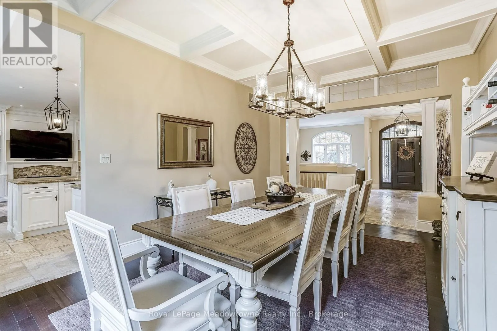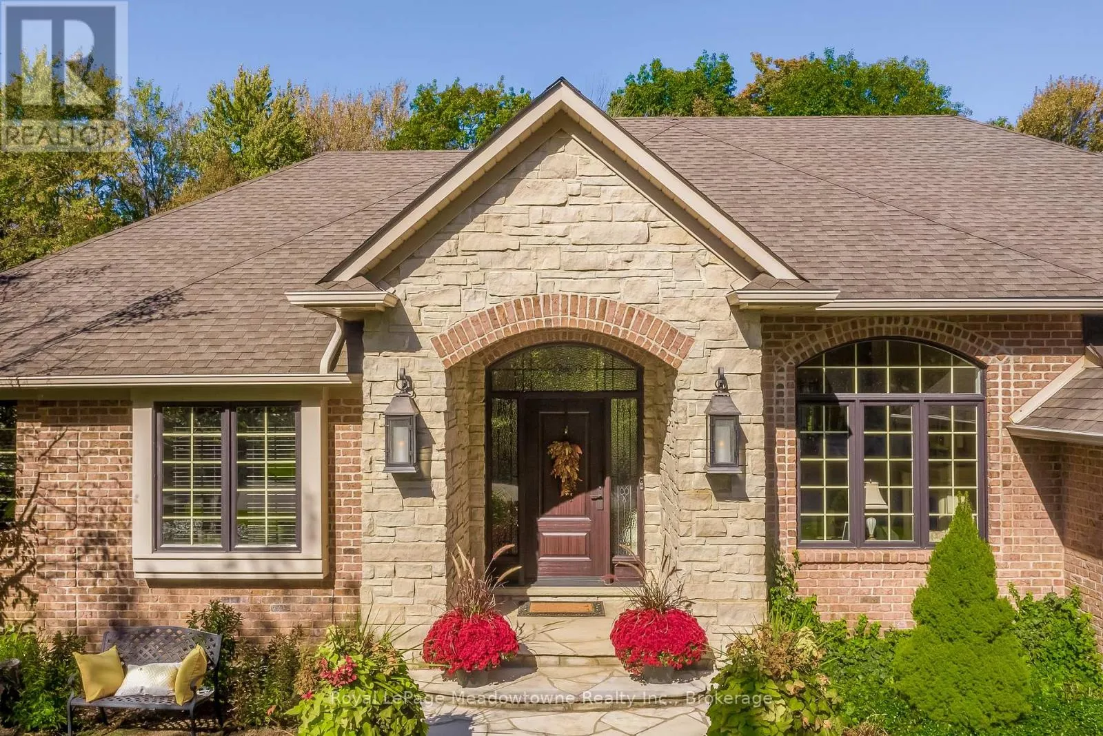 Cross Streets: CARLISLE ROAD AND CENTRE ROAD. ** Directions: NORTH ON HWY 6N, EAST ON CARLISLE ROAD,RIGHT ONTO PARKSHORE PLACE. This well maintained executive 4 (3+1) bdrm custom BUNGALOW with approximately 4470sf of beautifully finished living space combines rural serenity with urban conveniences: a perfect blend of country living and luxury. It is situated on a much sought-after cul-de-sac nestled in the quaint village of Carlisle. The manicured half-acre+ lot backs and sides on to beautifully treed conservation lands. The semi-open concept main flr has been freshly painted throughout, & features an integrated living area consisting of a well-appointed and fully updated eat-in kitchen with 2 magnificent islands accommodating seating for 10 with high-end app (Miele oven/speed oven combo & dishwasher + Jen-Air fridge), and a family rm with a stone façade gas fireplace framed by complementary book shelving and cabinetry. The elegant custom cabinetry offers an abundance of storage. This level also includes an inviting living rm and an oversized dining rm accented by a beautiful coffered ceiling. The generously sized primary room retreat has a 5-pc. ensuite w/i closet. There is also a 5-pc.bath, 2 bdrms, a laundry rm and a 2-pc. bath. Enjoy the luxurious heated limestone flooring that runs throughout the main level. The professionally finished basement, accessible also from the oversized double-car garage, is completed to the same high level of craftsmanship, with high ceilings and large windows. A 27'X37'rec rm, a 4th bdrm, a 4-pc. bath, a utility rm and 4 additional rms can serve a variety of purposes. Updated light fixtures installed throughout. The extremely private back yard oasis has been beautifully landscaped to include a firepit, water feature, and multiple conversation areas well suited for large gatherings. A stunning custom outdoor rm with an integrated large Masters type hot tub complements the private park-like setting. A sprinkler system assists in maintaining the grounds and extensive perennial gardens. A professionally installed lighting system adds to the evening ambience. (id:27476)
