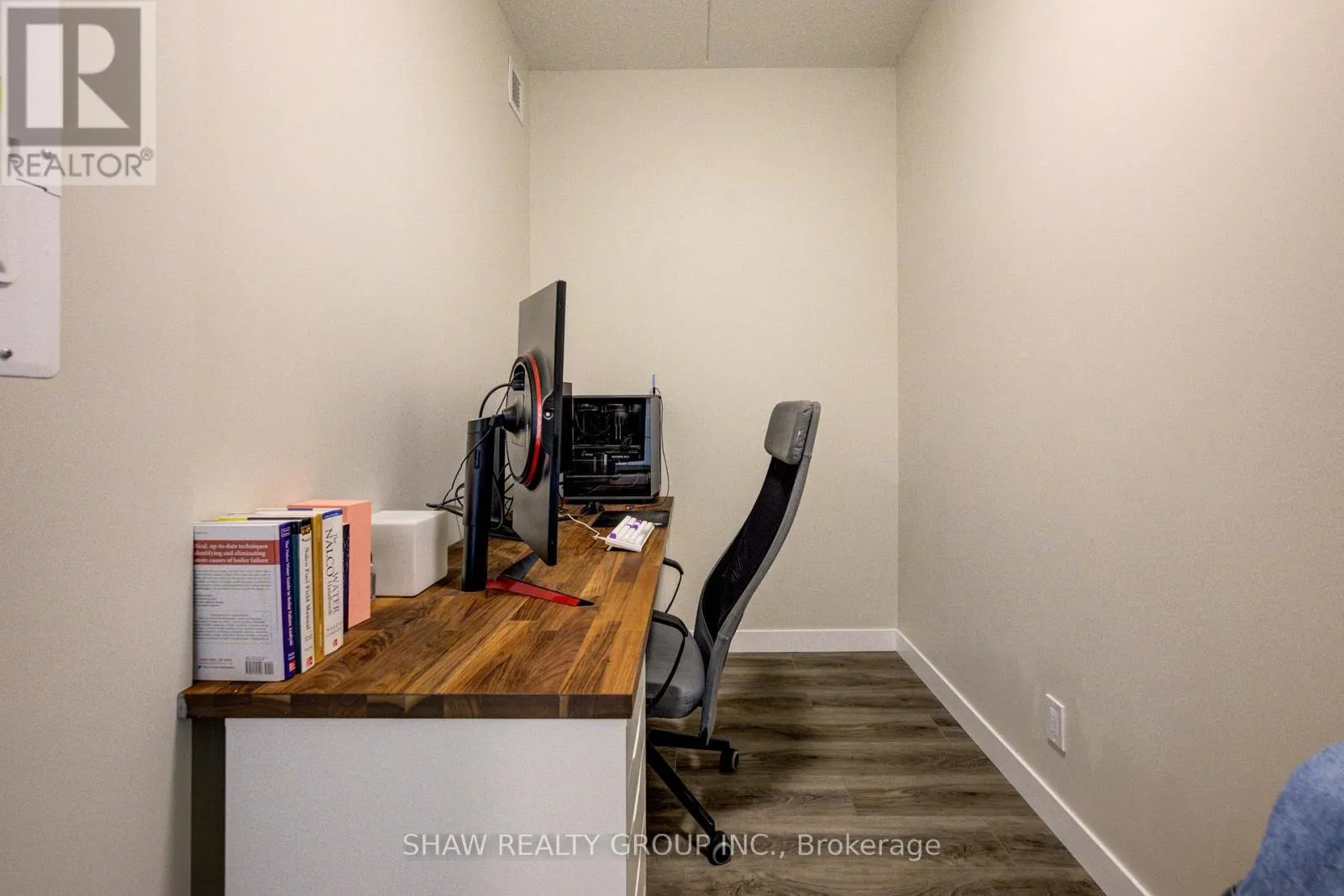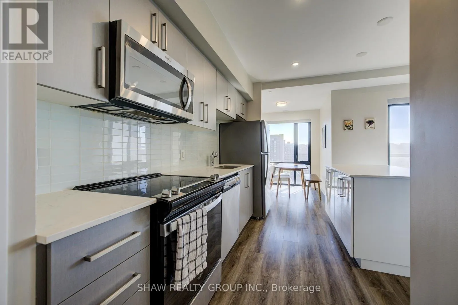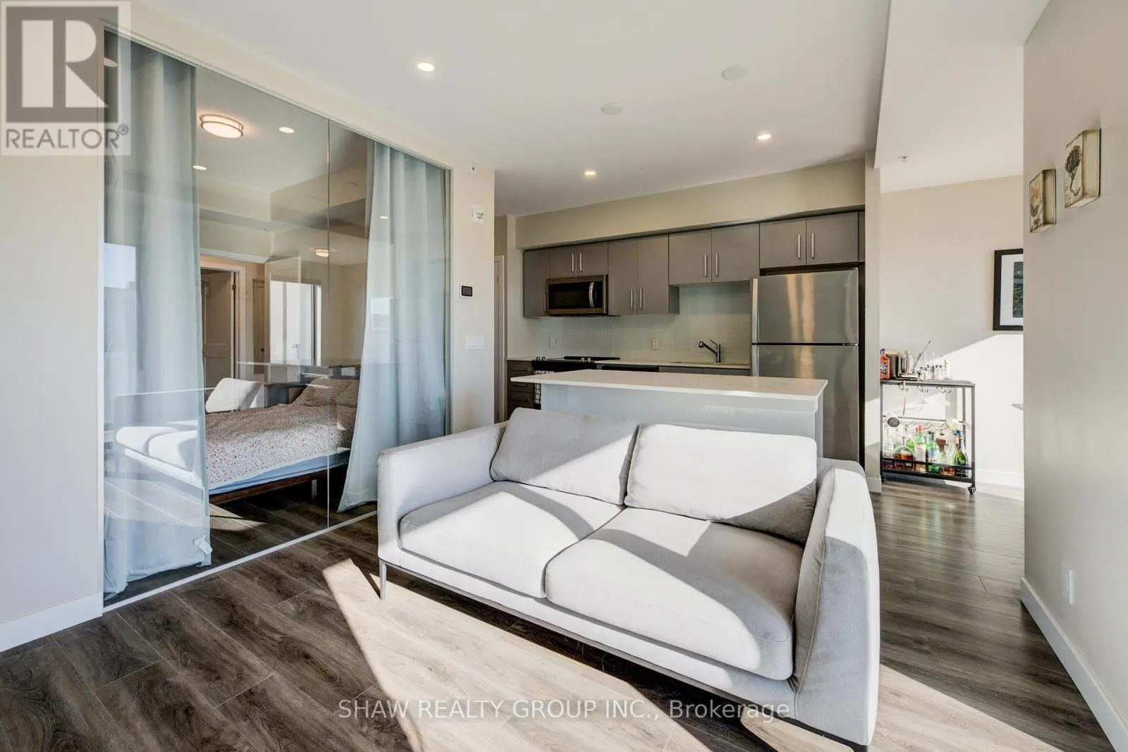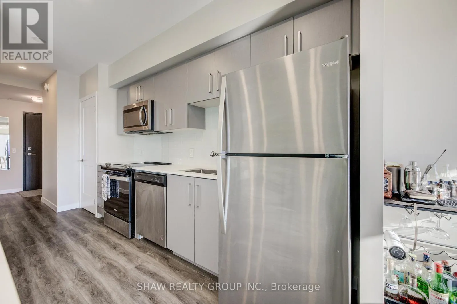 Cross Streets: King St Queen South. ** Directions: King St to Queen South. Live in sophisticated style in Unit #1015 of the modern Platinum Condo building, completed in 2022. This 1 bedroom + 1 den unit features a stylish, carpet-free layout with fantastic city views. The thoughtfully designed interior boasts quartz countertops, quartz countertop island, sleek built-in stainless steel appliances, custom blinds, and a dedicated dining area, making it ideal for both daily living and entertaining. This unit comes with an exclusive assigned locker and a generously sized parking spot. The well-maintained building offers a premium lifestyle with top-tier amenities including a professional concierge, a fitness centre, a party room, and a spectacular rooftop deck with a garden retreat. With high-end, tasteful finishes throughout the common areas and ample parking, this condo provides the perfect blend of luxury, convenience, and urban flair. (id:27476)