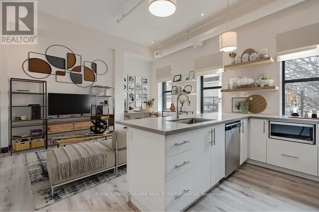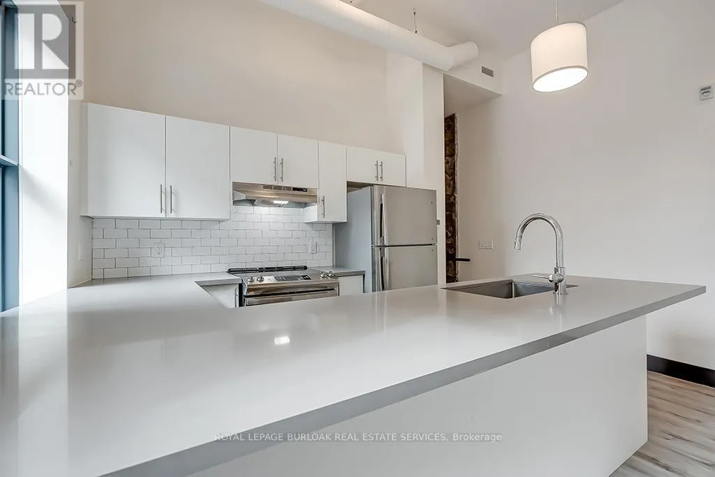 Cross Streets: Catherine Street N. ** Directions: King Street E and Catherine Street N. Experience the best of downtown Hamilton living at Gore Park Lofts, where modern comfort meets historic charm. This beautifully maintained 2-bedroom, 1-bath suite features stylish laminate flooring and exposed brick accents, blending contemporary design with the building's original character. The sleek kitchen offers quartz countertops, a breakfast bar, stainless steel appliances, custom cabinetry, and a designer backsplash. Enjoy the convenience of in-suite laundry and a private locker. Located in the heart of the city, you'll be steps from restaurants, shops, the Farmers' Market, Jackson Square, FirstOntario Centre, and Hamilton's best walk and bike paths. Ideal for commuters and urban explorers alike. Discover the energy of downtown living and make Gore Park Lofts your next home. AAA+ tenants only, please. (id:27476)