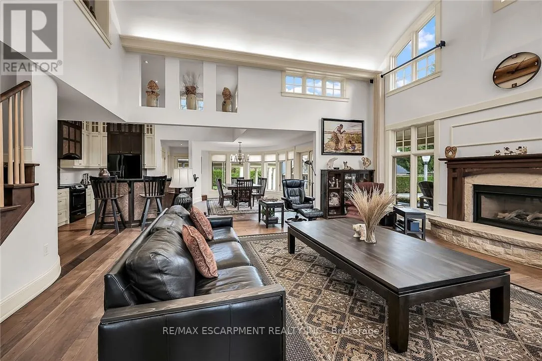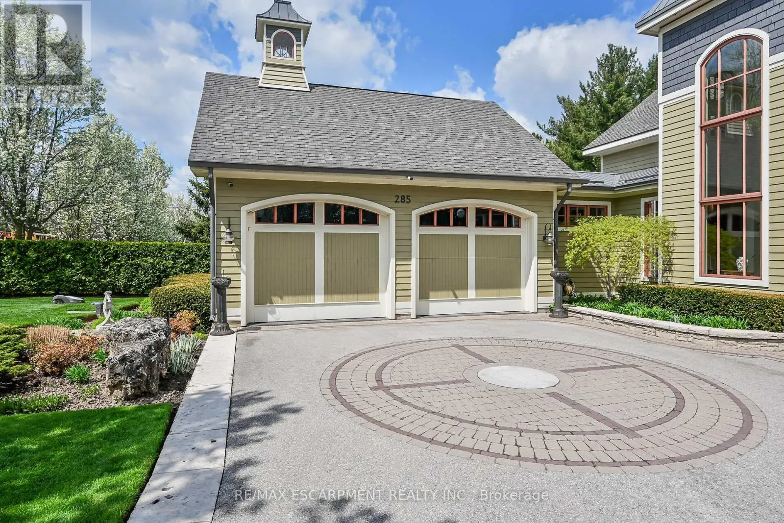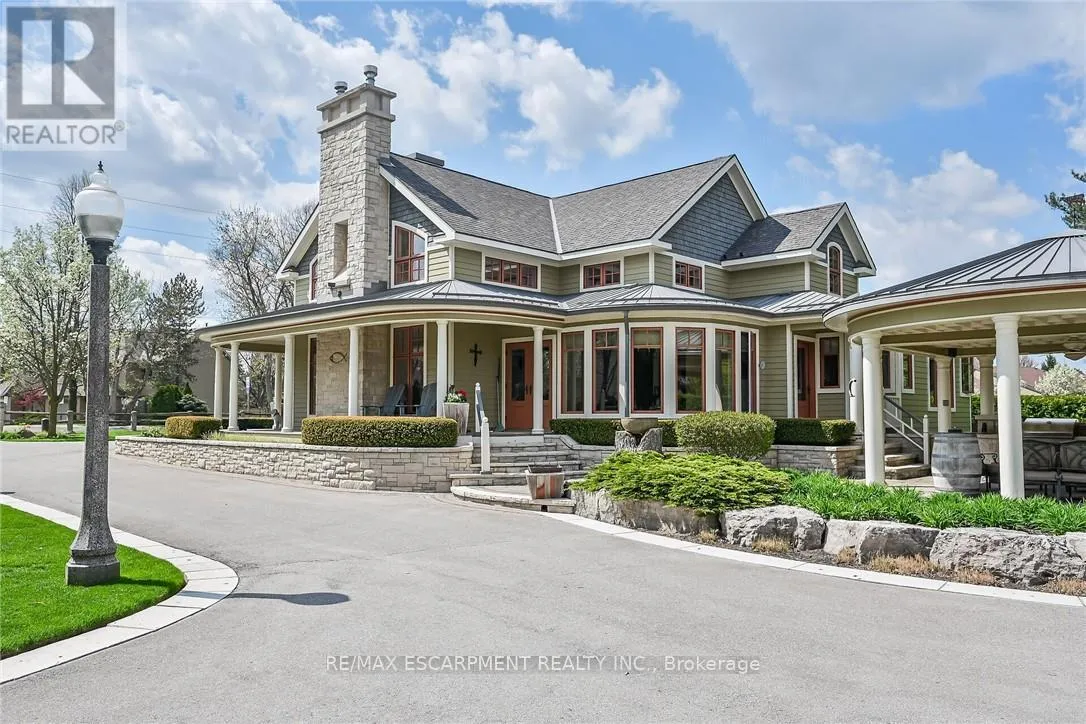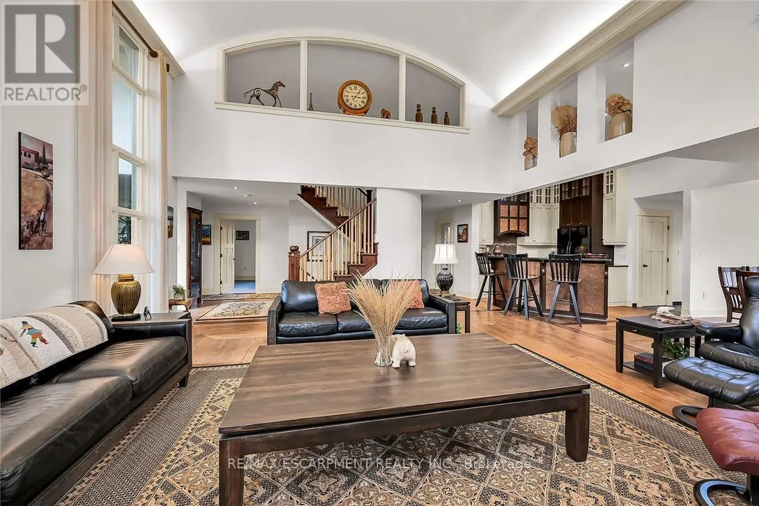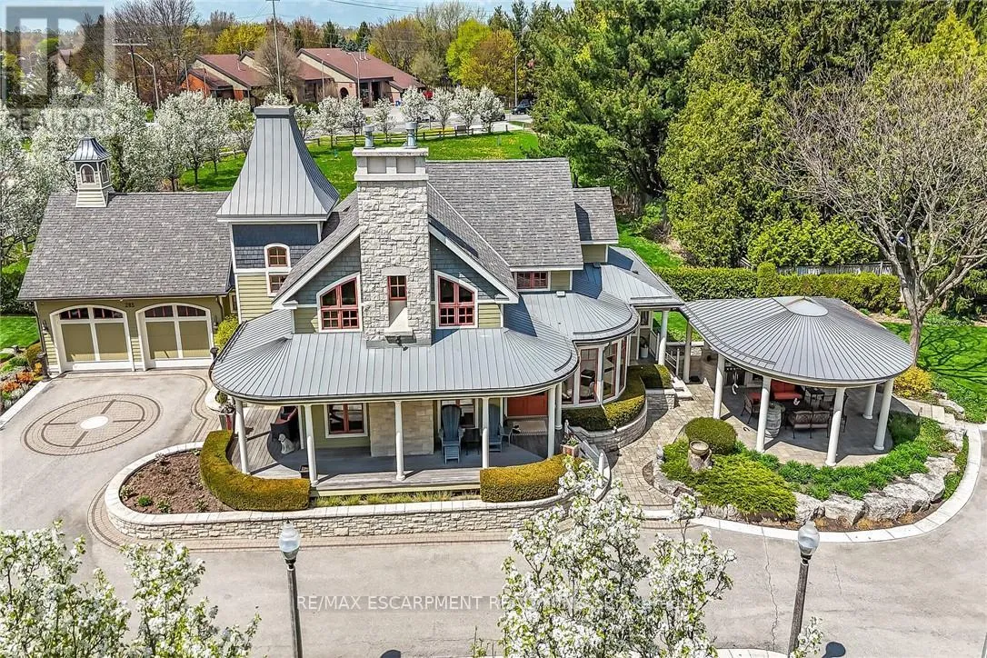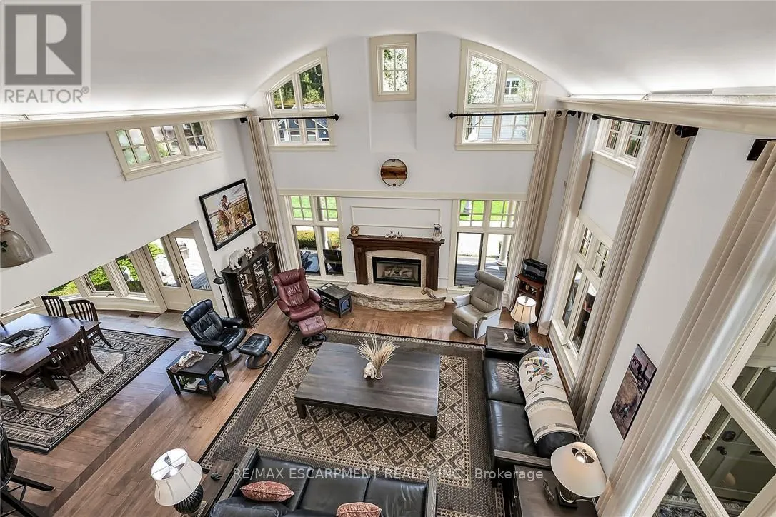 Cross Streets: Wilson. ** Directions: Wilson St W to Hamilton Dr. Architectural masterpiece. Many have admired this unique 2 storey residence situated on a private half acre lot. Quality and details abound in this custom build. Soaring 17' Barrel vaulted ceiling in sun-filled living room is the highlight of the home. Interesting details throughout. Exterior gets interest for its used of muted natural colour scheme. Lower level features In-Law suite and generous storage space. Private parking for 20 cars. Heated garage features tiled flooring. Additional 22'x20' heated garage or workshop with water supply. Third garage is single. A must-see for clients seeking quality and comfort! (id:27476)