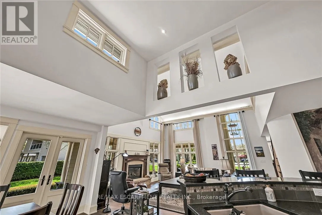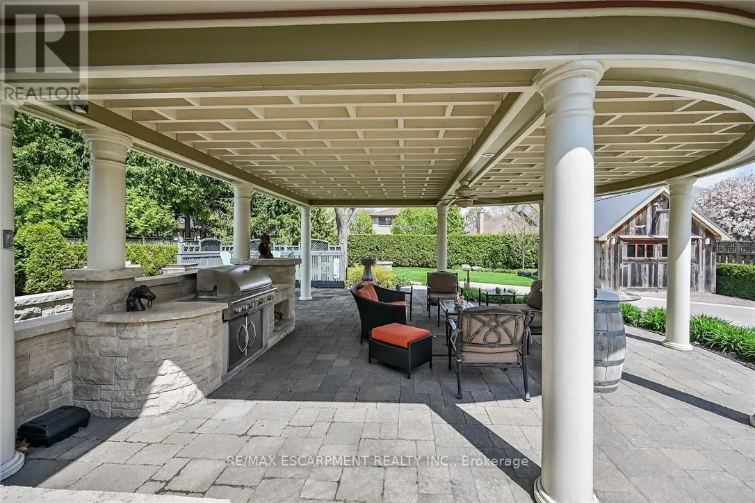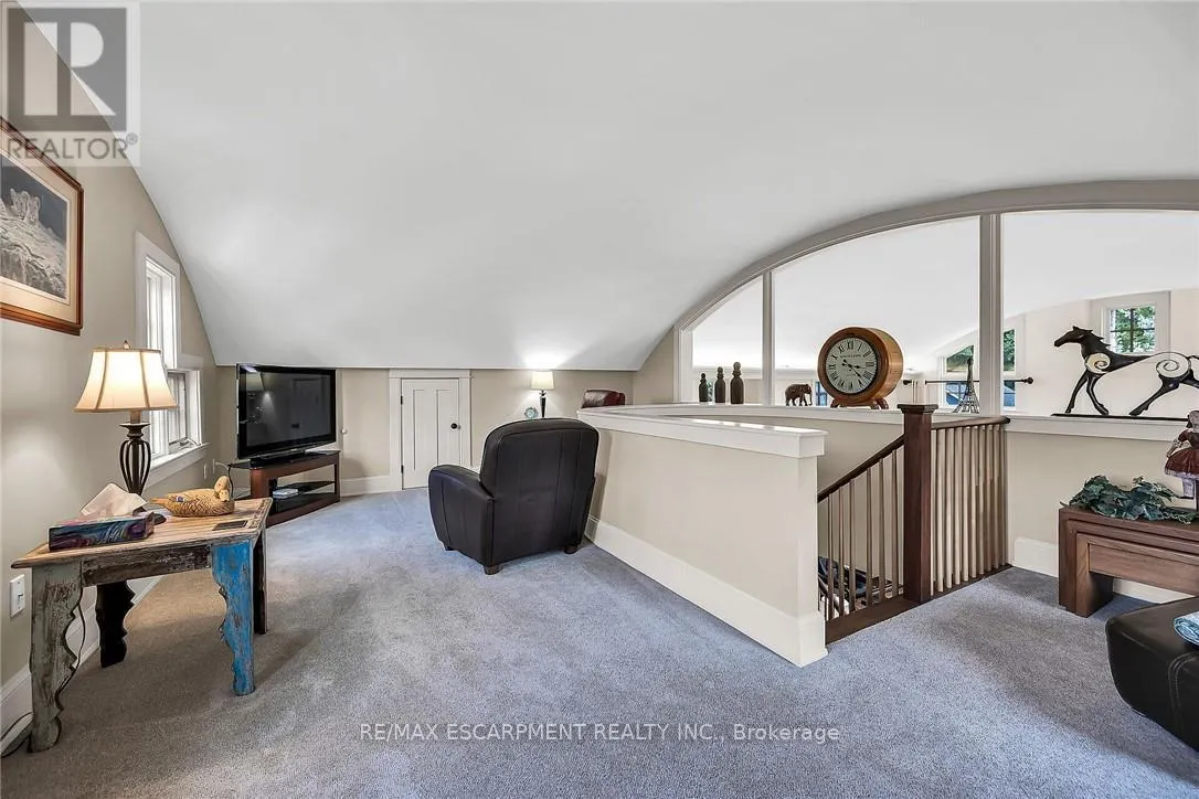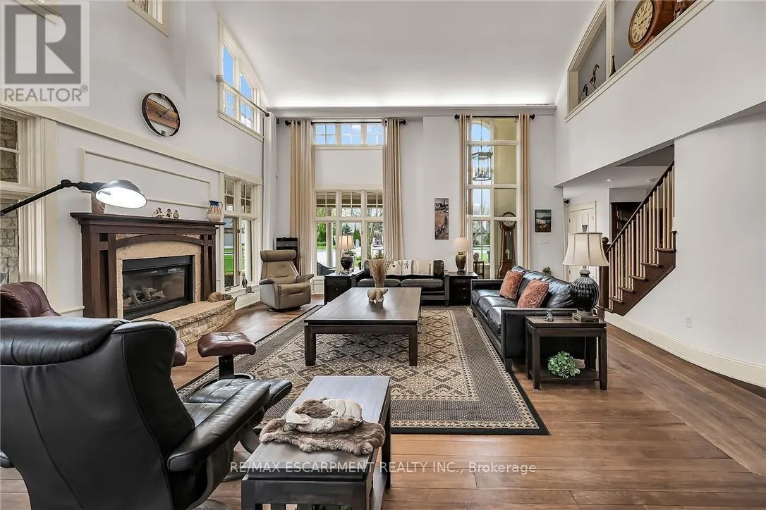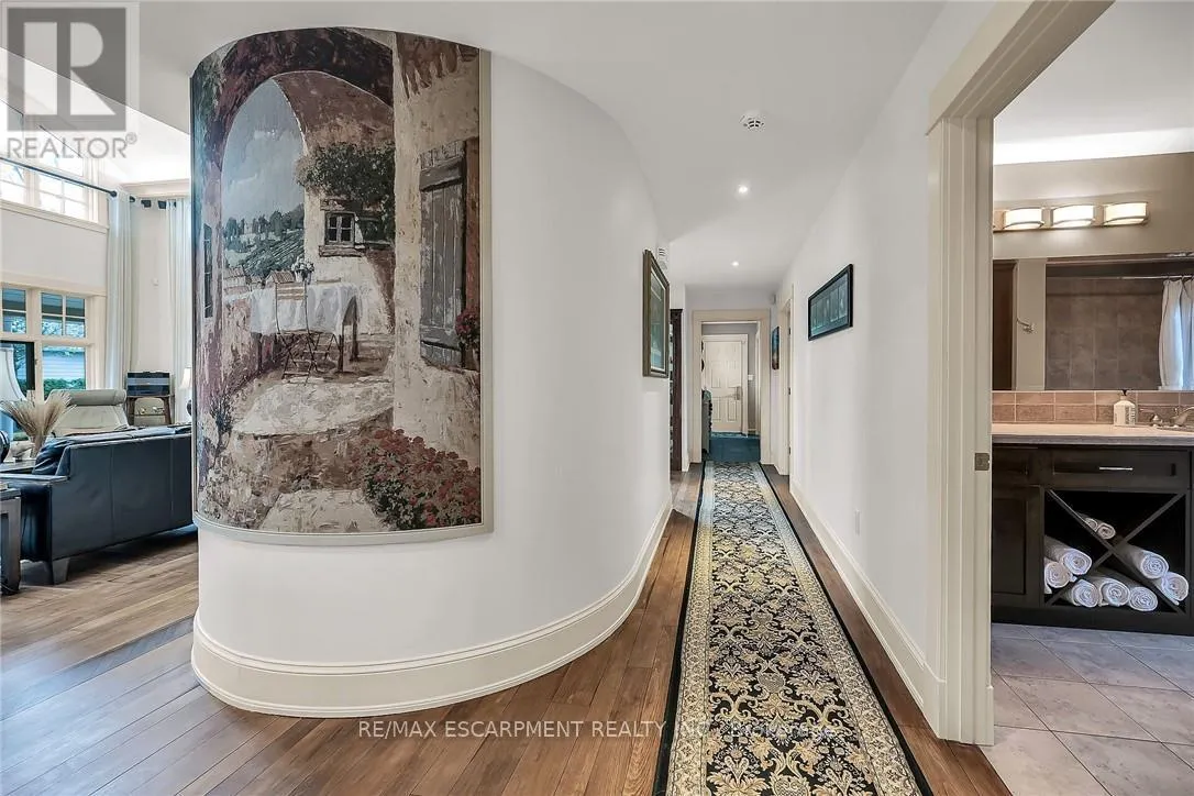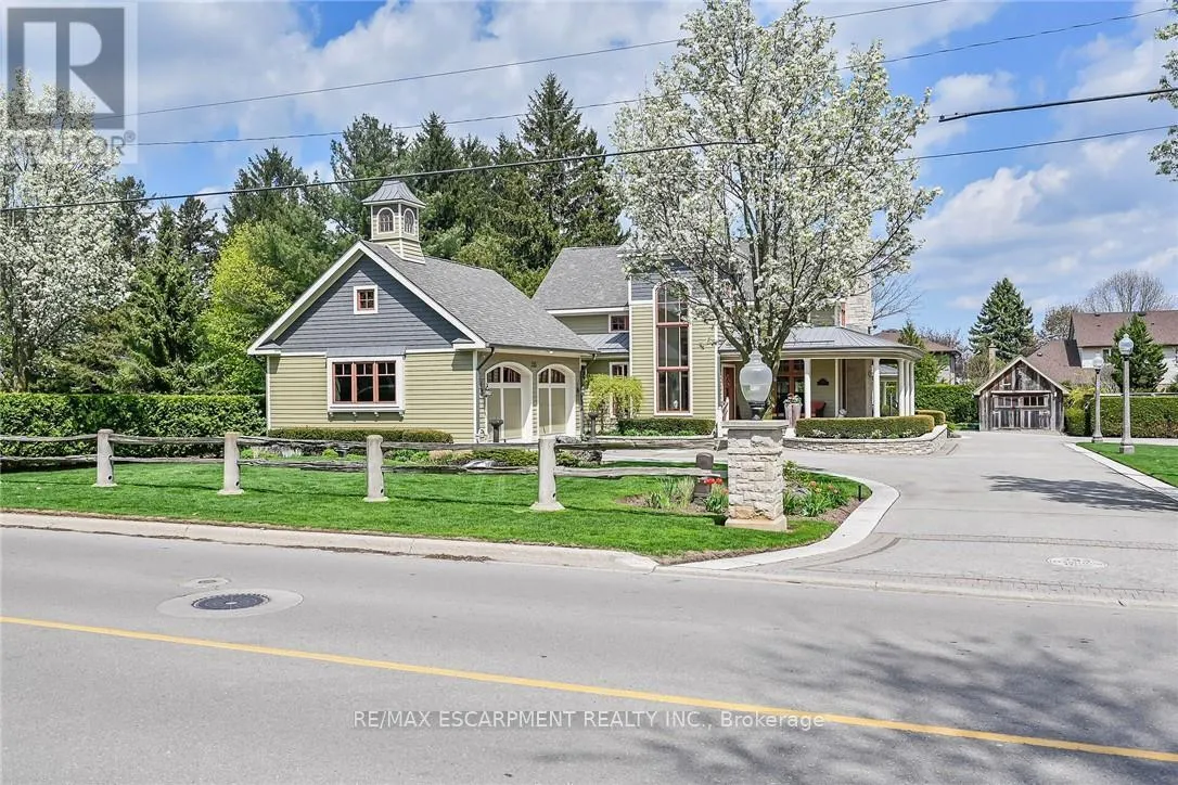 Cross Streets: Wilson. ** Directions: Wilson St W to Hamilton Dr. Architectural masterpiece. Many have admired this unique 2 storey residence situated on a private half acre lot. Quality and details abound in this custom build. Soaring 17' Barrel vaulted ceiling in sun-filled living room is the highlight of the home. Interesting details throughout. Exterior gets interest for its used of muted natural colour scheme. Lower level features In-Law suite and generous storage space. Private parking for 20 cars. Heated garage features tiled flooring. Additional 22'x20' heated garage or workshop with water supply. Third garage is single. A must-see for clients seeking quality and comfort! (id:27476)