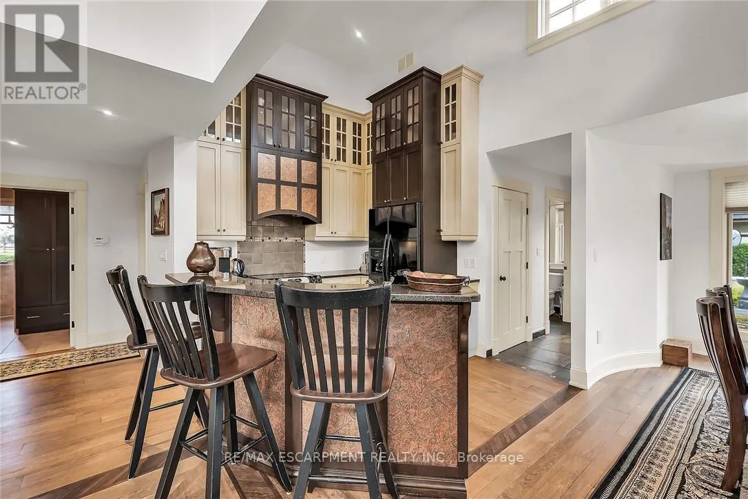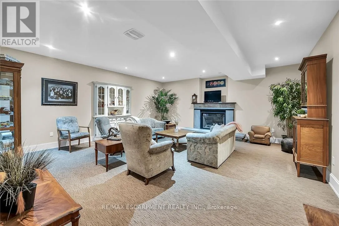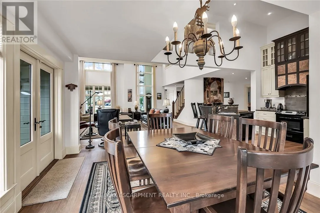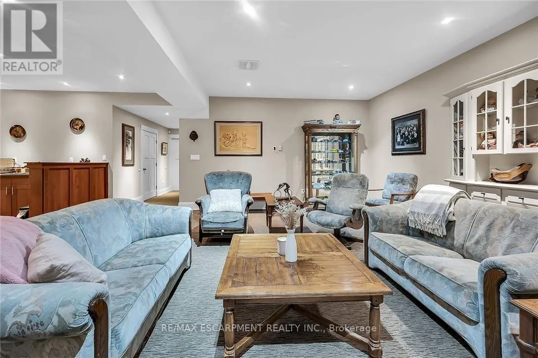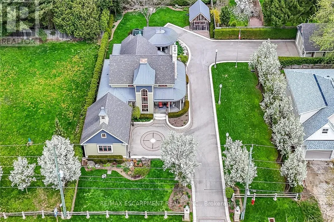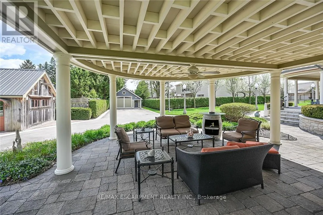 Cross Streets: Wilson. ** Directions: Wilson St W to Hamilton Dr. Architectural masterpiece. Many have admired this unique 2 storey residence situated on a private half acre lot. Quality and details abound in this custom build. Soaring 17' Barrel vaulted ceiling in sun-filled living room is the highlight of the home. Interesting details throughout. Exterior gets interest for its used of muted natural colour scheme. Lower level features In-Law suite and generous storage space. Private parking for 20 cars. Heated garage features tiled flooring. Additional 22'x20' heated garage or workshop with water supply. Third garage is single. A must-see for clients seeking quality and comfort! (id:27476)
