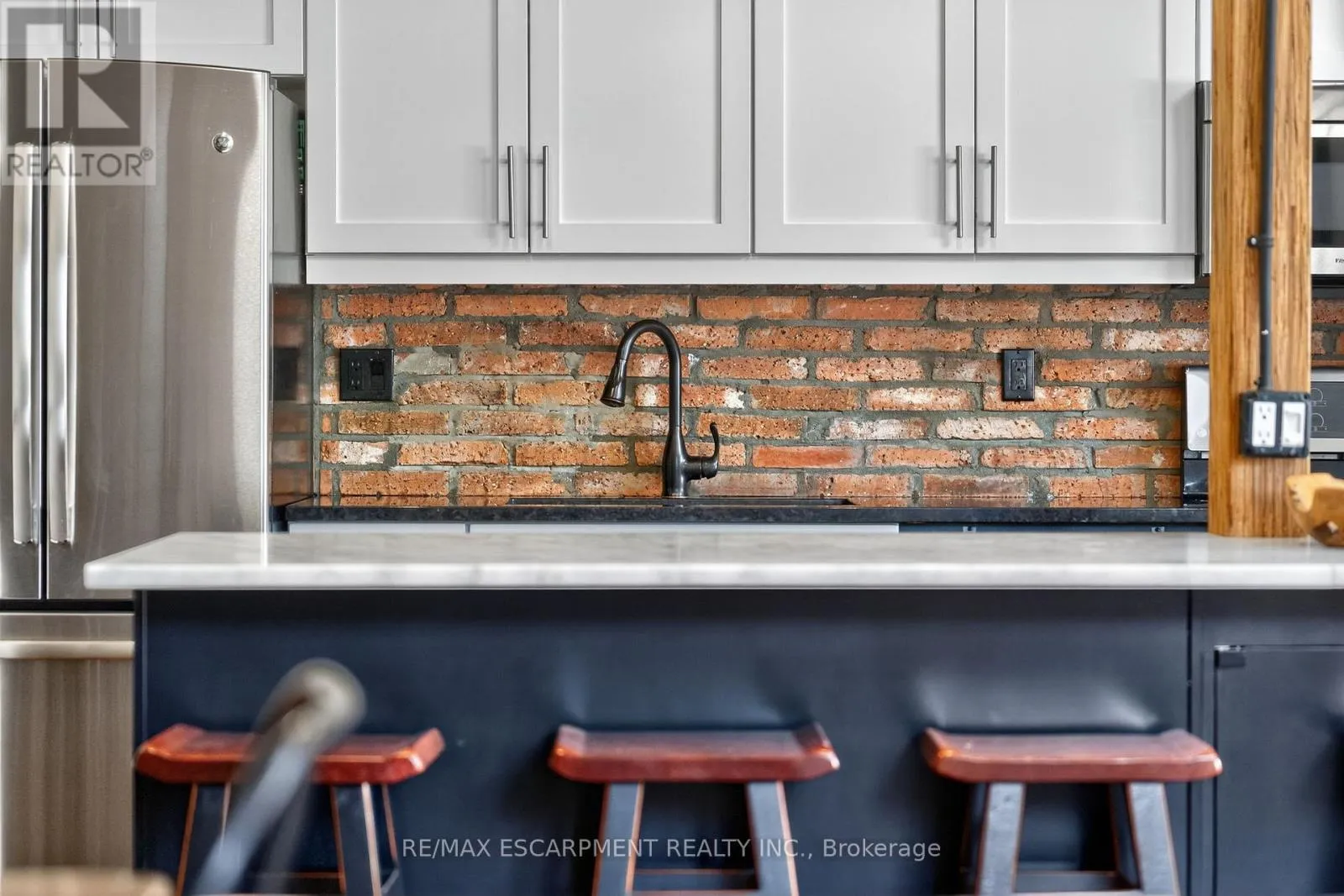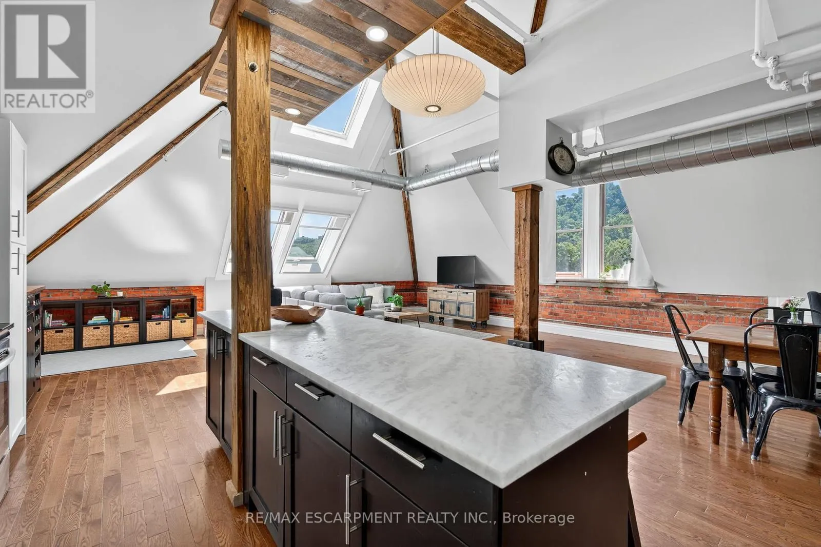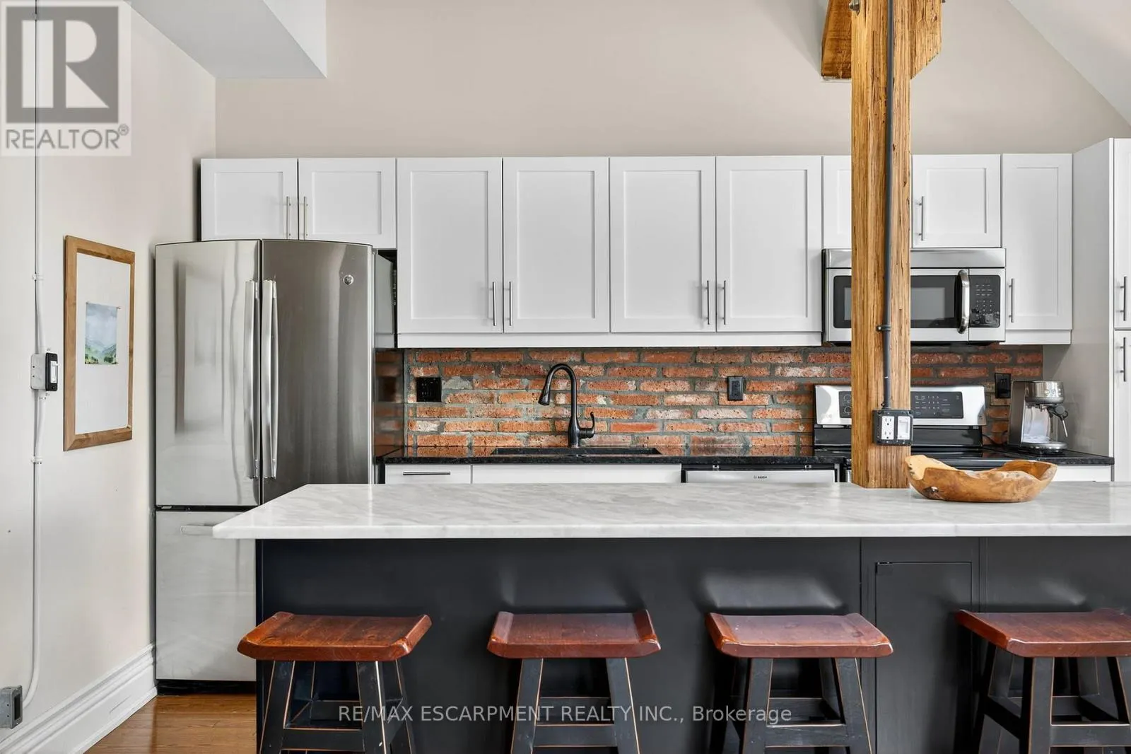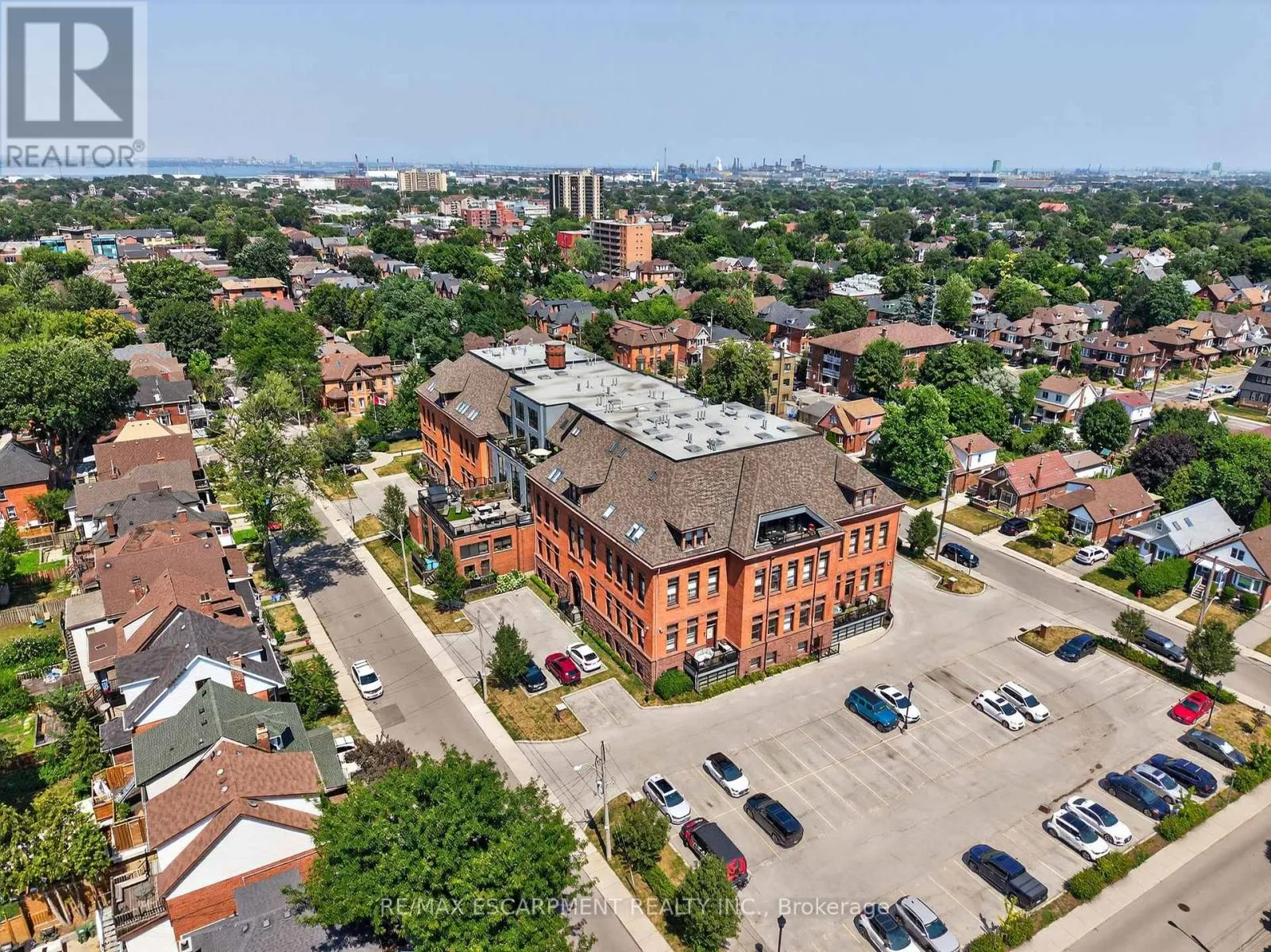 Wentworth St S Live in the grooviest space ever! Welcome to the historical heritage Stinson school lofts. The building is centrally located, close to downtown and the escarpment, between three Hamilton Hospitals, the GO Station, plenty of transit, bike lanes, an ideal location for commuters. This bright and open two-storey loft has gorgeous hardwood floors, exposed brick walls and beamed ceilings. The open concept main floor seamlessly connects the kitchen, dining, and living areas, with a vaulted ceiling that makes this huge space seem even bigger somehow, with stunning views through the skylight windows. This kitchen has a rustic charm and modern luxury, with a granite and quartz island complete with an integrated outlet for electronics. The exposed wooden beams and brick backsplash gives an old-world feel, while the updated appliances make the space contemporary. The main level has a floor laundry room and two-piece powder room as well. Upstairs, the primary suite has a massive window with escarpment views. There is a full ensuite bathroom and a huge walk-in closet as well. The second bedroom features more exposed brick and a large, screened skylight that can be opened. The second bedroom is large and can be used is a variety of ways. Welcome home! RSA. (id:27476)
