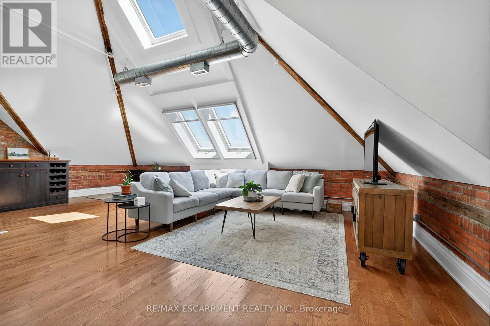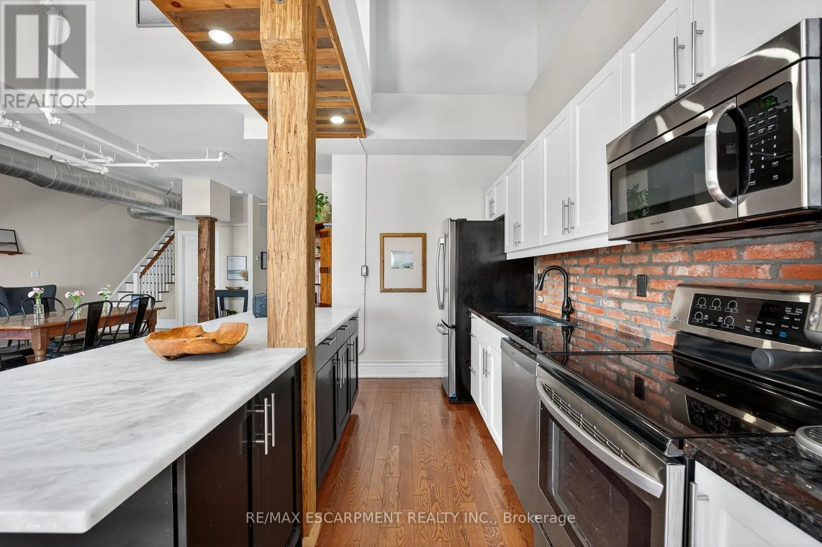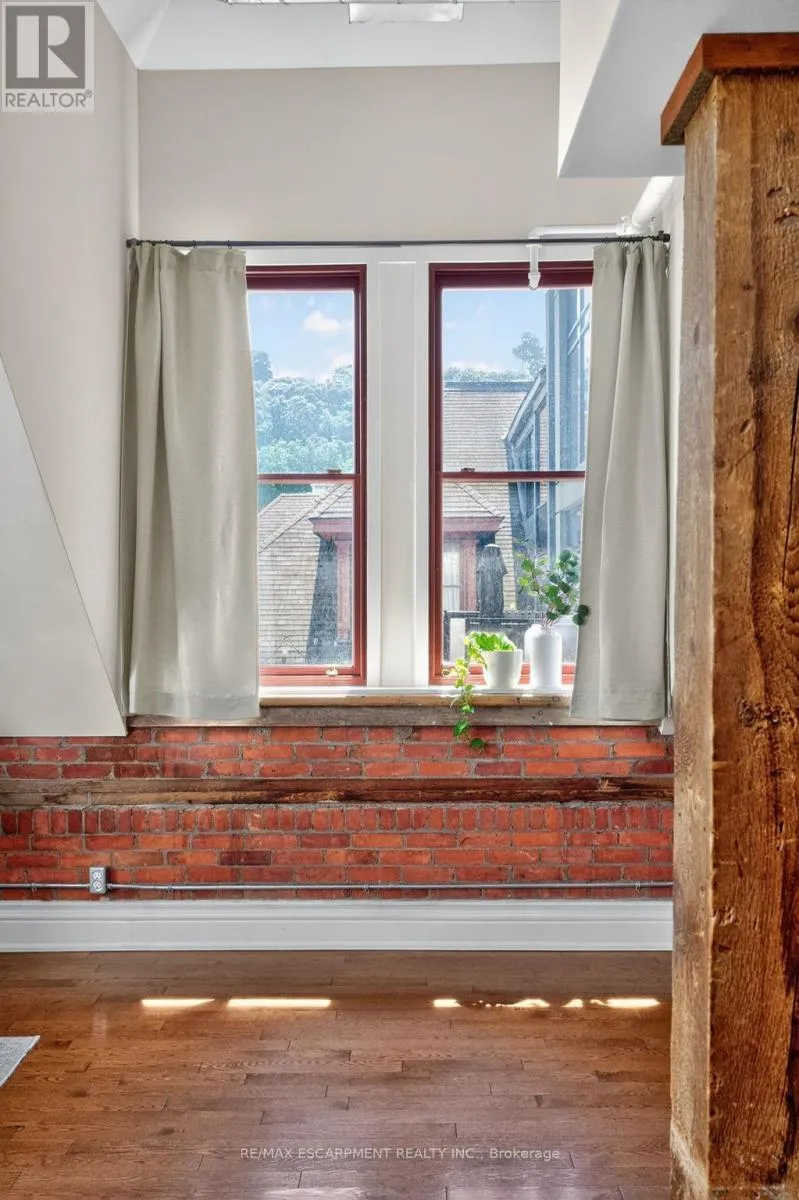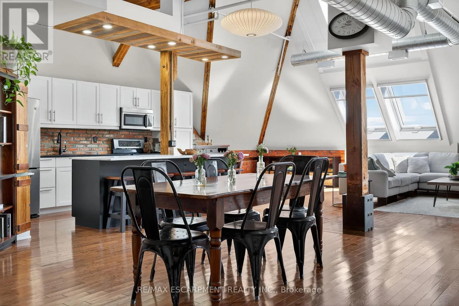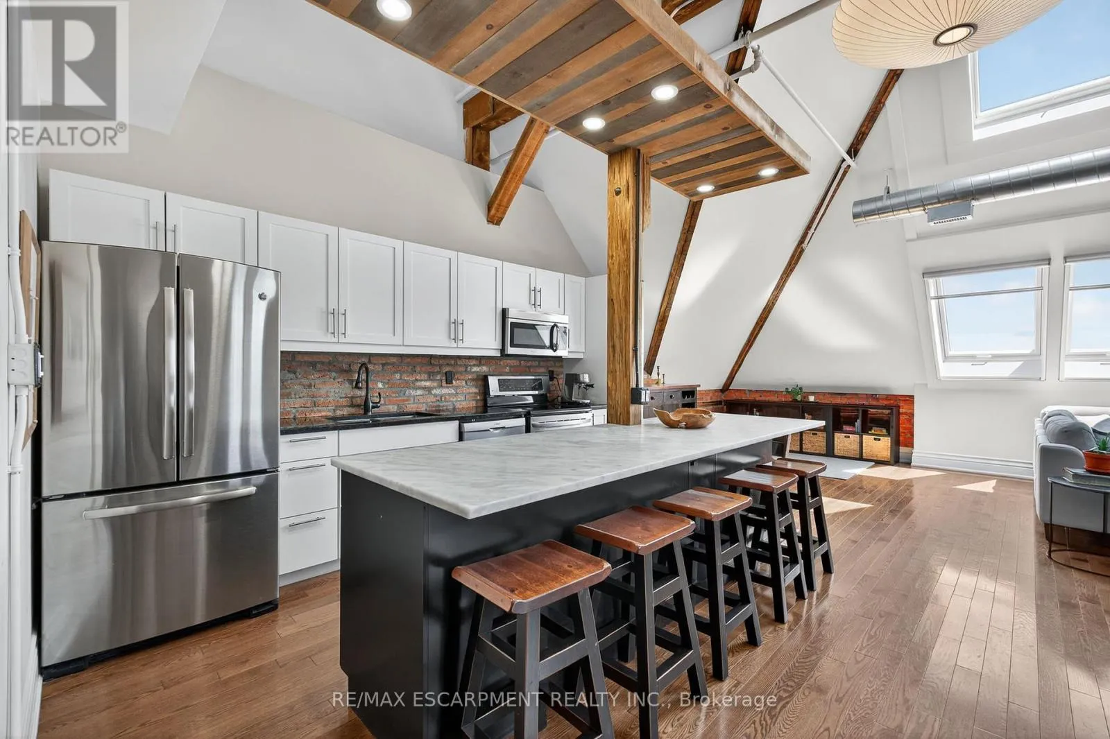 Wentworth St S Live in the grooviest space ever! Welcome to the historical heritage Stinson school lofts. The building is centrally located, close to downtown and the escarpment, between three Hamilton Hospitals, the GO Station, plenty of transit, bike lanes, an ideal location for commuters. This bright and open two-storey loft has gorgeous hardwood floors, exposed brick walls and beamed ceilings. The open concept main floor seamlessly connects the kitchen, dining, and living areas, with a vaulted ceiling that makes this huge space seem even bigger somehow, with stunning views through the skylight windows. This kitchen has a rustic charm and modern luxury, with a granite and quartz island complete with an integrated outlet for electronics. The exposed wooden beams and brick backsplash gives an old-world feel, while the updated appliances make the space contemporary. The main level has a floor laundry room and two-piece powder room as well. Upstairs, the primary suite has a massive window with escarpment views. There is a full ensuite bathroom and a huge walk-in closet as well. The second bedroom features more exposed brick and a large, screened skylight that can be opened. The second bedroom is large and can be used is a variety of ways. Welcome home! RSA. (id:27476)