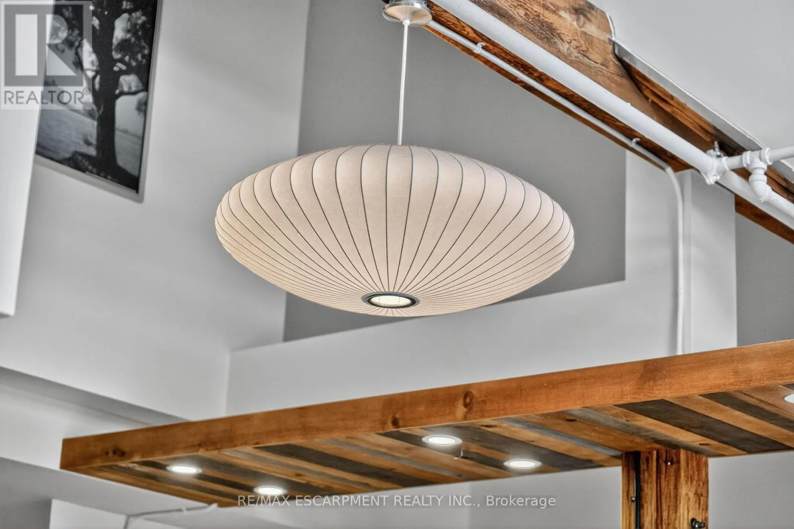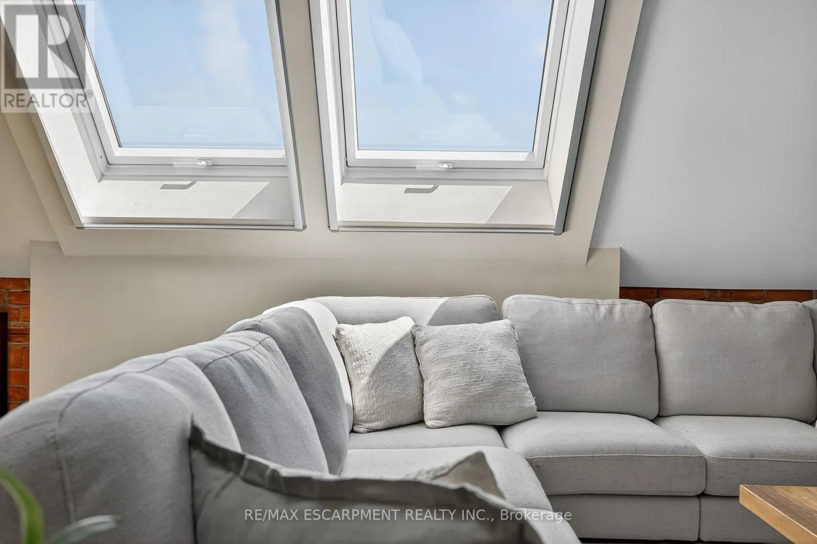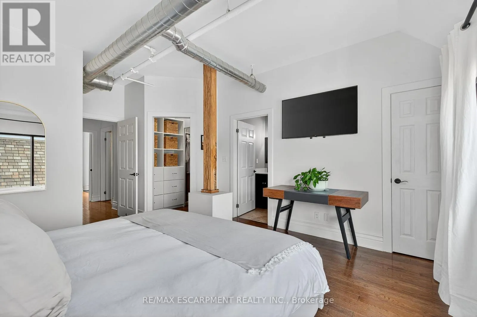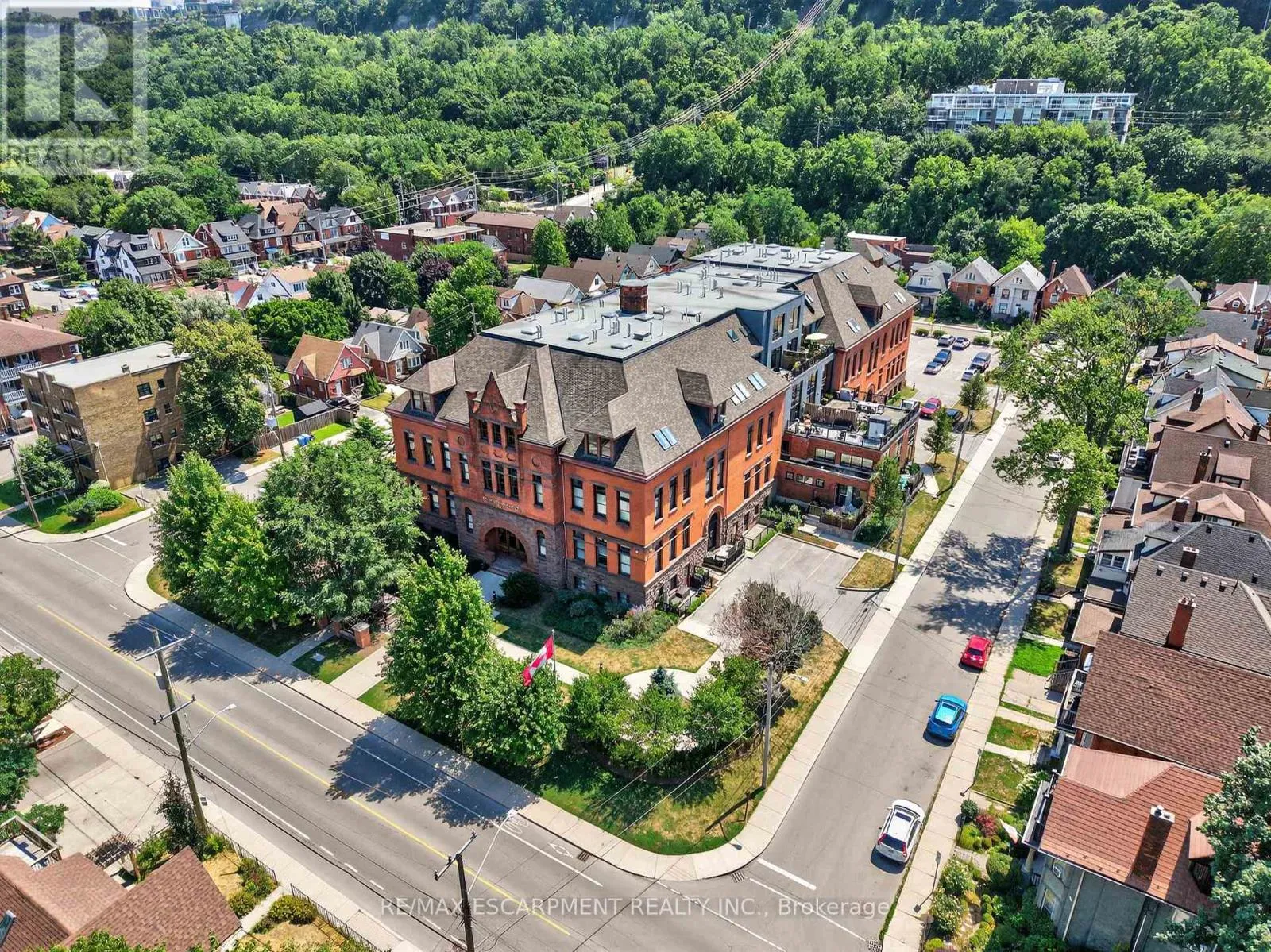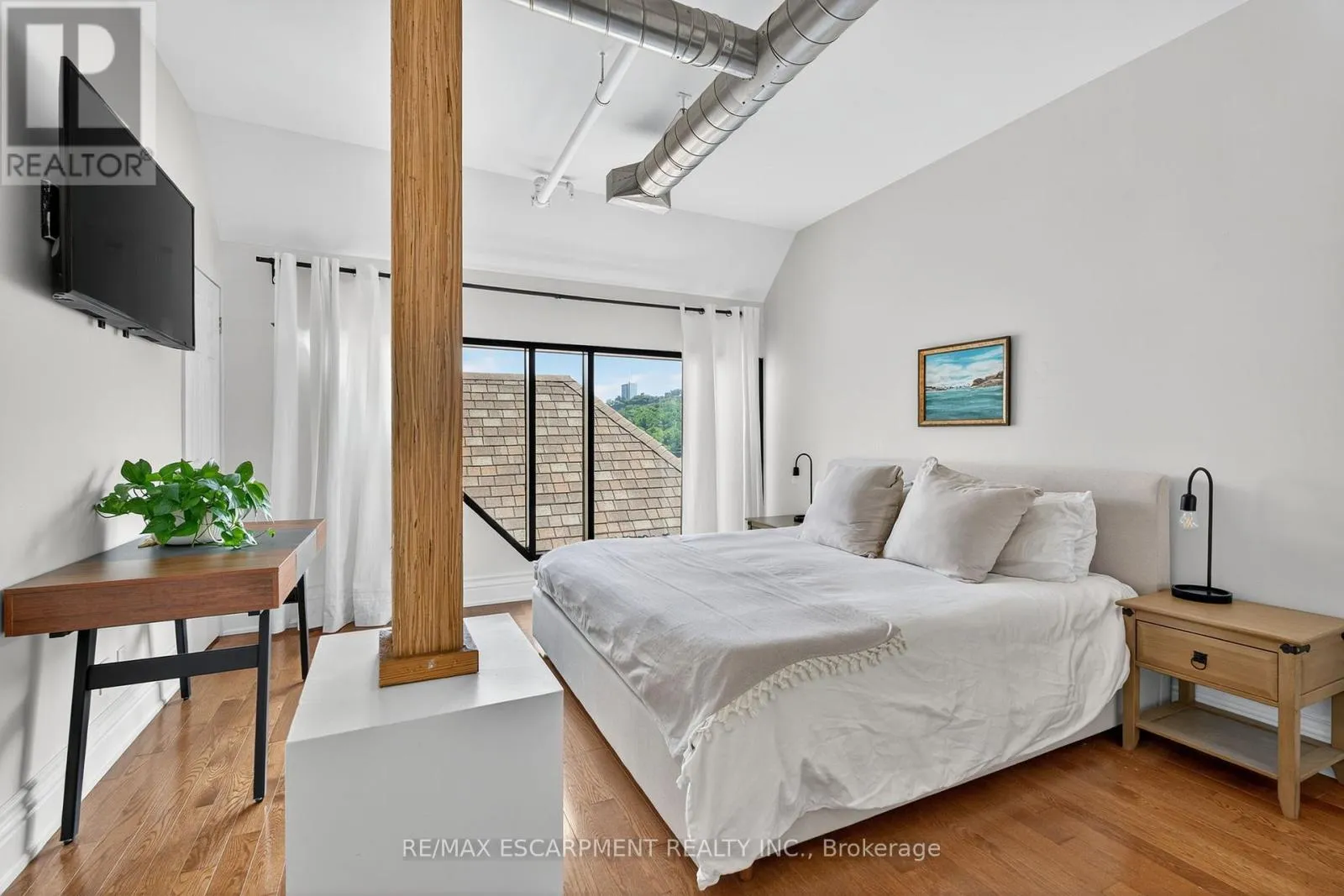 Wentworth St S Live in the grooviest space ever! Welcome to the historical heritage Stinson school lofts. The building is centrally located, close to downtown and the escarpment, between three Hamilton Hospitals, the GO Station, plenty of transit, bike lanes, an ideal location for commuters. This bright and open two-storey loft has gorgeous hardwood floors, exposed brick walls and beamed ceilings. The open concept main floor seamlessly connects the kitchen, dining, and living areas, with a vaulted ceiling that makes this huge space seem even bigger somehow, with stunning views through the skylight windows. This kitchen has a rustic charm and modern luxury, with a granite and quartz island complete with an integrated outlet for electronics. The exposed wooden beams and brick backsplash gives an old-world feel, while the updated appliances make the space contemporary. The main level has a floor laundry room and two-piece powder room as well. Upstairs, the primary suite has a massive window with escarpment views. There is a full ensuite bathroom and a huge walk-in closet as well. The second bedroom features more exposed brick and a large, screened skylight that can be opened. The second bedroom is large and can be used is a variety of ways. Welcome home! RSA. (id:27476)