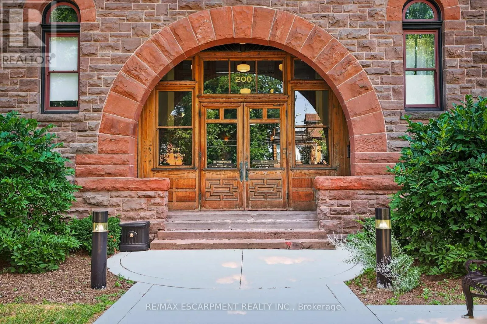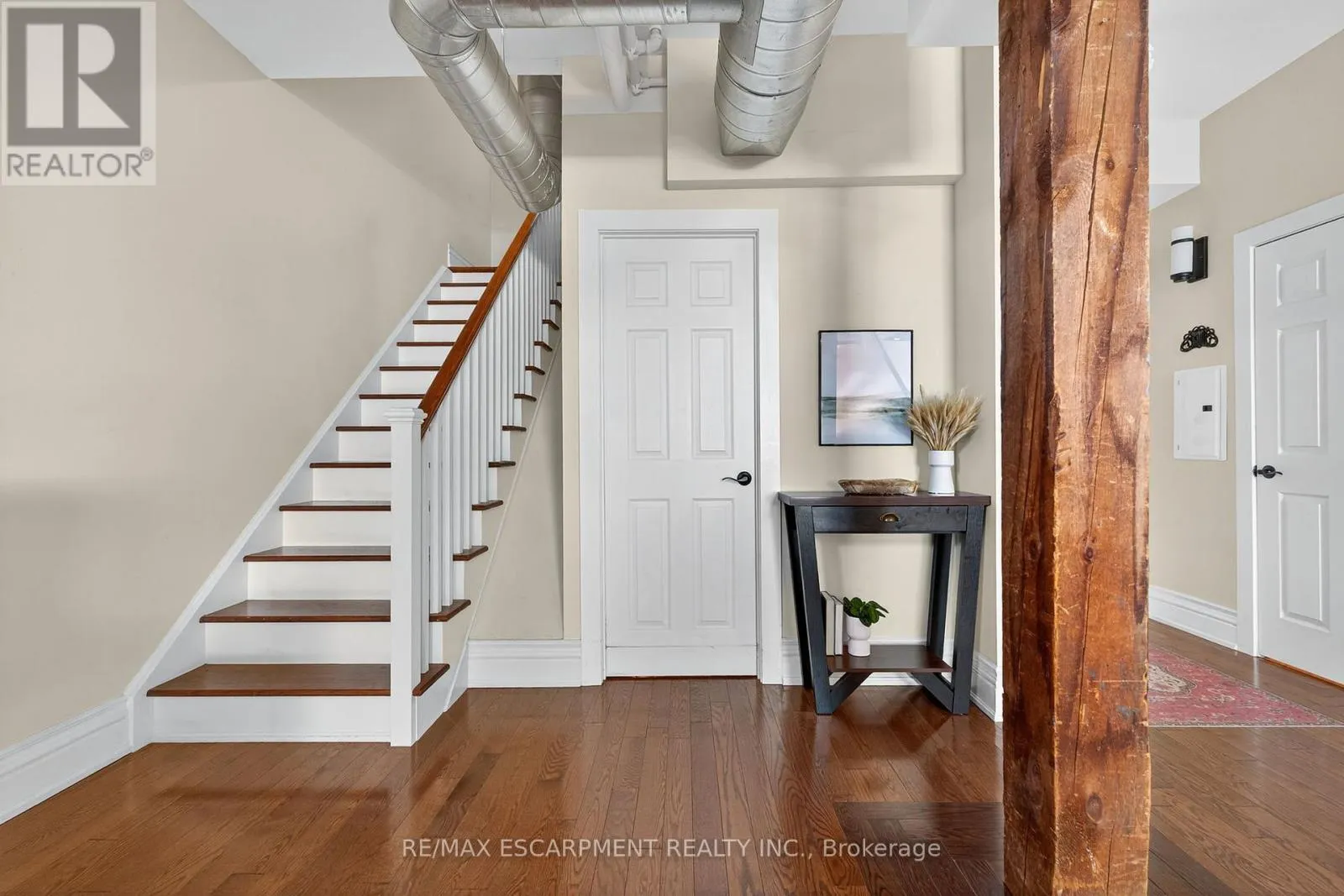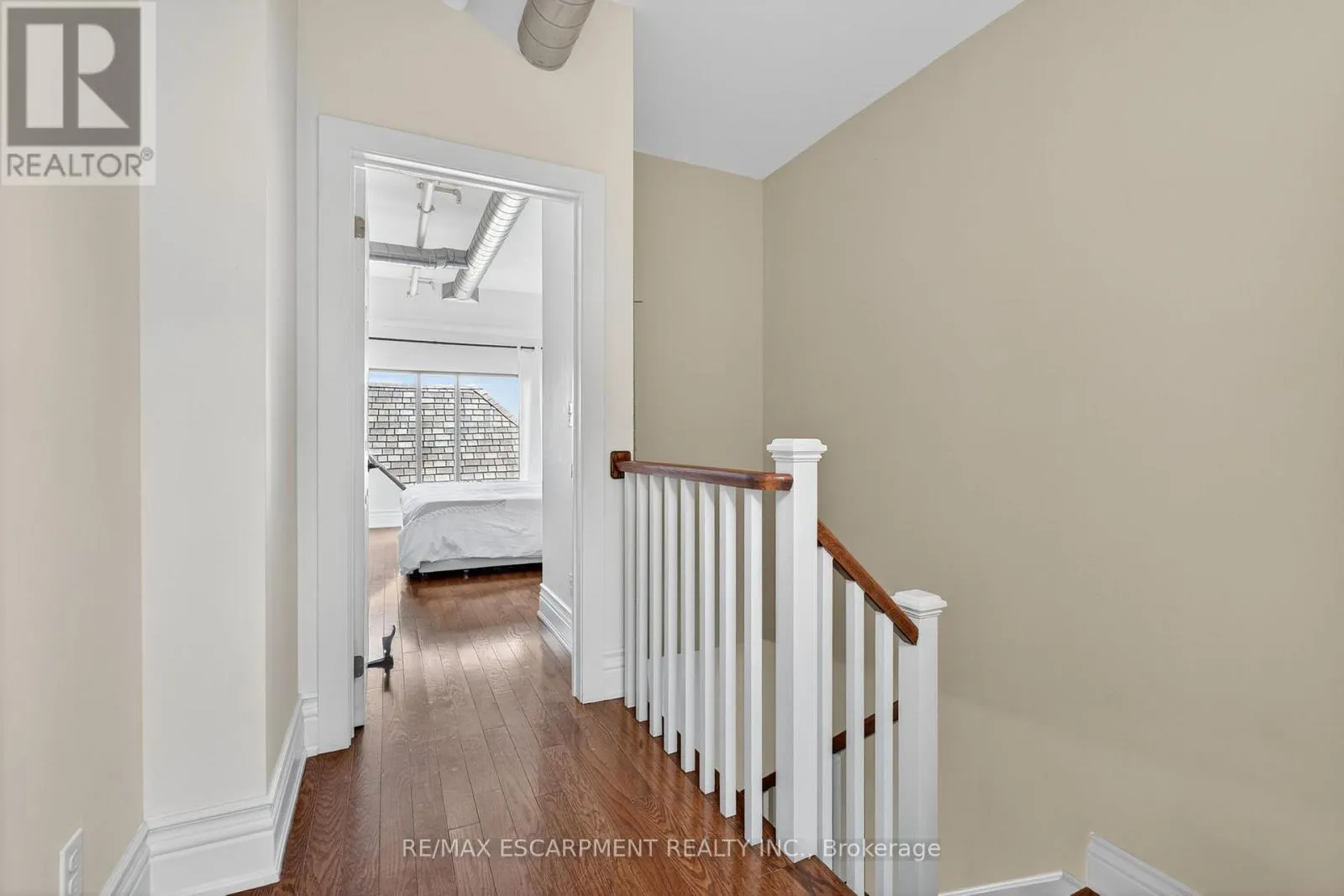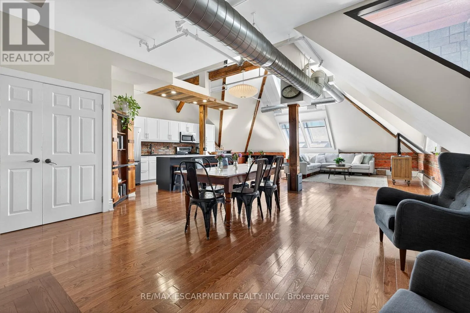 Wentworth St S Live in the grooviest space ever! Welcome to the historical heritage Stinson school lofts. The building is centrally located, close to downtown and the escarpment, between three Hamilton Hospitals, the GO Station, plenty of transit, bike lanes, an ideal location for commuters. This bright and open two-storey loft has gorgeous hardwood floors, exposed brick walls and beamed ceilings. The open concept main floor seamlessly connects the kitchen, dining, and living areas, with a vaulted ceiling that makes this huge space seem even bigger somehow, with stunning views through the skylight windows. This kitchen has a rustic charm and modern luxury, with a granite and quartz island complete with an integrated outlet for electronics. The exposed wooden beams and brick backsplash gives an old-world feel, while the updated appliances make the space contemporary. The main level has a floor laundry room and two-piece powder room as well. Upstairs, the primary suite has a massive window with escarpment views. There is a full ensuite bathroom and a huge walk-in closet as well. The second bedroom features more exposed brick and a large, screened skylight that can be opened. The second bedroom is large and can be used is a variety of ways. Welcome home! RSA. (id:27476)