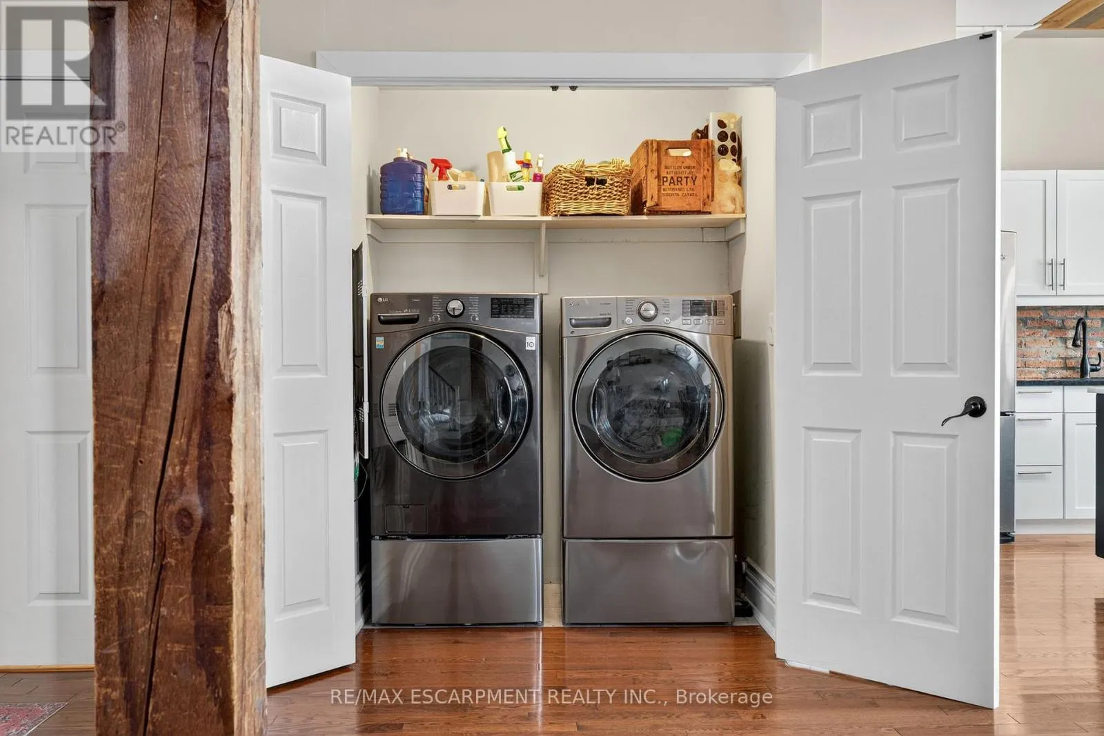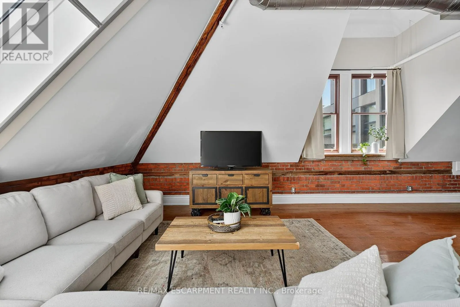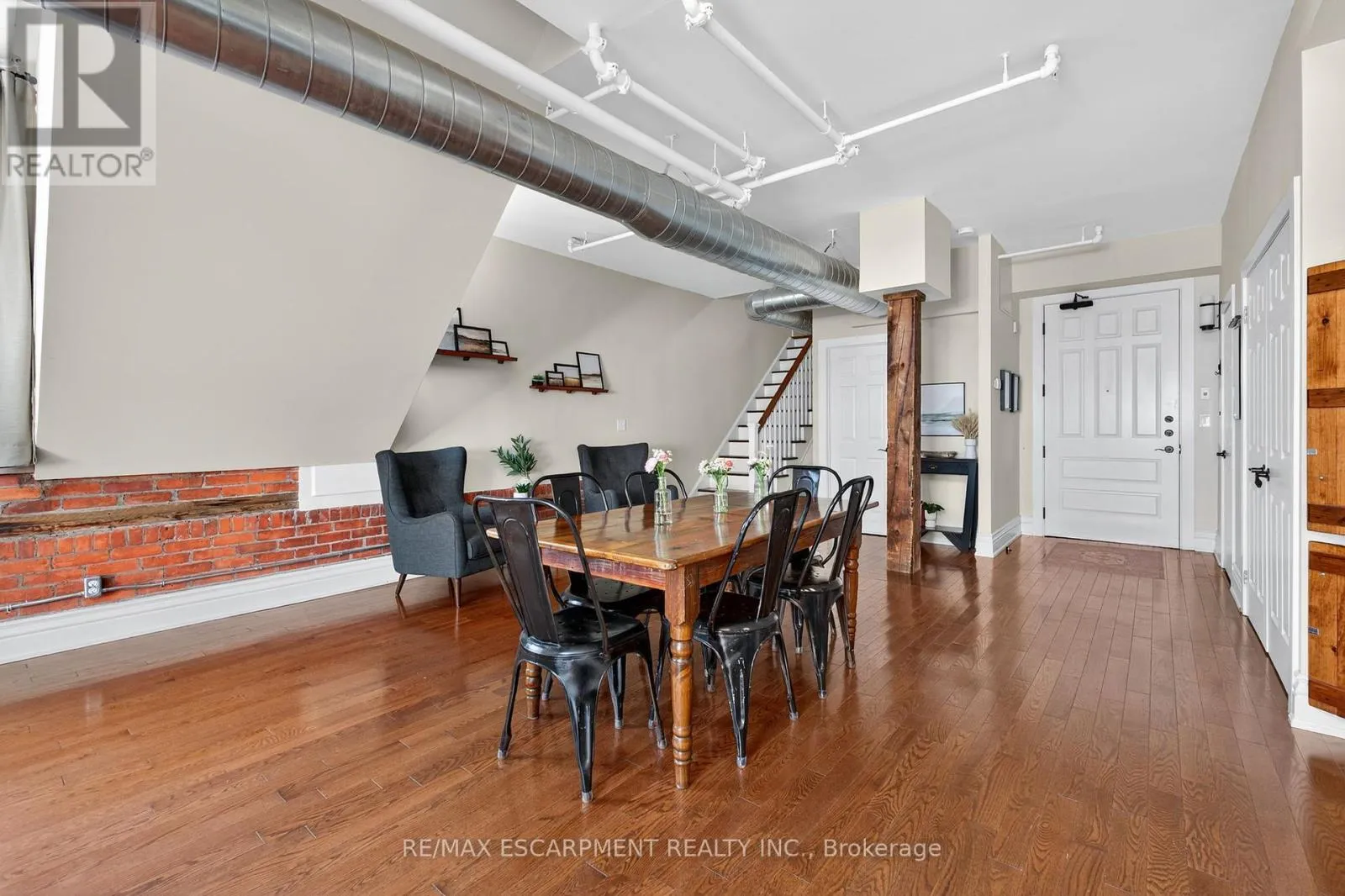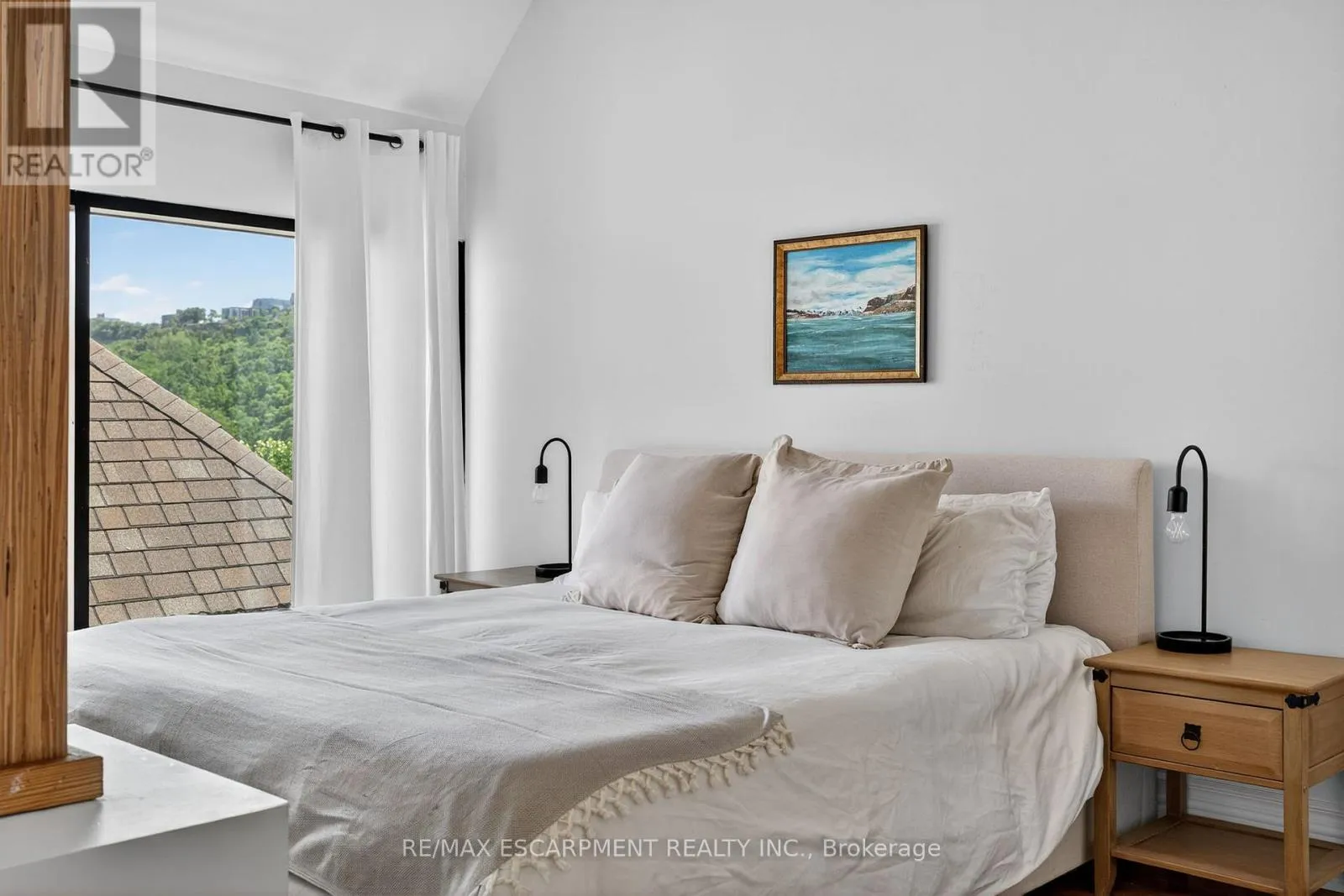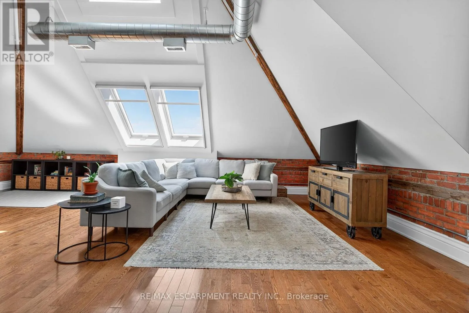 Wentworth St S Live in the grooviest space ever! Welcome to the historical heritage Stinson school lofts. The building is centrally located, close to downtown and the escarpment, between three Hamilton Hospitals, the GO Station, plenty of transit, bike lanes, an ideal location for commuters. This bright and open two-storey loft has gorgeous hardwood floors, exposed brick walls and beamed ceilings. The open concept main floor seamlessly connects the kitchen, dining, and living areas, with a vaulted ceiling that makes this huge space seem even bigger somehow, with stunning views through the skylight windows. This kitchen has a rustic charm and modern luxury, with a granite and quartz island complete with an integrated outlet for electronics. The exposed wooden beams and brick backsplash gives an old-world feel, while the updated appliances make the space contemporary. The main level has a floor laundry room and two-piece powder room as well. Upstairs, the primary suite has a massive window with escarpment views. There is a full ensuite bathroom and a huge walk-in closet as well. The second bedroom features more exposed brick and a large, screened skylight that can be opened. The second bedroom is large and can be used is a variety of ways. Welcome home! RSA. (id:27476)