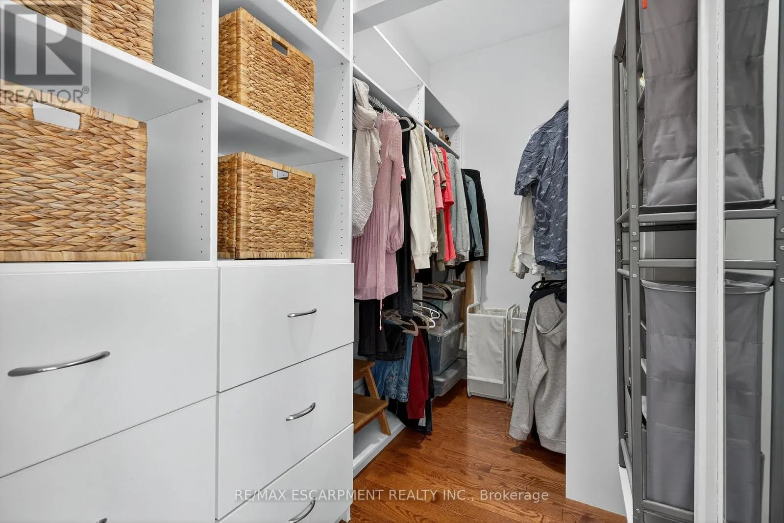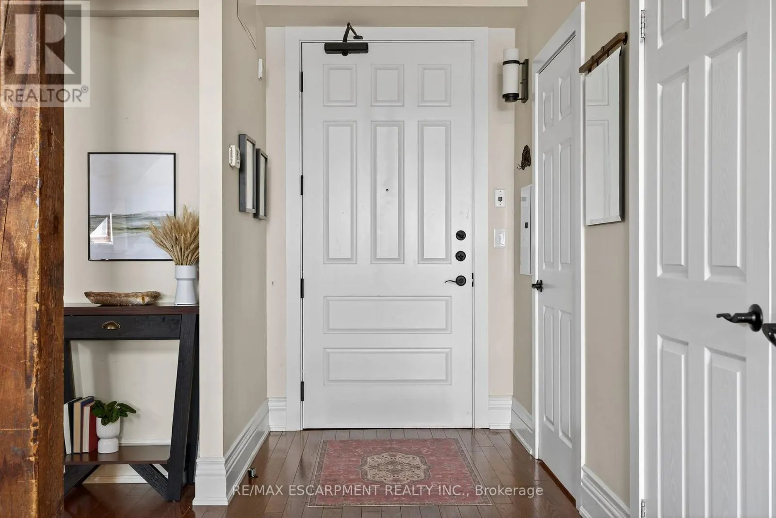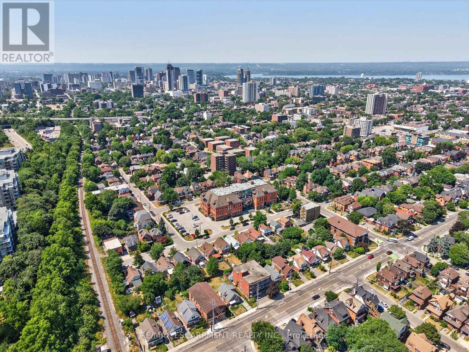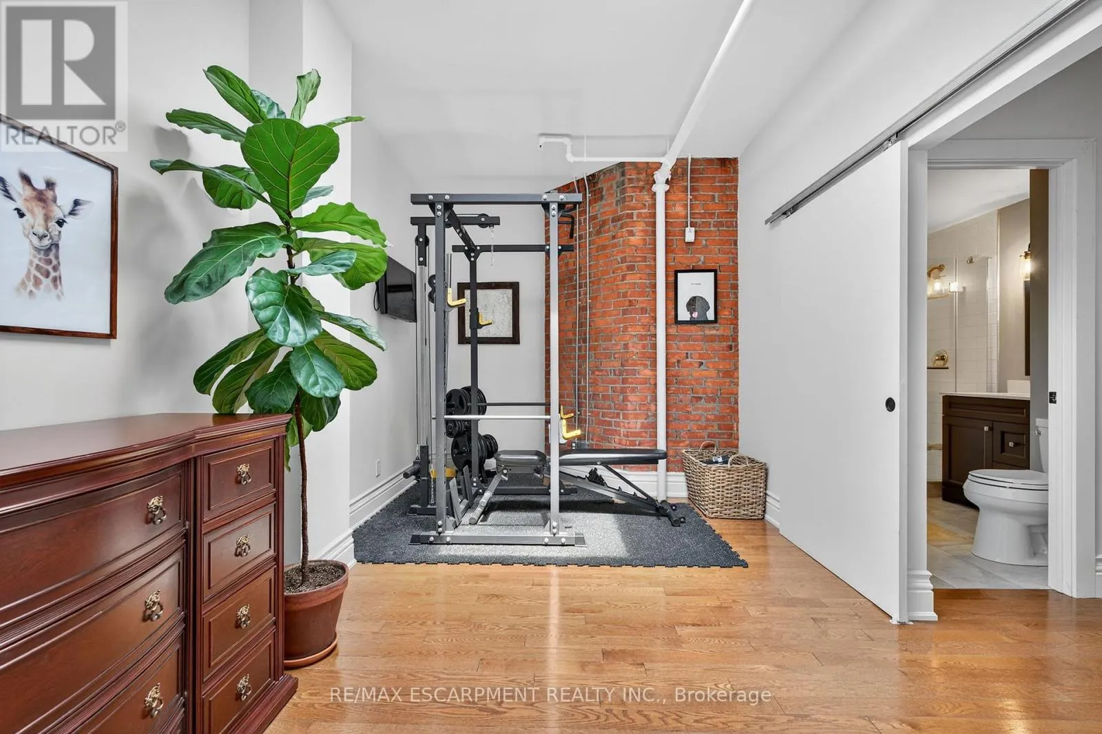 Wentworth St S Live in the grooviest space ever! Welcome to the historical heritage Stinson school lofts. The building is centrally located, close to downtown and the escarpment, between three Hamilton Hospitals, the GO Station, plenty of transit, bike lanes, an ideal location for commuters. This bright and open two-storey loft has gorgeous hardwood floors, exposed brick walls and beamed ceilings. The open concept main floor seamlessly connects the kitchen, dining, and living areas, with a vaulted ceiling that makes this huge space seem even bigger somehow, with stunning views through the skylight windows. This kitchen has a rustic charm and modern luxury, with a granite and quartz island complete with an integrated outlet for electronics. The exposed wooden beams and brick backsplash gives an old-world feel, while the updated appliances make the space contemporary. The main level has a floor laundry room and two-piece powder room as well. Upstairs, the primary suite has a massive window with escarpment views. There is a full ensuite bathroom and a huge walk-in closet as well. The second bedroom features more exposed brick and a large, screened skylight that can be opened. The second bedroom is large and can be used is a variety of ways. Welcome home! RSA. (id:27476)