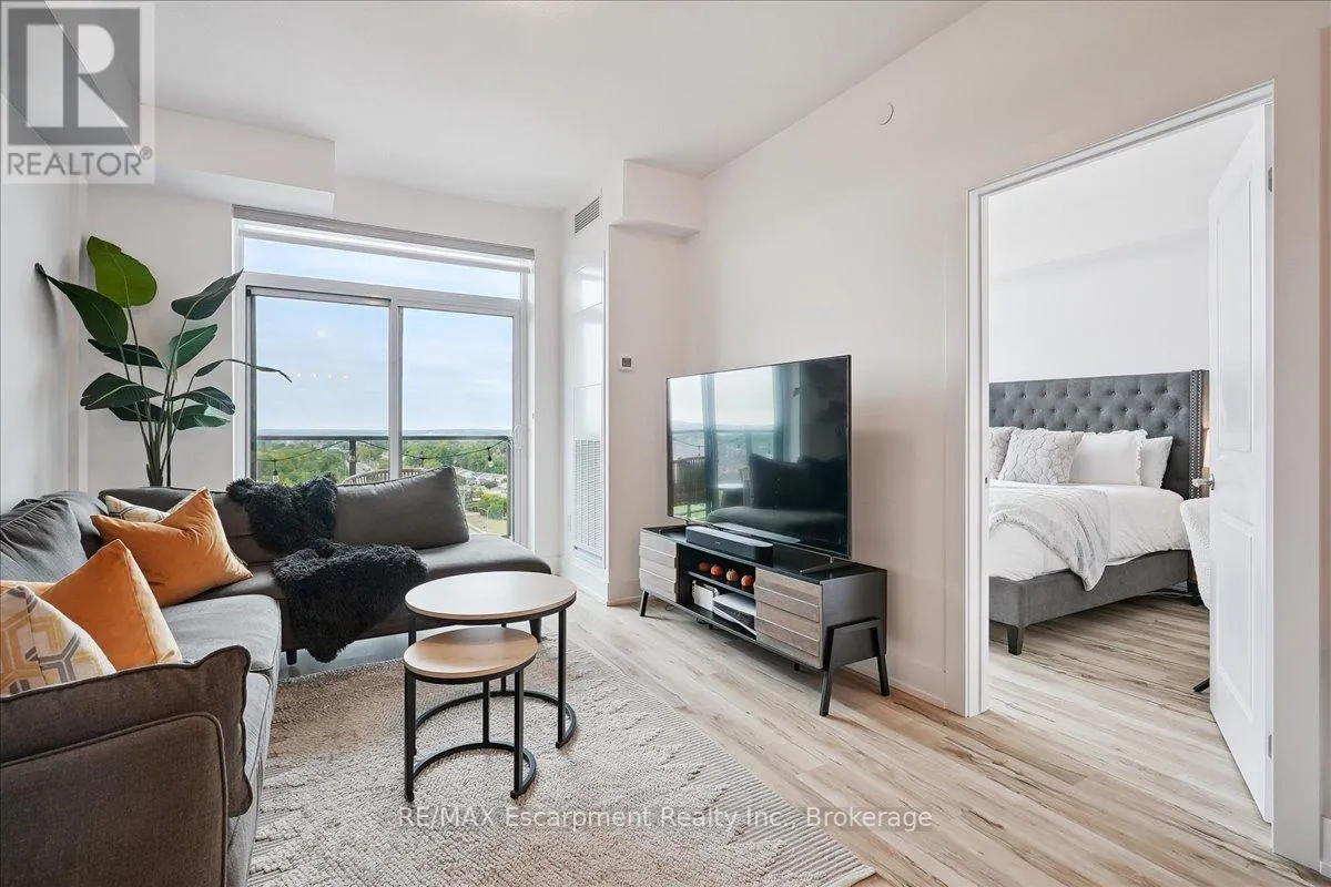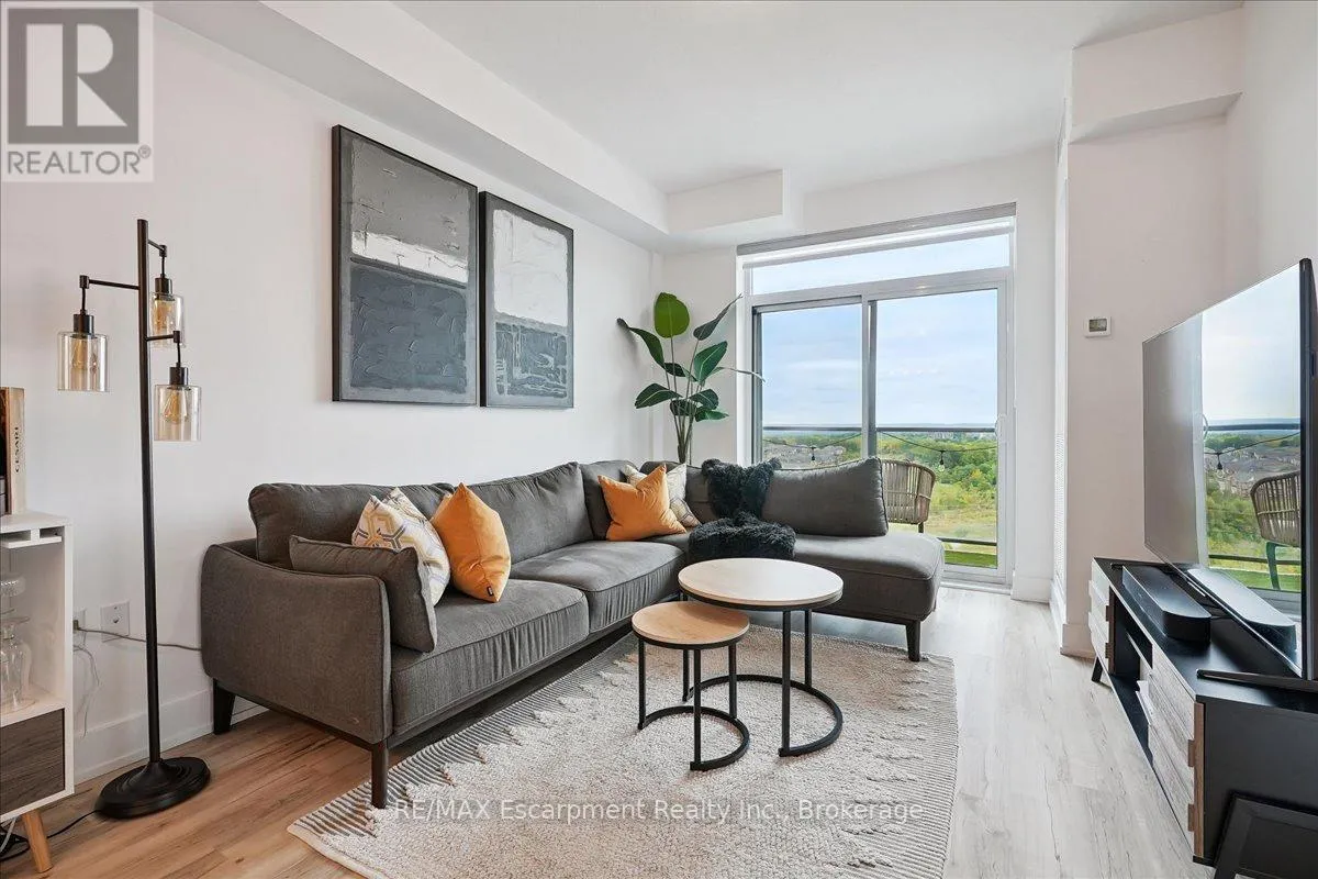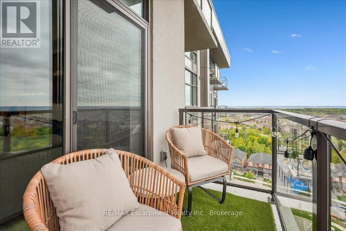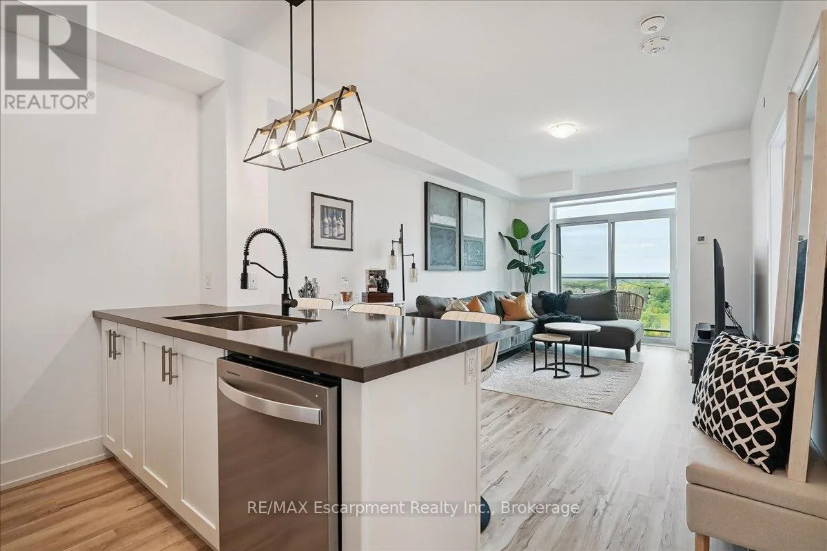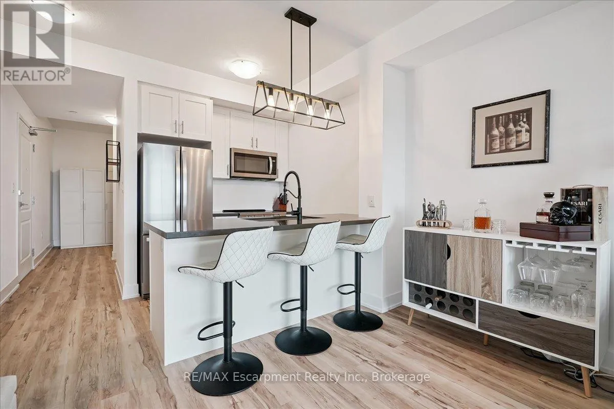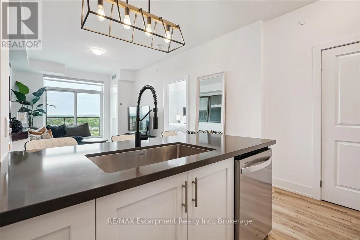 Dundas/Waterdown Rd LUXURIOUS ONE OF A KIND SPACIOUS LAYOUT with UNOBSTRUCTED VIEWS from your private balcony - 1 Bedroom Plus oversized den and 2 baths - the only model with 2 baths! Approximately 800 SF of living space and impressive HIGH END UPGRADES including Stainless-Steel appliances, built-in microwave/fan and a breakfast bar to accommodate 3-4 guests, 9' ceilings, quartz counters, designer lighting, modern blond-toned flooring throughout, ceiling-height cabinets, a separate walk-in laundry closet and so much more! The primary bedroom features a generous-sized walk-in closet, a 4-piece ensuite and that undeniable escarpment view! Amenities include a fabulous community and games room, theatre, bike storage room, and roof top with BBQs. The GO train is minutes away and access to all highways. Energy efficient geothermal building means low monthly utilities. Luxury living and lifestyle at its finest! 1 underground parking spot and 1 locker! (id:27476)