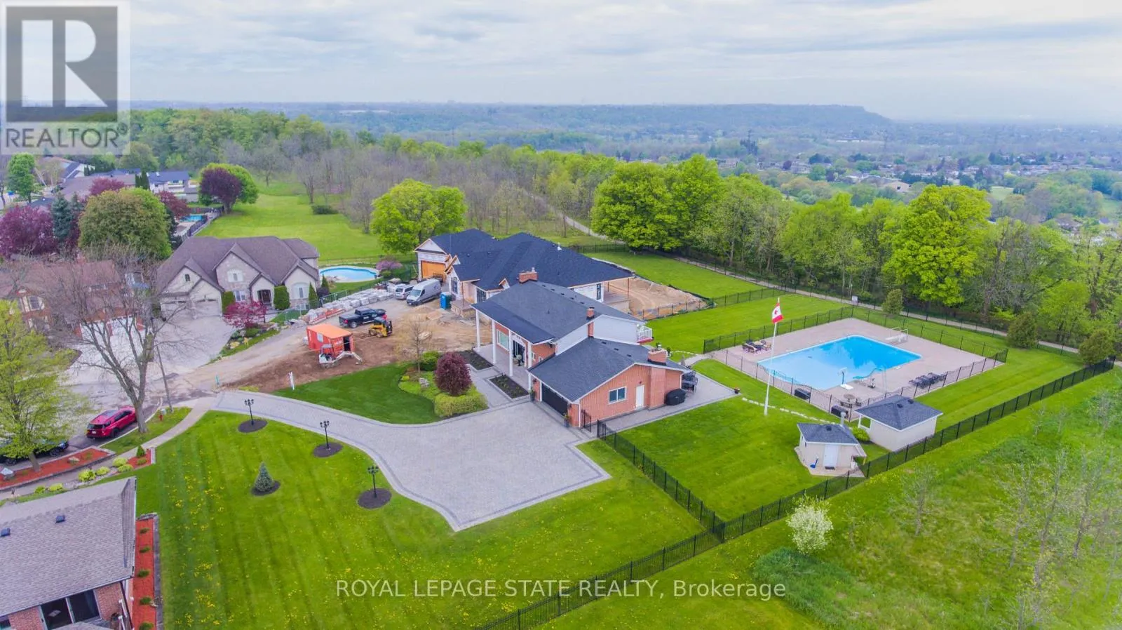 Cross Streets: Audubon St N. ** Directions: Mud St W to Paramount Dr - right on Audubon St N - left at Azalea Crt. Perched atop the stunning Niagara Escarpment, this beautifully maintained home offers seasonal panoramic views of Lake Ontario and the Toronto skyline. Rarely available, it features over 5,100 sq. ft. of thoughtfully designed living space across three finished levels, with custom touches throughout. Enjoy private access to the Bruce Trail, with waterfalls and scenic hikes just steps from your backyard. The main floor features new hardwood floors, a custom staircase, and stylish lighting. A formal living room with a cozy wood-burning fireplace and an adjacent dining room set the stage for elegant entertaining. The chef's kitchen offers custom cabinetry and flows seamlessly into the family room with a new gas fireplace for added warmth and ambiance. Upstairs, find four spacious bedrooms, including a luxurious primary suite with a walk-in closet, spa-like ensuite, and private balcony. The bright, fully finished lower level includes large windows, custom woodwork, a new gas fireplace, a bedroom, and kitchenette-ideal for a nanny, in-law, or multi-gen suite with its own entrance. Explore options to sever a second lot or build an auxiliary unit. Outside, your private oasis features a unique 30x60 in-ground pool (16 ft. deep), elegant wrought iron fencing, a charming pool house, and custom shed-perfect for summer entertaining. Recent updates include new power blinds, 2023 HVAC systems, a refreshed porch, and pool/landscape upgrades. Enjoy nature and city convenience in this rare escarpment gem. (id:27476)