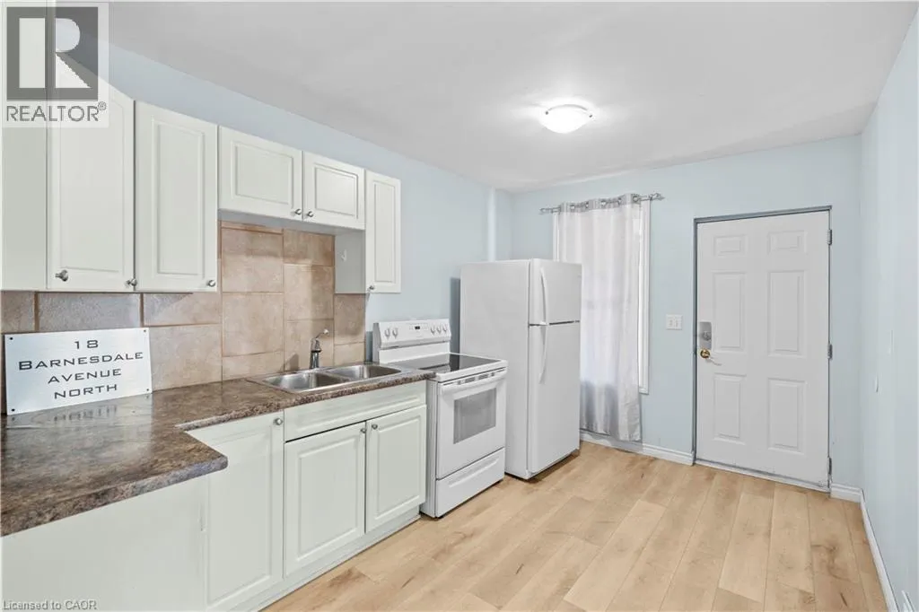 King St E turn right onto Barnesdale Av N Welcome to 18 Barnesdale Av North! ATTENTION INVESTORSâ¦.3 UNITS ABOVE GRADE!! Vacant and nicely renovated, PLUS a detached block garage!!! Unit mix is: Main floor 1 x 2 bedroom unit, 2nd Floor 1 x 2 bedroom unit, 3rd floor 1 x 1 bedroom unit. All units have a 4 piece bath. First and second level have a shared main foyer with separate entrances into each unit, third level accessed by steel fire escape. Updates and features include; three newer modern kitchens, three remodeled four piece baths, all newer wide plank laminate flooring throughout, and brand new vinyl plank on Main floor (2025), vinyl windows, roof re-shingled 2019, beautiful front porch, block garage with hydro for extra income and rear parking. Unfinished basement with separate entrance for laundry and utilities (plus rough in bath), 200 amp service on circuit breakers, interconnected smoke detectors, interior sewer line replaced 2024. A+ location! Close to schools, parks, shopping, walk to future LRT, Tim Hortonâs Field, Bernie Morelli Recreation Centre (indoor pool & track). Property is 100% turn-key and is in move in ready condition! Establish your own tenants and rents, Great investment opportunity! (id:27476)