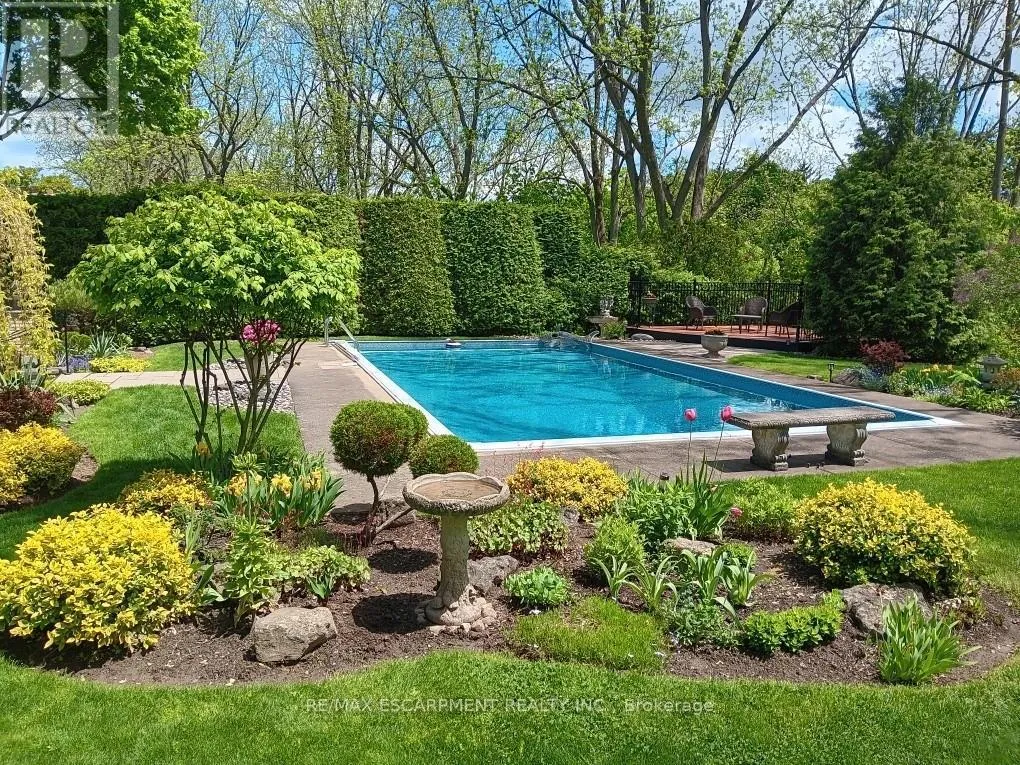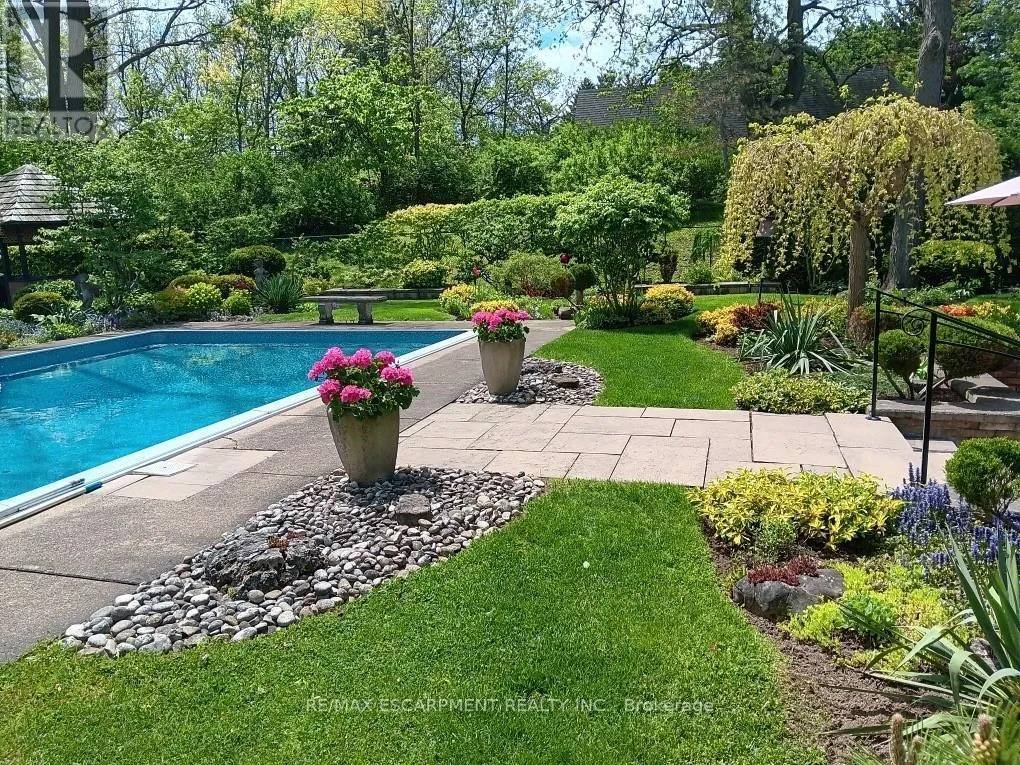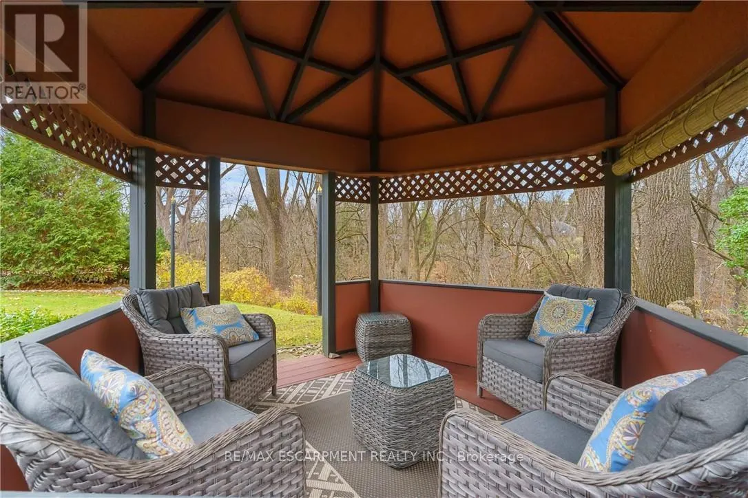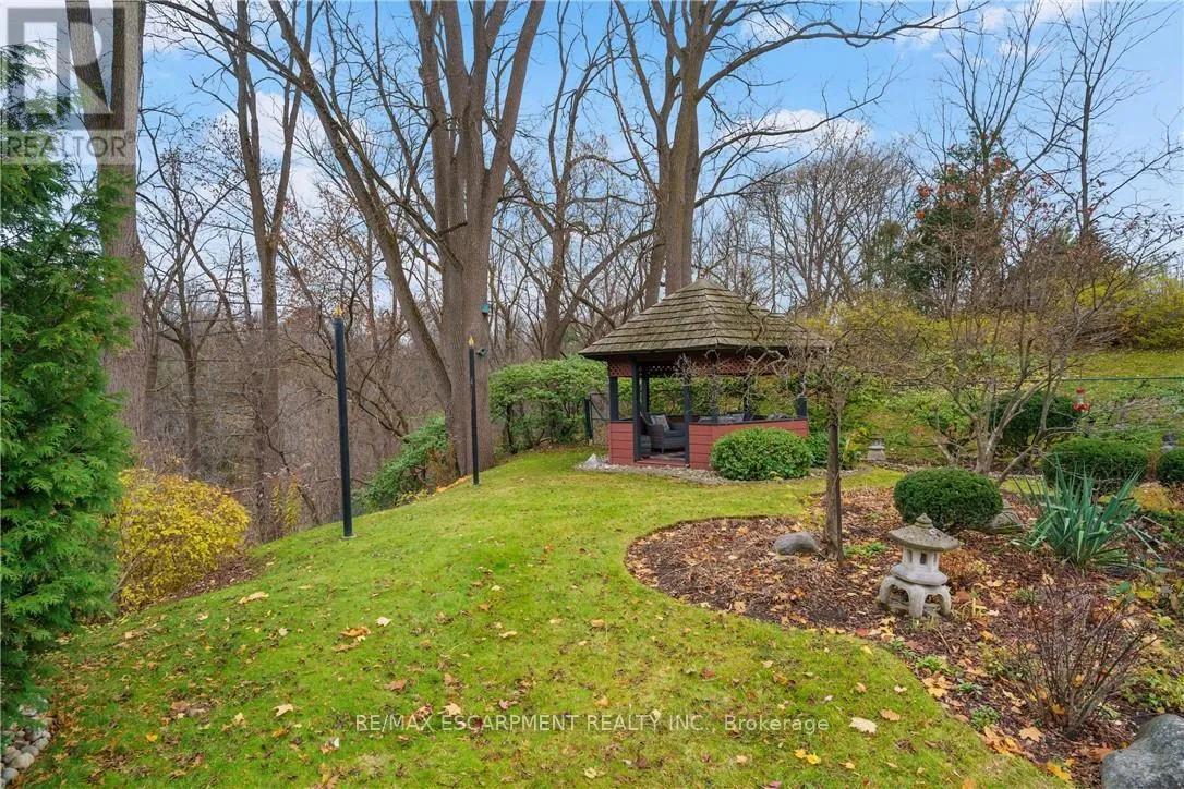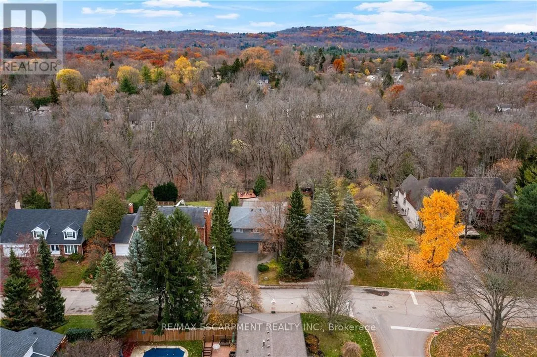 Cross Streets: TALLY HO/OVERFIELD. ** Directions: GOVERNORS RD TO OVERFIELD ST TO WALNUT GROVE. Nature Lovers Dream! This one-of-a-kind 4-level side split offers 4 bedrooms and 2.5 bathrooms on an extraordinary 200+ ft deep Dundas Valley ravine lot with unmatched privacy. In prestigious Highland Hills, the property boasts lush perennial gardens and breathtaking Spring Creek views from a custom lookout deck, along with an inground pool and gazebo that create a truly special backyard oasis! Step into the spacious foyer where the main floor features a bright family room with floor-to-ceiling windows, a walk-out to a covered patio overlooking the ravine, a convenient powder room, and a wet bar with rear yard access for exceptional indoor/outdoor living. The second floor offers wool carpeting throughout the sunlit living and dining rooms, where a stunning gas fireplace with a marble mantle adds warmth and elegance, and sliding doors lead directly to the backyard sanctuary. A pocket door opens to the inviting eat-in kitchen, a true delight for any home chef. This space features sleek black appliances including cooktop, built-in wall oven and microwave, with ample cabinetry, and a perfect setting for warm gatherings. The third floor showcases the primary bedroom with a 3 piece ensuite and sliding doors to a private balcony with unparalleled panoramic ravine views. Three additional bedrooms with hardwood floors and the main bathroom with a jetted tub complete this level. The finished basement includes a spacious rec room ideal for entertaining, a pool table area, a laundry room with a shower, a utility room with a workbench-all with close to 9 ft ceilings!-and abundant crawl-space storage. Additional highlights include a 4-car driveway, 2-car garage with inside entry, and only one neighbouring property, with Conservation land beside the home for added privacy. A truly rare find, close to walking trails and minutes from downtown. (id:27476)