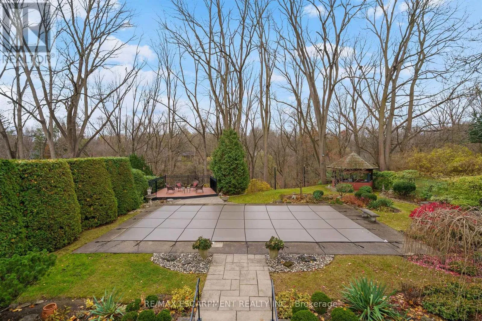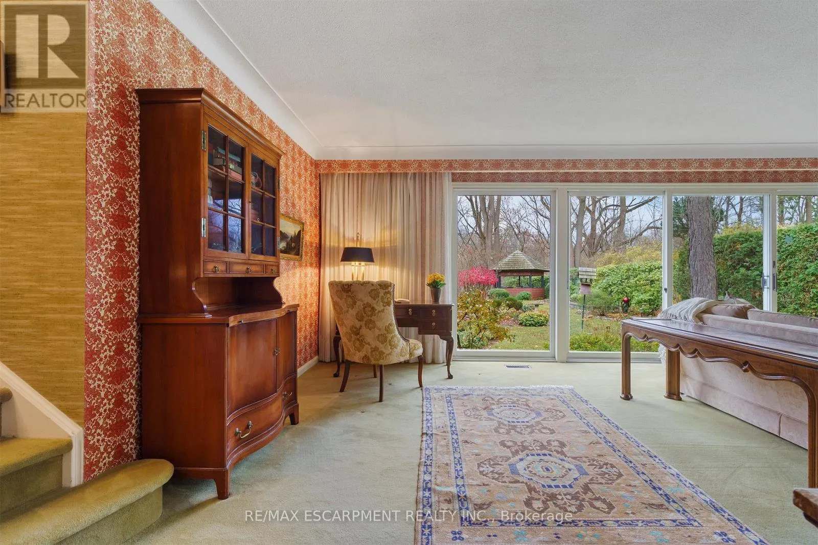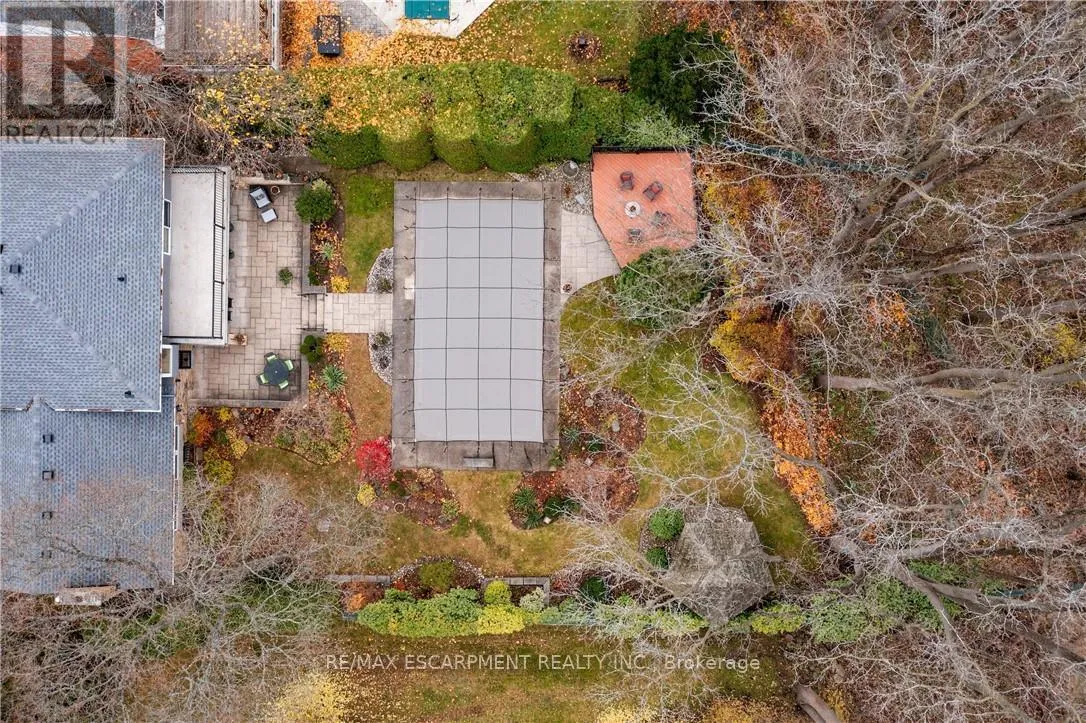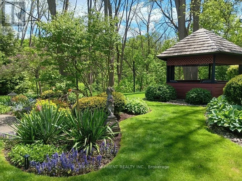Cross Streets: TALLY HO/OVERFIELD. ** Directions: GOVERNORS RD TO OVERFIELD ST TO WALNUT GROVE. Nature Lovers Dream! This one-of-a-kind 4-level side split offers 4 bedrooms and 2.5 bathrooms on an extraordinary 200+ ft deep Dundas Valley ravine lot with unmatched privacy. In prestigious Highland Hills, the property boasts lush perennial gardens and breathtaking Spring Creek views from a custom lookout deck, along with an inground pool and gazebo that create a truly special backyard oasis! Step into the spacious foyer where the main floor features a bright family room with floor-to-ceiling windows, a walk-out to a covered patio overlooking the ravine, a convenient powder room, and a wet bar with rear yard access for exceptional indoor/outdoor living. The second floor offers wool carpeting throughout the sunlit living and dining rooms, where a stunning gas fireplace with a marble mantle adds warmth and elegance, and sliding doors lead directly to the backyard sanctuary. A pocket door opens to the inviting eat-in kitchen, a true delight for any home chef. This space features sleek black appliances including cooktop, built-in wall oven and microwave, with ample cabinetry, and a perfect setting for warm gatherings. The third floor showcases the primary bedroom with a 3 piece ensuite and sliding doors to a private balcony with unparalleled panoramic ravine views. Three additional bedrooms with hardwood floors and the main bathroom with a jetted tub complete this level. The finished basement includes a spacious rec room ideal for entertaining, a pool table area, a laundry room with a shower, a utility room with a workbench-all with close to 9 ft ceilings!-and abundant crawl-space storage. Additional highlights include a 4-car driveway, 2-car garage with inside entry, and only one neighbouring property, with Conservation land beside the home for added privacy. A truly rare find, close to walking trails and minutes from downtown. (id:27476)