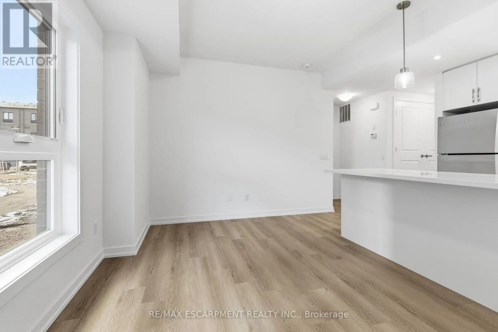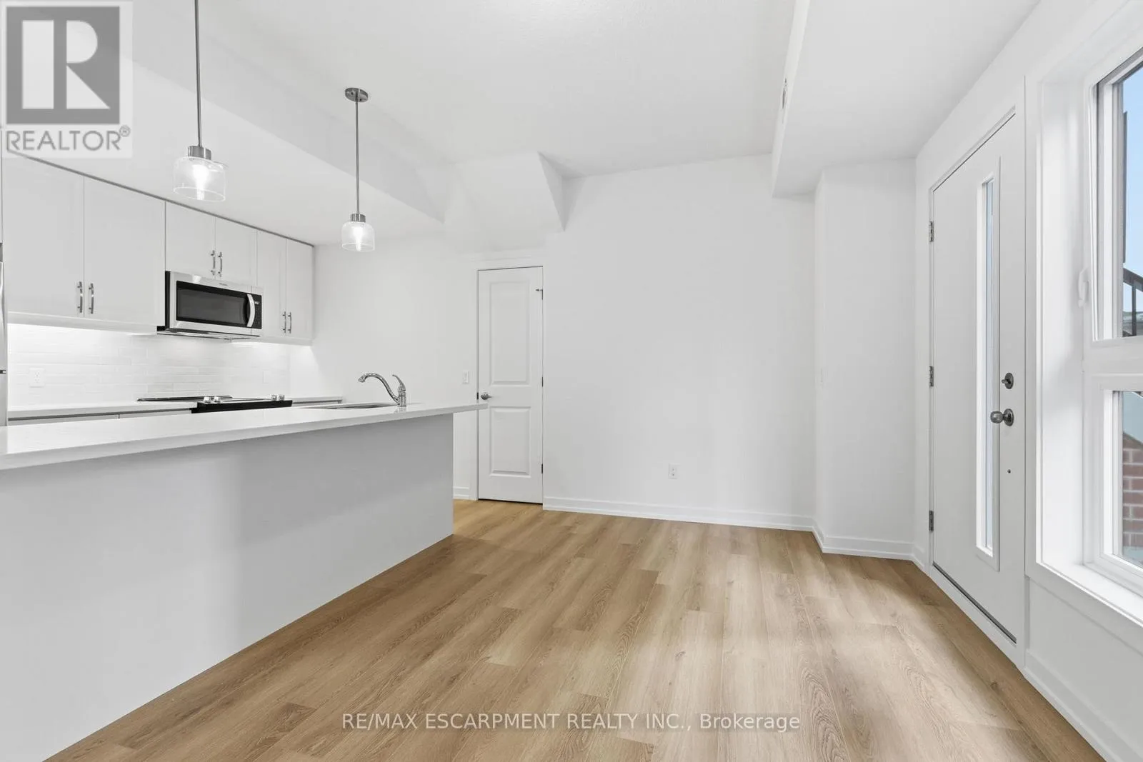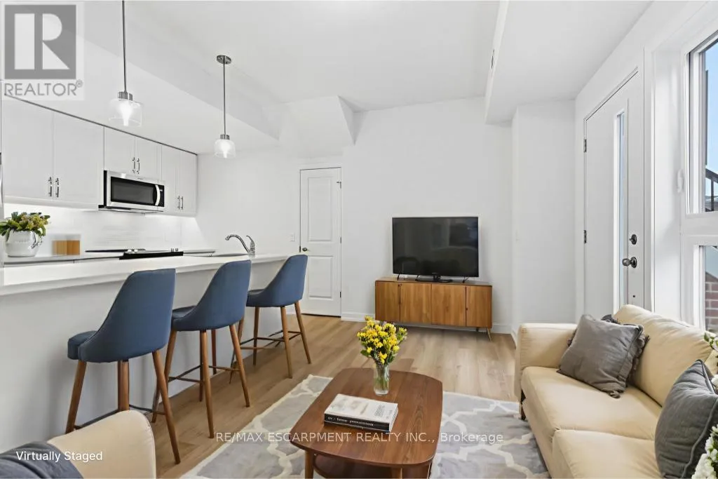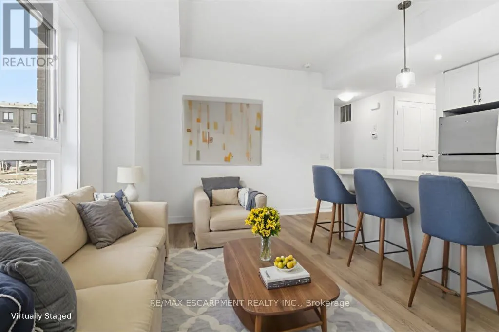 Cross Streets: Burke st. ** Directions: Dundas St E to Burke St to Kenesky Dr. Newly built and never lived in! This main-floor townhome is ideally located just minutes from downtown Waterdown, shopping and restaurants. This modern, upgraded one-bedroom home is completely carpet-free, featuring an open-concept layout and a stylish kitchen with beautiful quartz counters, an island, pendant and valance lighting and vinyl flooring throughout. The sun-filled living room offers a bright and welcoming space, while the bedroom provides good closet space. Thoughtful design elements add convenient storage nooks, ensuring no space goes to waste. Enjoy the ease of in-suite laundry and a four-piece bathroom that completes this fantastic living space. The garage with inside entry means you'll never have to deal with the weather. The area offers hiking trails, excellent access to highways and transit and close proximity to the Aldershot GO Station. RSA. (id:27476)
