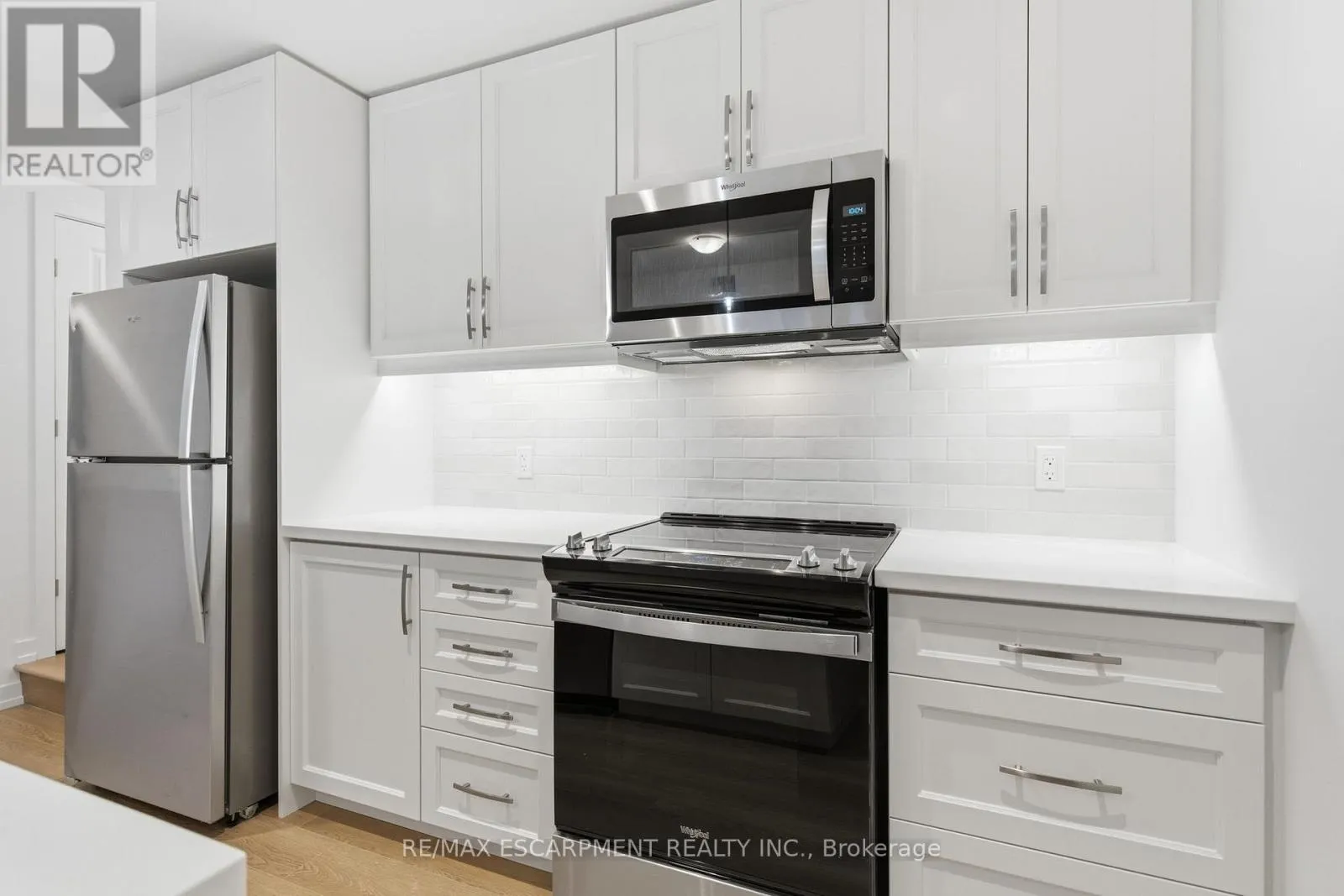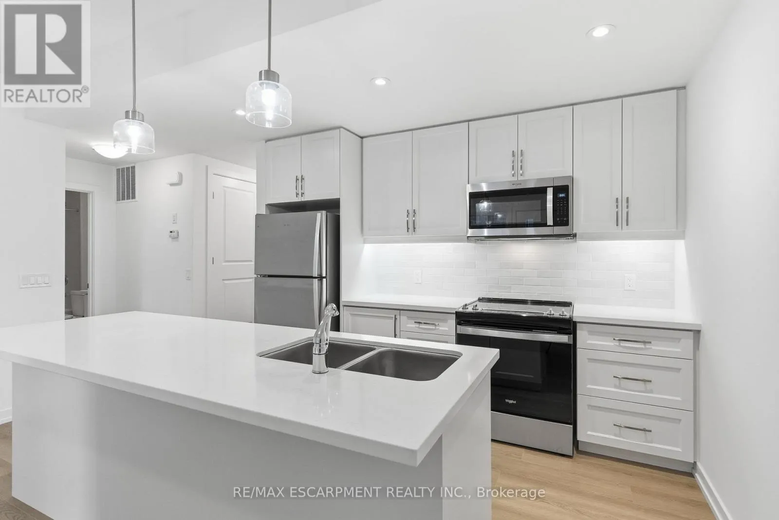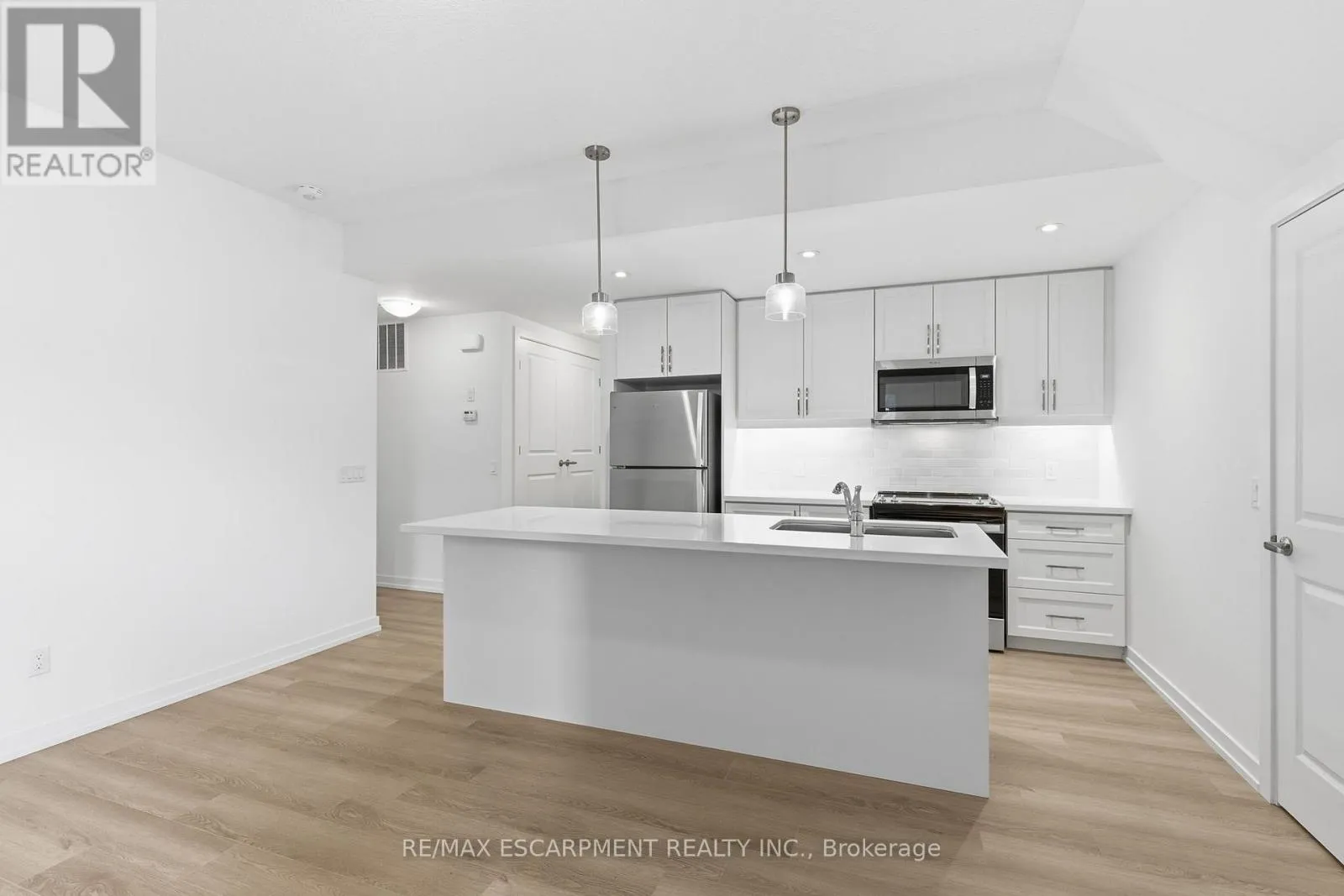 Cross Streets: Burke st. ** Directions: Dundas St E to Burke St to Kenesky Dr. Newly built and never lived in! This main-floor townhome is ideally located just minutes from downtown Waterdown, shopping and restaurants. This modern, upgraded one-bedroom home is completely carpet-free, featuring an open-concept layout and a stylish kitchen with beautiful quartz counters, an island, pendant and valance lighting and vinyl flooring throughout. The sun-filled living room offers a bright and welcoming space, while the bedroom provides good closet space. Thoughtful design elements add convenient storage nooks, ensuring no space goes to waste. Enjoy the ease of in-suite laundry and a four-piece bathroom that completes this fantastic living space. The garage with inside entry means you'll never have to deal with the weather. The area offers hiking trails, excellent access to highways and transit and close proximity to the Aldershot GO Station. RSA. (id:27476)