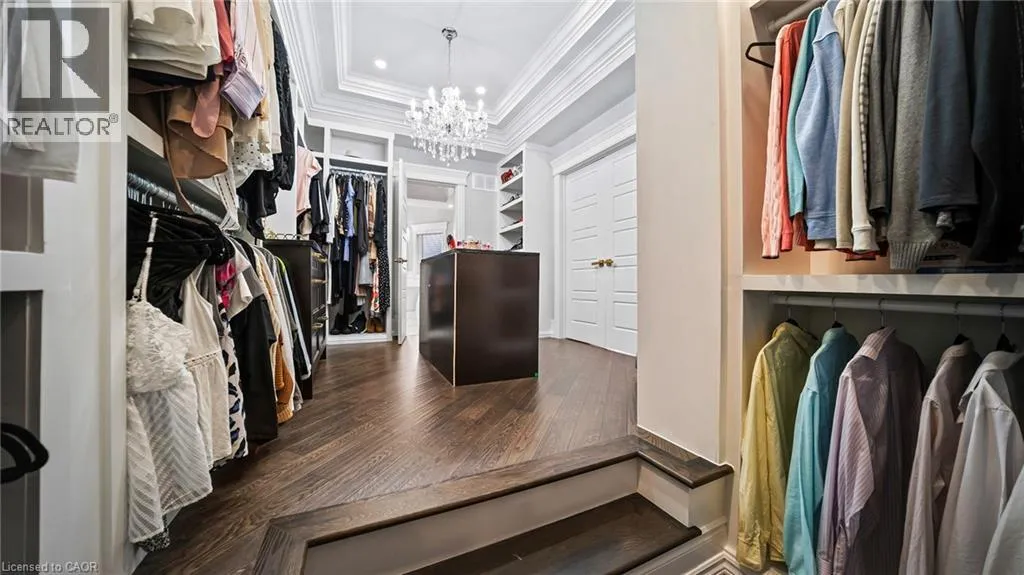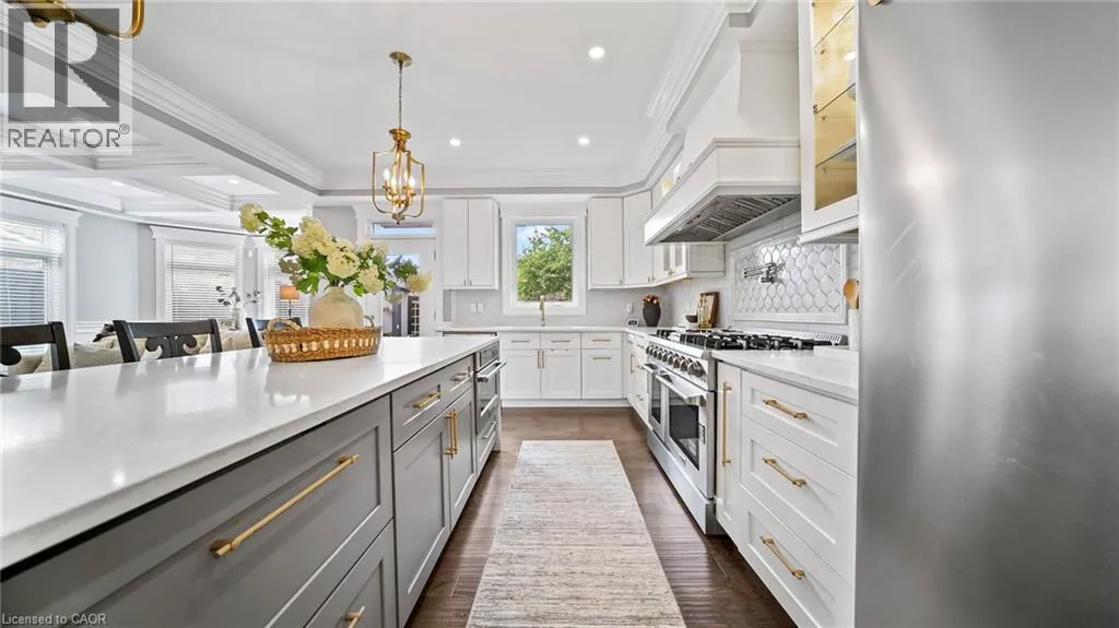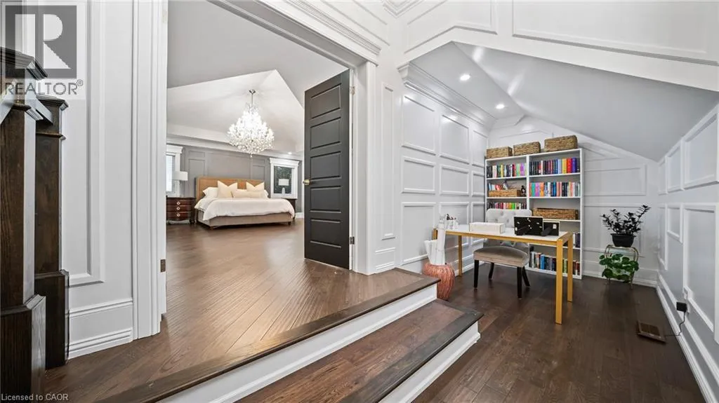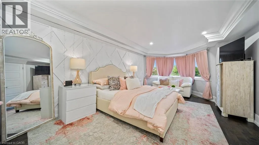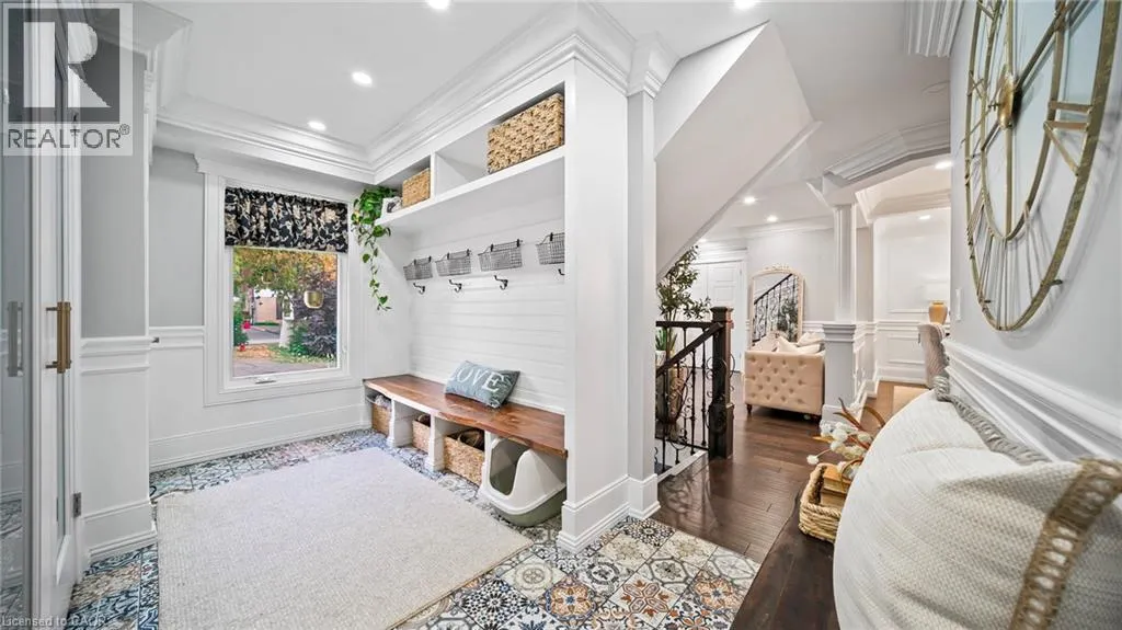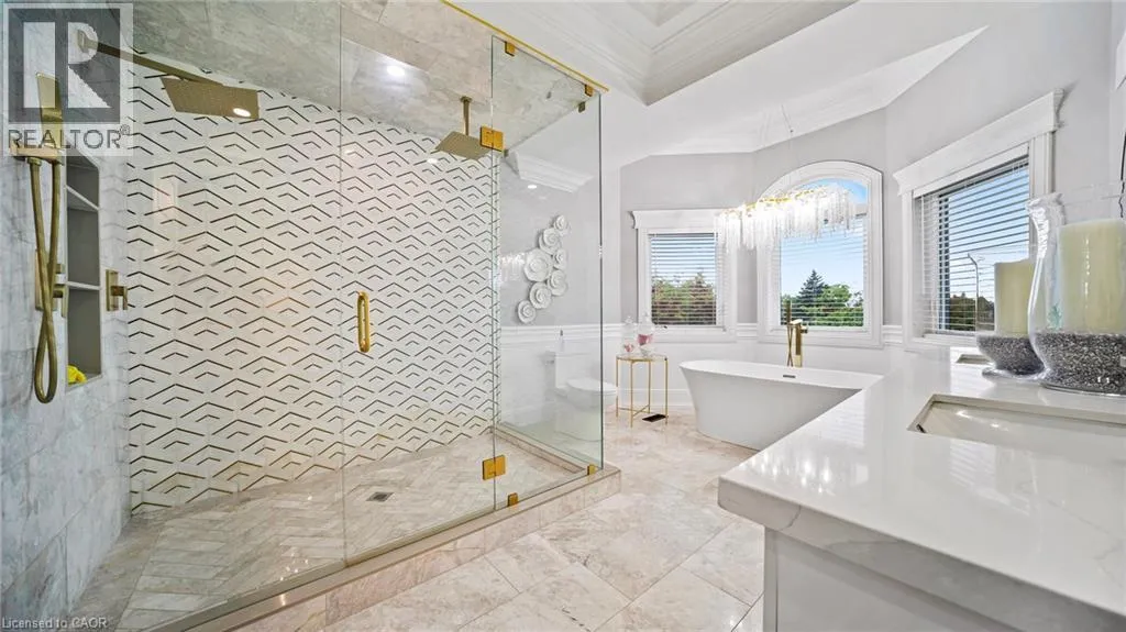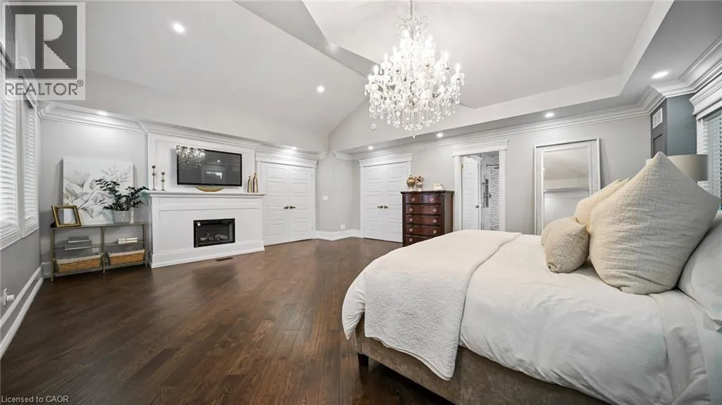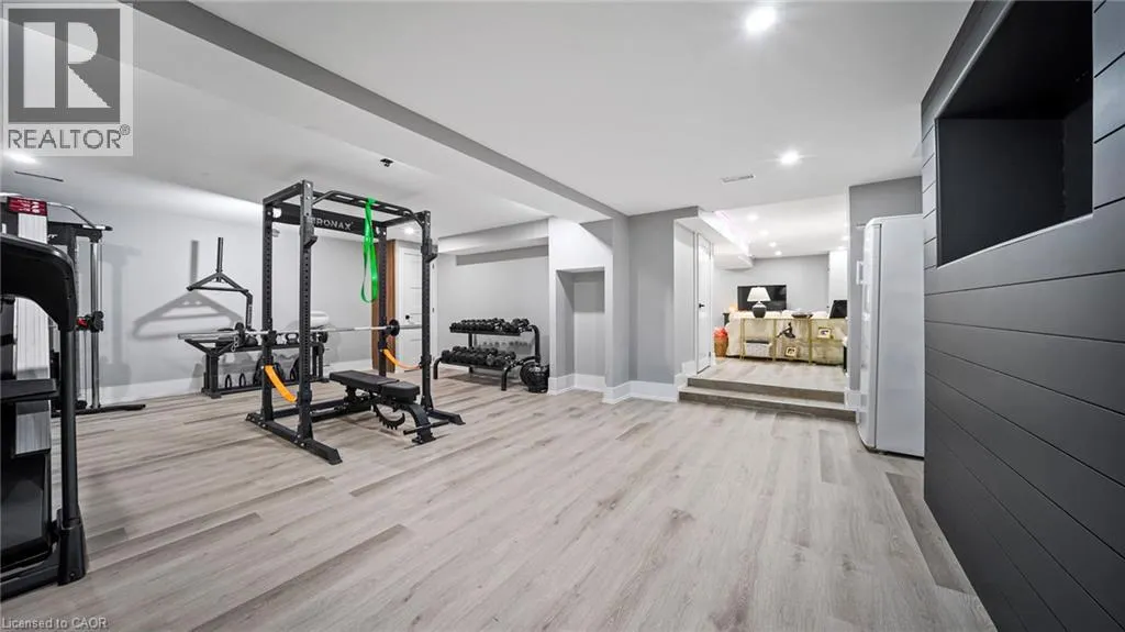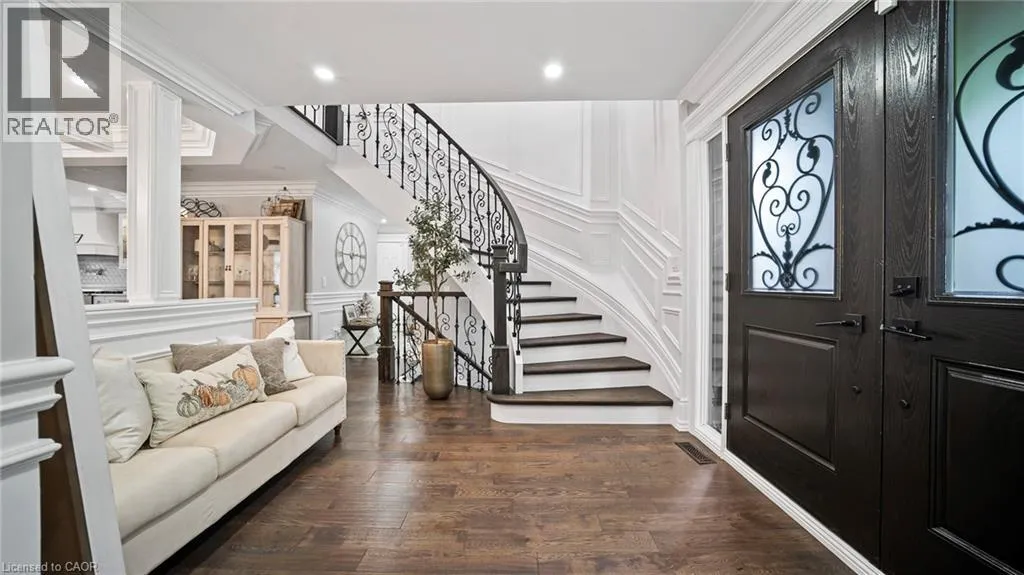Mud St W/First Rd W Welcome to this stunningly renovated 4+1 bedroom, 5-bathroom residence offering over 3,000 sq. ft. above grade, complemented by a fully finished basement. Every detail has been thoughtfully curated, beginning with the striking stone exterior and professionally landscaped grounds, complete with a concrete driveway. Step through the double doors into an expansive open-concept main level adorned with rich hardwood floors, timeless wainscoting, and elegant coffered ceilings. The formal dining room flows seamlessly into a grand family room and a chef-inspired kitchen featuring premium appliances, quartz countertops, and a convenient butlerâs pantry with a secondary fridge. Ascend the wrought iron staircase to the second floor, where youâll find three spacious bedrooms, three full bathrooms, and a practical laundry room. A cantilever balcony at the end of the hallway adds a touch of Parisian charm. The third level is dedicated to the luxurious primary suite, complete with a spa-like ensuite and a custom-designed walk-in closet with built-in cabinetryâtruly a dream retreat. Just outside the suite, a versatile bonus space awaits, ideal for a home office, nursery, or reading nook. The fully finished basement is designed for relaxation and wellness, featuring luxury vinyl plank flooring, a cozy recreation area, a fully equipped sauna, and a gym. The tandem garage comfortably accommodates two vehicles, with soaring ceilings that allow for the future addition of a car lift. Perfectly located near schools, shopping, recreational facilities, dog parks, Valley Park, and major highways, this exceptional home combines luxury, comfort, and convenience. (id:27476)