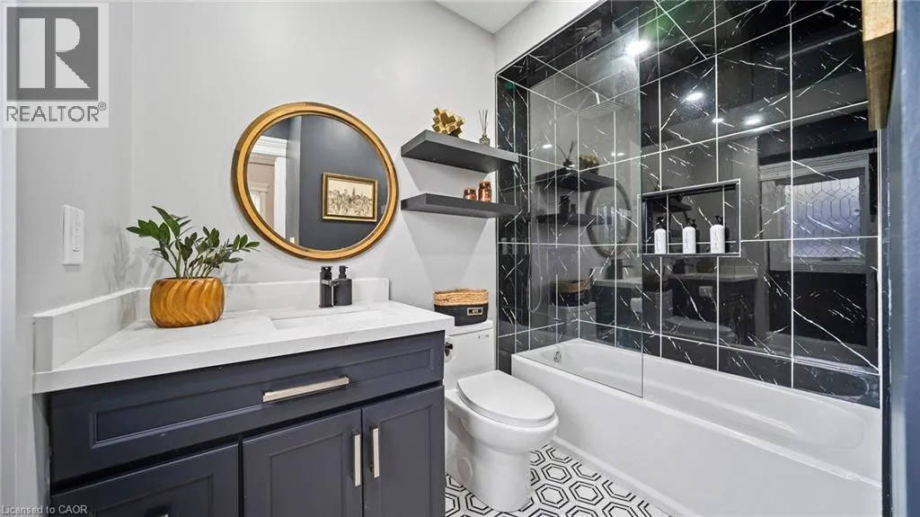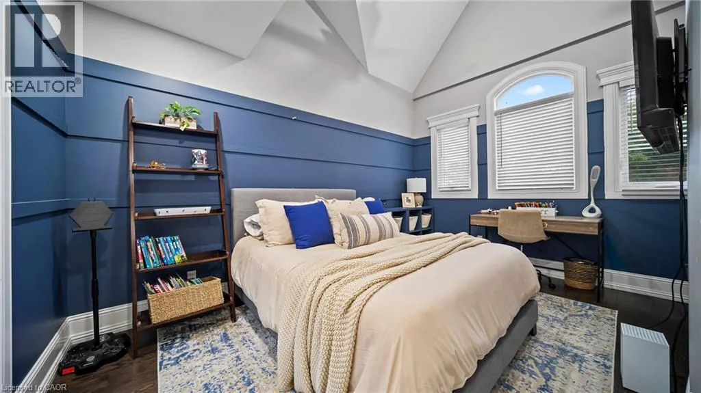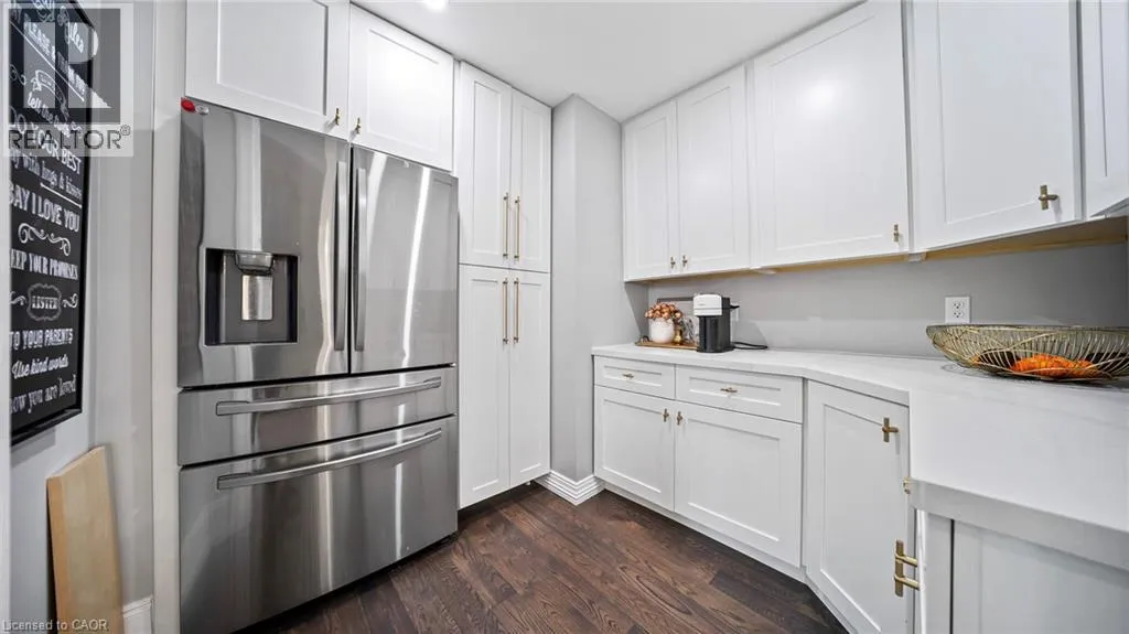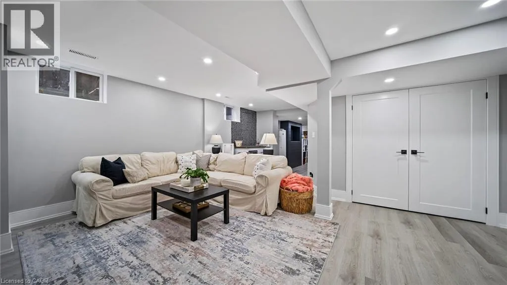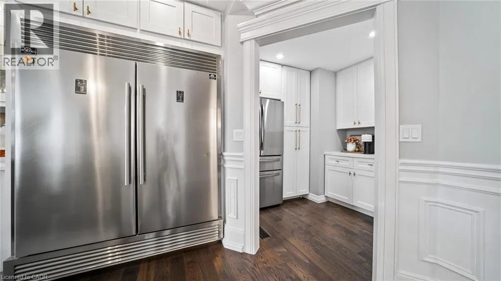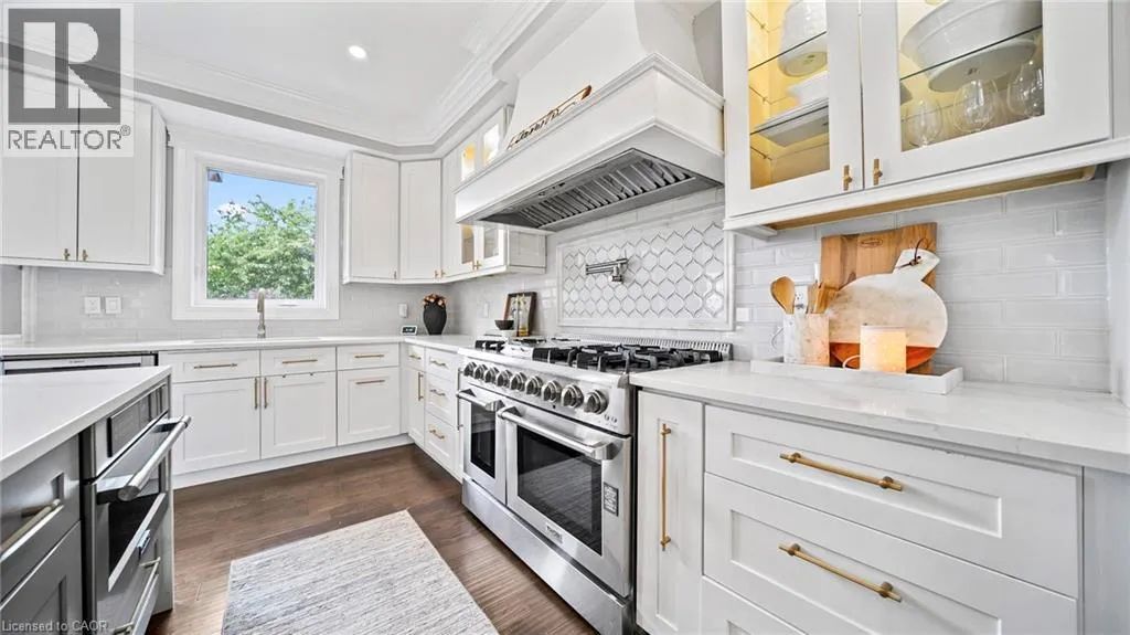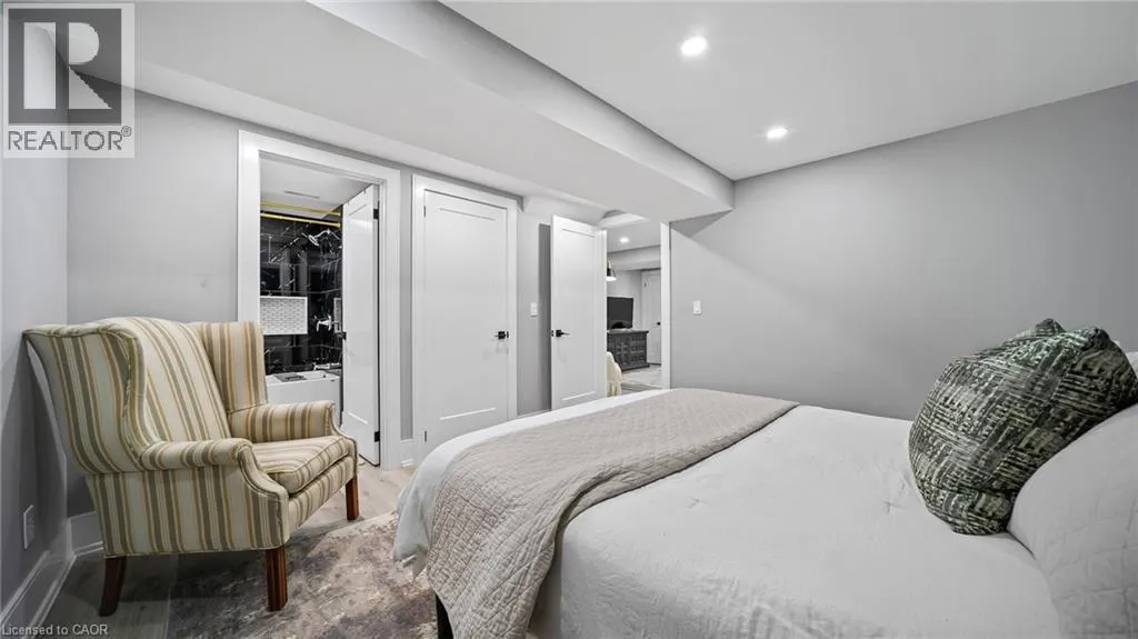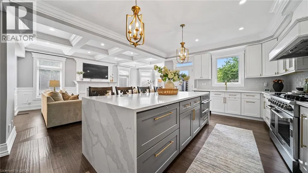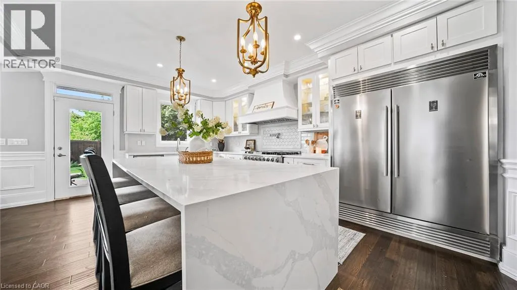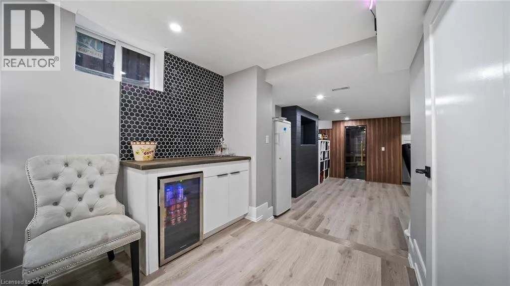 Mud St W/First Rd W Welcome to this stunningly renovated 4+1 bedroom, 5-bathroom residence offering over 3,000 sq. ft. above grade, complemented by a fully finished basement. Every detail has been thoughtfully curated, beginning with the striking stone exterior and professionally landscaped grounds, complete with a concrete driveway. Step through the double doors into an expansive open-concept main level adorned with rich hardwood floors, timeless wainscoting, and elegant coffered ceilings. The formal dining room flows seamlessly into a grand family room and a chef-inspired kitchen featuring premium appliances, quartz countertops, and a convenient butlerâs pantry with a secondary fridge. Ascend the wrought iron staircase to the second floor, where youâll find three spacious bedrooms, three full bathrooms, and a practical laundry room. A cantilever balcony at the end of the hallway adds a touch of Parisian charm. The third level is dedicated to the luxurious primary suite, complete with a spa-like ensuite and a custom-designed walk-in closet with built-in cabinetryâtruly a dream retreat. Just outside the suite, a versatile bonus space awaits, ideal for a home office, nursery, or reading nook. The fully finished basement is designed for relaxation and wellness, featuring luxury vinyl plank flooring, a cozy recreation area, a fully equipped sauna, and a gym. The tandem garage comfortably accommodates two vehicles, with soaring ceilings that allow for the future addition of a car lift. Perfectly located near schools, shopping, recreational facilities, dog parks, Valley Park, and major highways, this exceptional home combines luxury, comfort, and convenience. (id:27476)