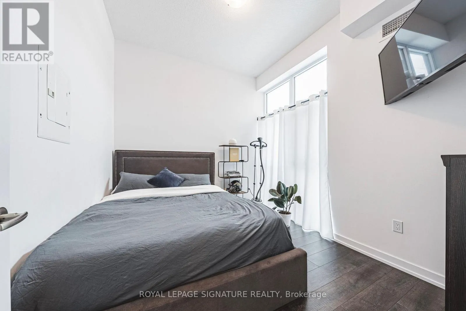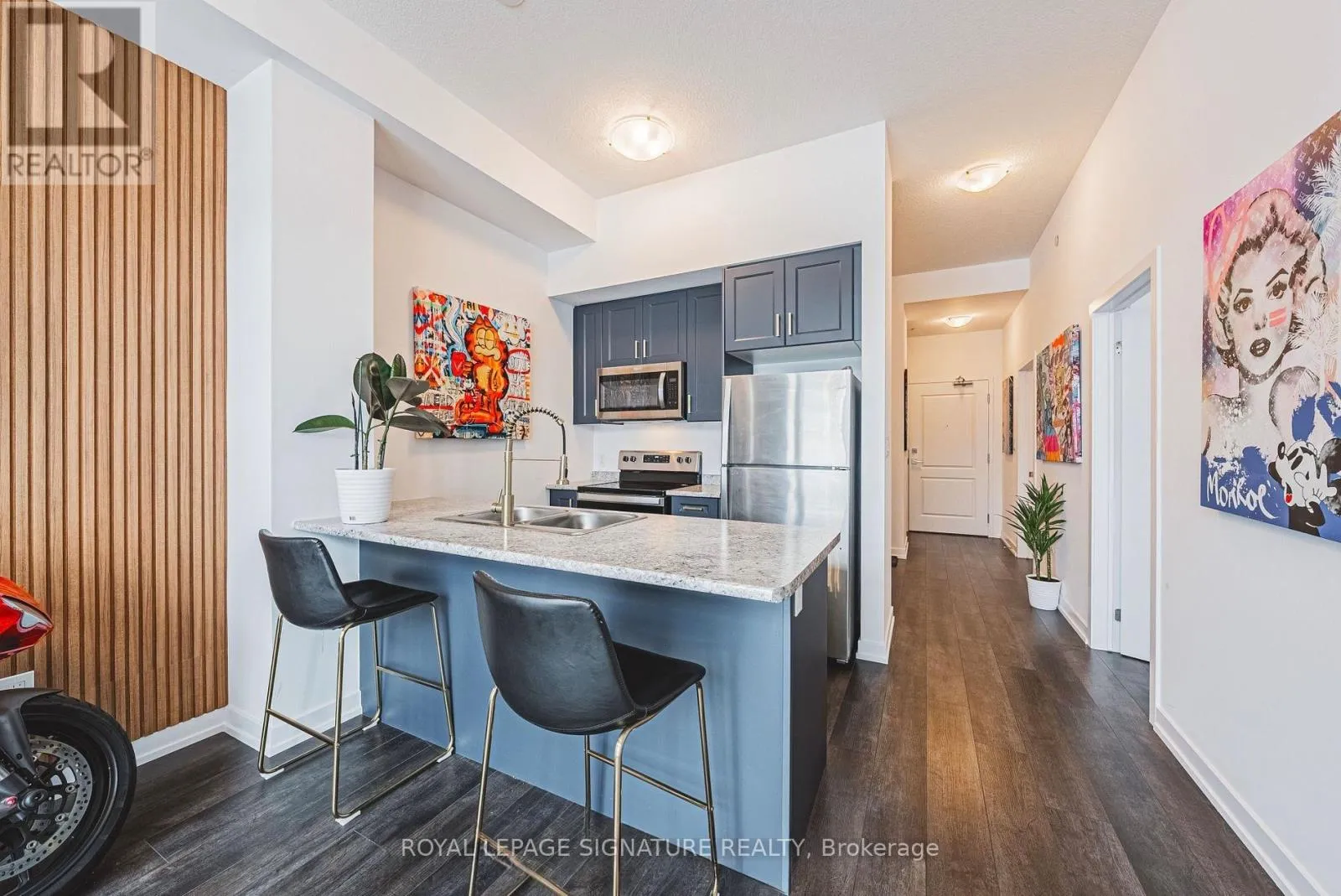 Dundas/ Waterdown Rd FREE RENT FOR DECEMBER. This modern Trend condo in Waterdown is just minutes from the GO Train. Move-in-ready 1-bedroom, 1-bath unit with 1 parking spot and 1 locker. The bright, open layout is highlighted by a tasteful accent wall, and the bedroom comfortably fits a queen-sized bed with large windows offering serene views. The unit is fully carpet-free with laminate flooring throughout. The kitchen features stainless steel appliances and a sit-up breakfast bar, while the master bedroom includes a spacious walk-in closet and oversized window. Residents enjoy a fitness center, rooftop terrace, party rooms, and BBQ-friendly gathering spaces. Ideally located near public transit, Waterdown Village, parks, trails, shopping, restaurants, and major highways, this condo combines comfort, convenience, and modern style. (id:27476)