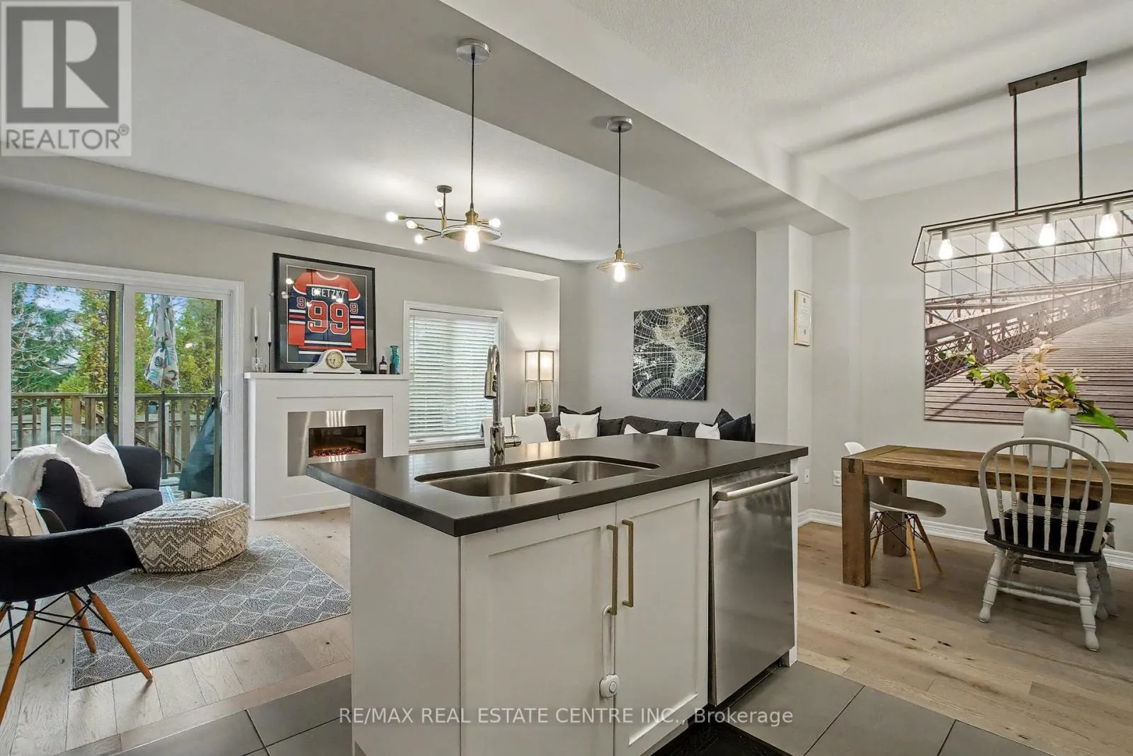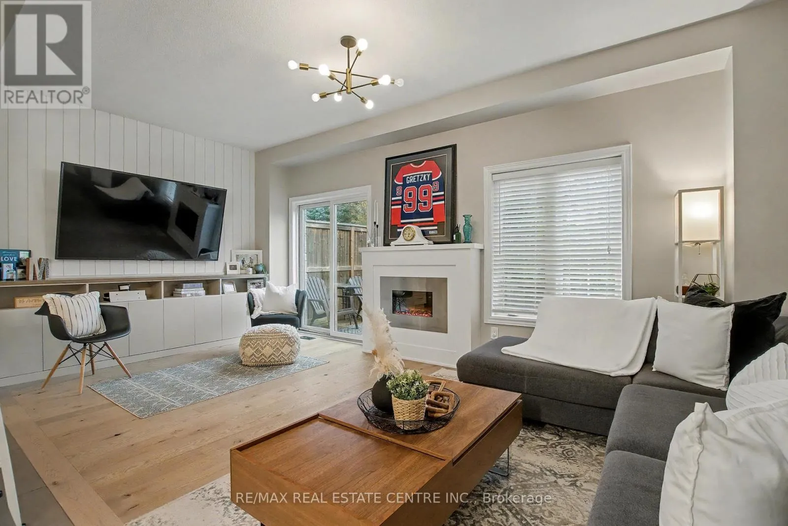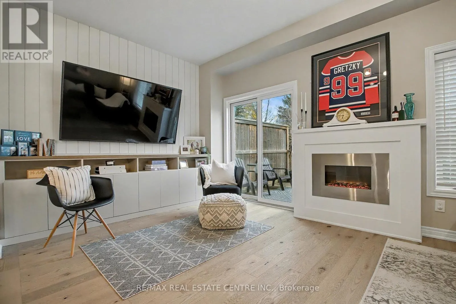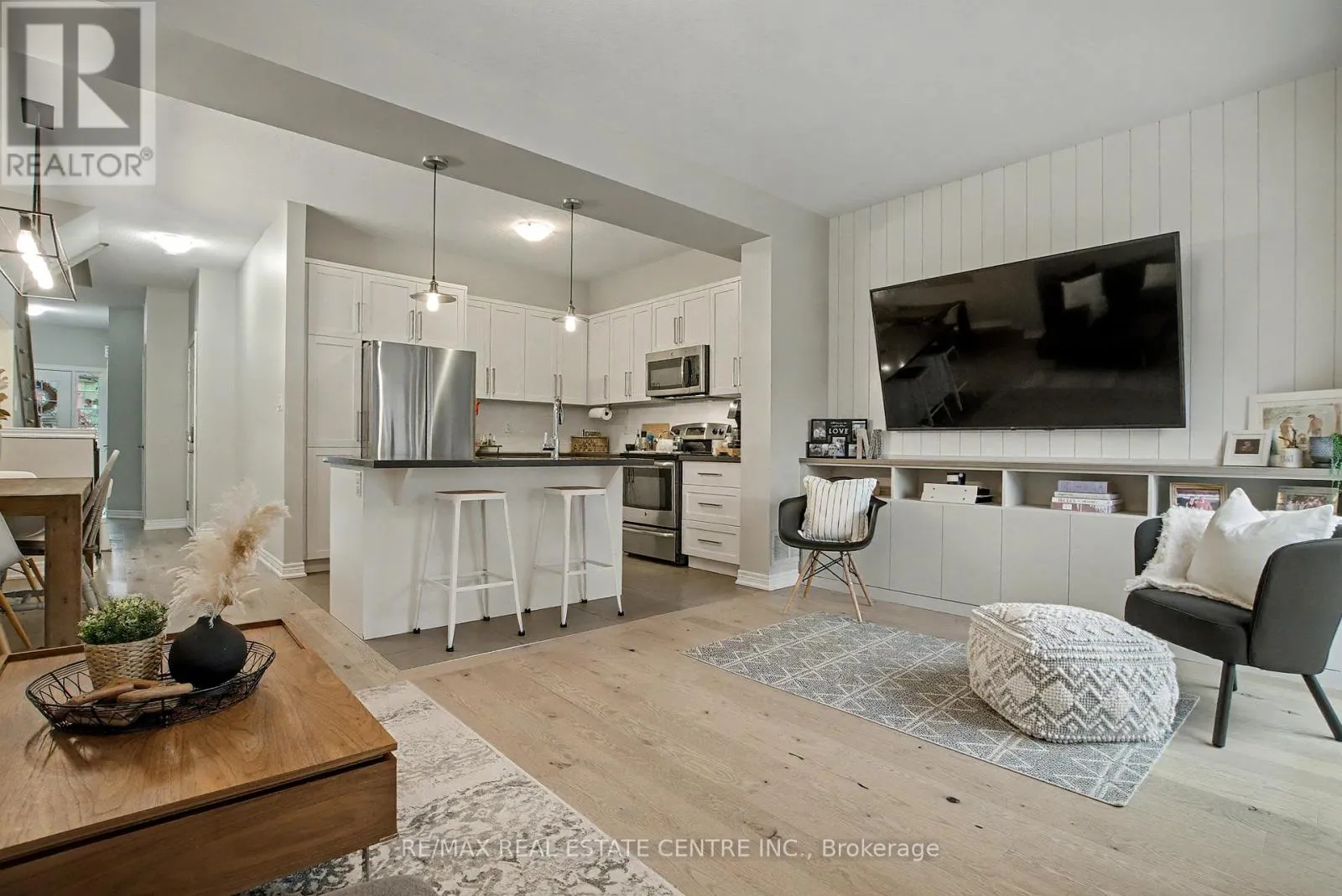 Dundas St E/ Hamilton St S Welcome to this beautifully maintained condo townhouse offering style, comfort, and convenience in every detail. The main level features an inviting open-concept layout with hardwood flooring and neutral paint tones that create a warm, modern feel. The gourmet kitchen boasts stainless steel appliances, a functional island, and plenty of counter space-perfect for cooking and entertaining. A custom built-in wall unit with charming shiplap & electric fireplace adds character and a cozy focal point to the living area. Upstairs, you'll find three generous-sized bedrooms, including a spacious primary suite complete with built-ins in the walk-in closet and its own 4-piece ensuite bathroom. An additional 4-piece bathroom serves guests or family. The second-floor laundry room has been tastefully updated, offering added convenience and style. The finished basement expands your living space with a versatile recreation room and ample storage options. A single-car garage provides secure parking and additional room for belongings. Move-in ready and thoughtfully updated, this home blends updated finishes with practical living spaces-perfect for families, professionals, or anyone seeking a low-maintenance lifestyle. (id:27476)