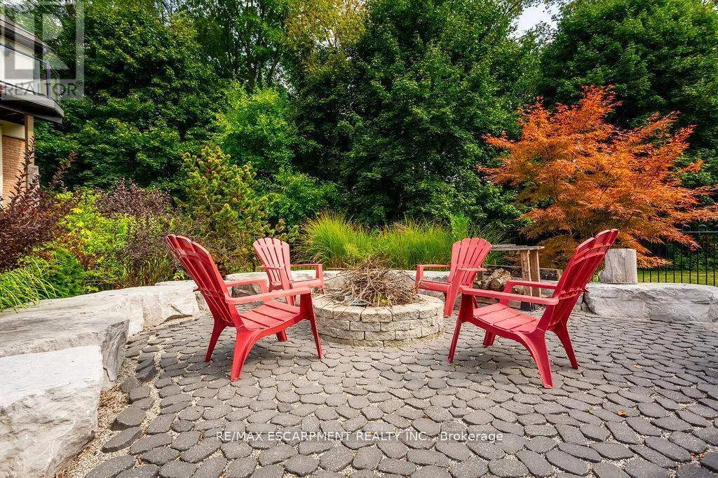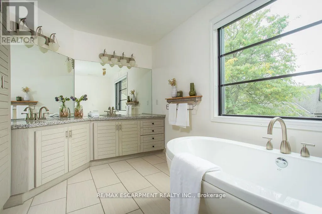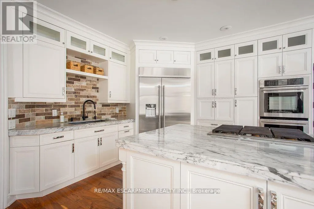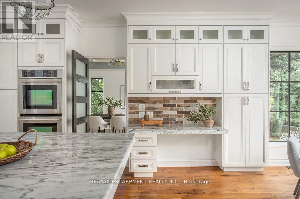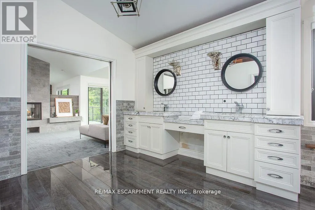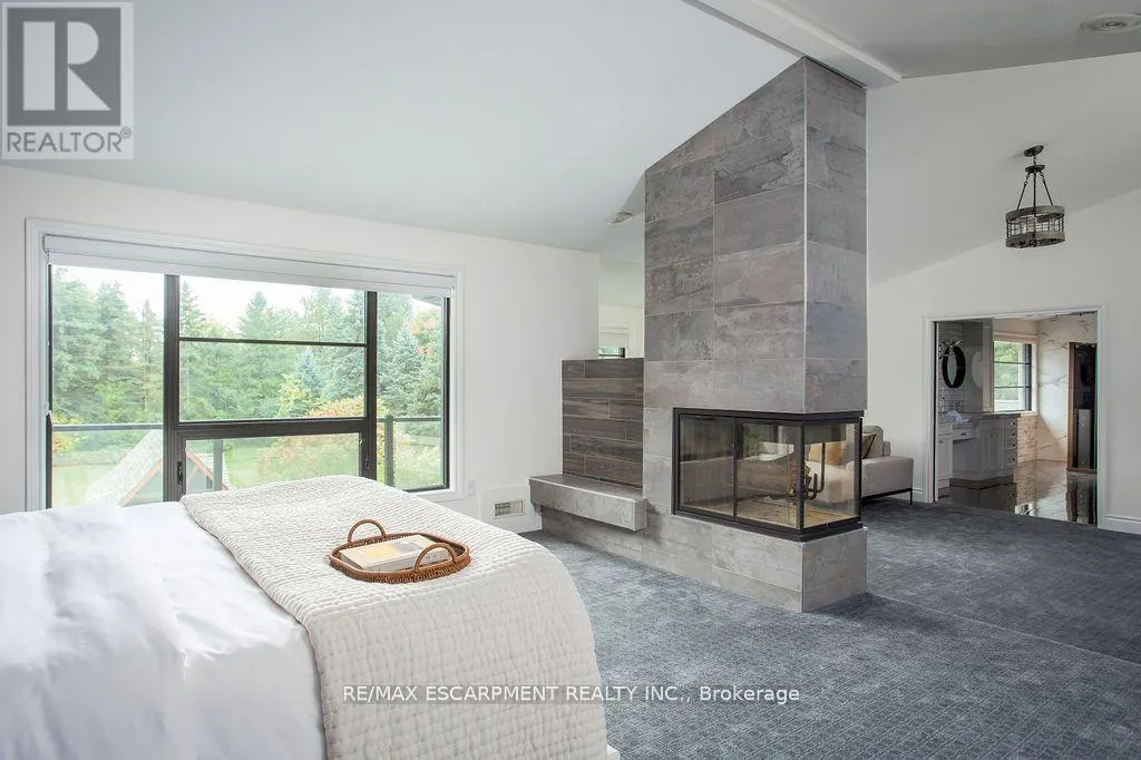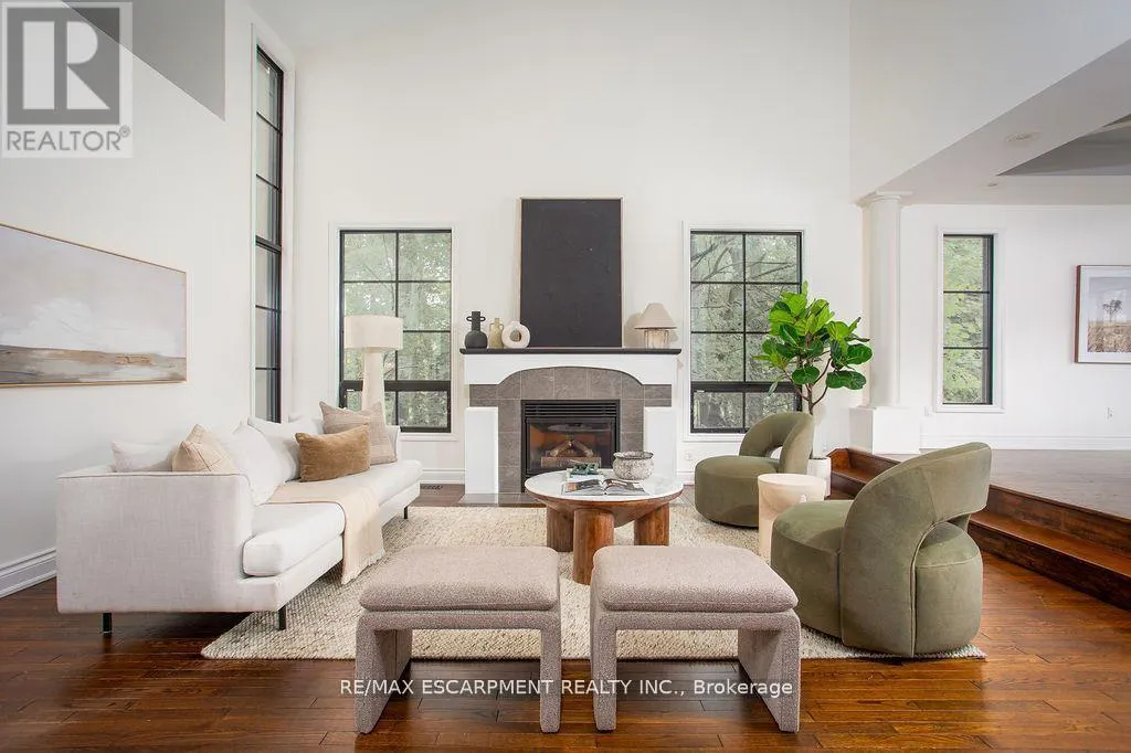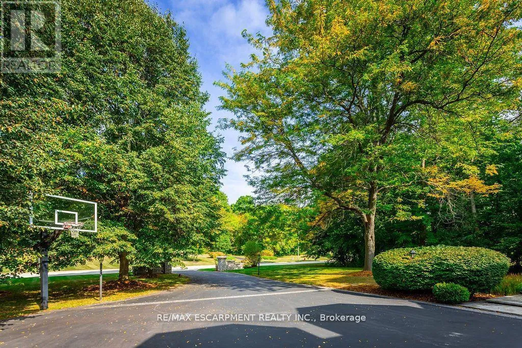Cross Streets: Carlisle Road/Centre Road. ** Directions: Carlisle Road - Flamborough Hills - Acredale - Blackberry. Short term lease opportunity up to 6 months. Soaring 22-foot foyer introduces over 5,400 sq ft above grade, plus an additional 2,900 sq ft on the lower level. The main floor offers a sunken oak-panelled office, expansive living room with 19-foot vaulted ceilings, and a formal dining room overlooking the backyard. Chefs kitchen features solid wood dovetailed cabinetry with soft-close finishes, marble counters, professional-grade appliances, a walk-in pantry, and a breakfast room. It seamlessly opens to the family room with a wood-burning fireplace, large glass sliders to the back deck, and a wet bar with beverage fridge. A cozy octagonal sunroom invites fresh breezes, while a main flr bedroom with ensuite (or additional office) and a full laundry room with new washer and dryer add convenience. Upstairs, a sweeping staircase leads to the double-door entry of the primary retreat. This elevated suite boasts a seating area, vaulted ceilings, a two-sided wood-burning fireplace, a private balcony, and a spa-like ensuite with heated floors, marble counters, infrared sauna, water closet, walk-in shower with dual rain heads, and a generous walk-in closet. Three additional bedrooms, each with soaring ceilings, share a stylish 4-pce bath. A second staircase connects to the mudroom landing. The newly renovated lower level offers flexible living with a media rm/6th bedrm, gym, 4-piece bath, and a walk-up to the backyard. Outdoors, the south-facing yard is a true entertainers paradise: an IPE refinished deck, stone outdoor kitchen with wood-fired pizza oven, saltwater pool, fire-pit, and a cabana complete with bar, change-room, and storage all surrounded by extensive landscaping. Updates include most windows and doors (2016), dual furnaces and A/C units (2022), and newer appliances (2024). A heated 4-car garage and exceptional curb appeal complete this remarkable property. Pool maintenance and landscaping included. (id:27476)