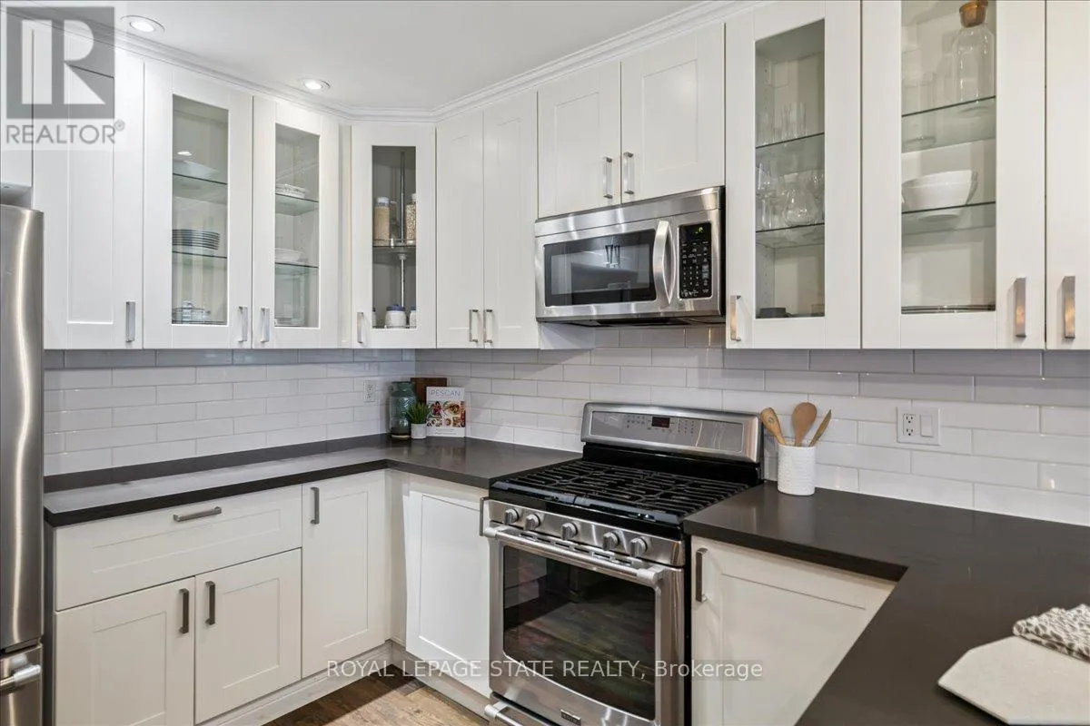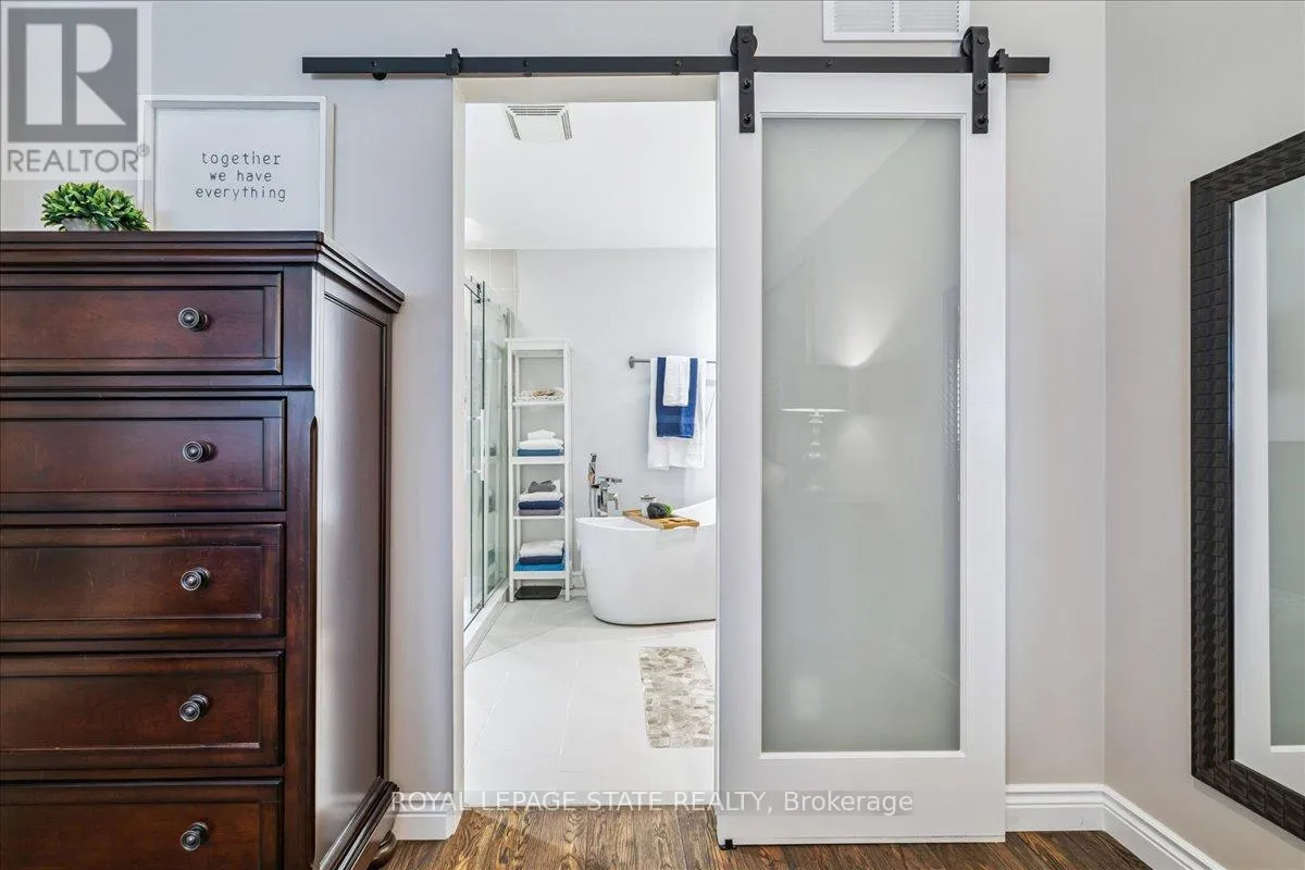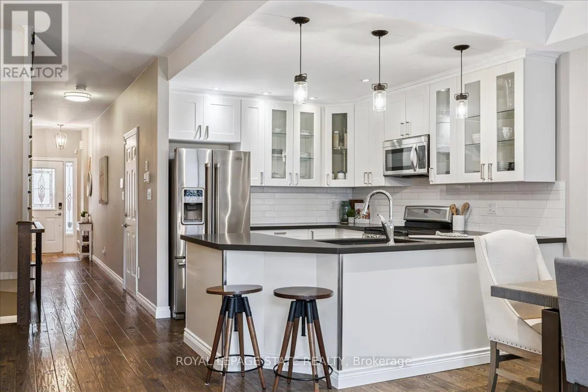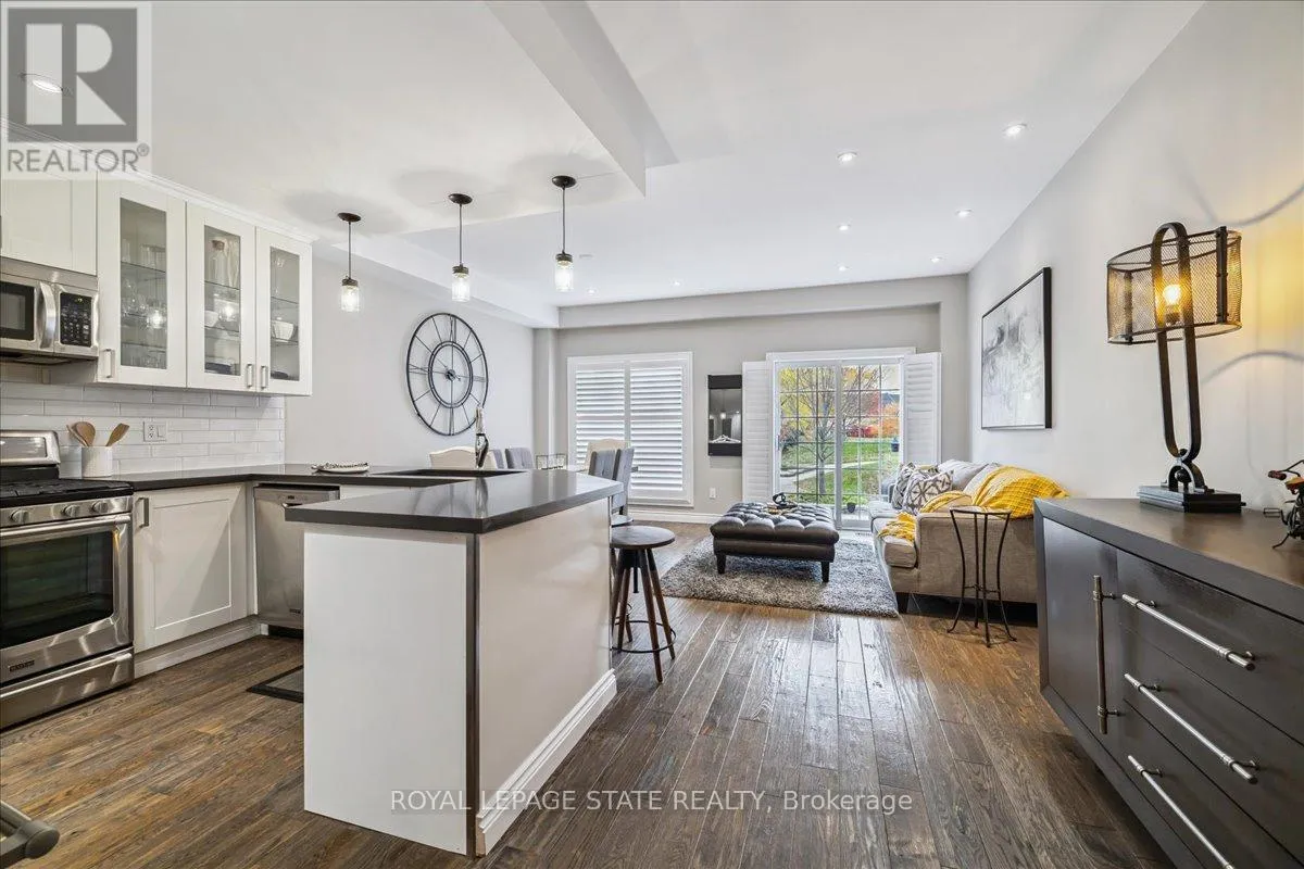 Cross Streets: Aberdeen Ave. ** Directions: QEW - to 403 W - exit on Aberdeen Ave - continue on Aberdeen Ave to Beddoe Dr. Stunning upgrades, elegant design & prime location! This beautifully updated townhome, just off HWY 403 & the Linc, blends modern style, comfort & everyday convenience. Enjoy rich 5" oak hardwood floors, upgraded lighting & LED pot lights throughout. The bright kitchen features Caesarstone counters, soft-close cabinets, stainless steel appliances, undermount sink & sleek subway tile backsplash. The open living/dining area offers great natural light & walkout to a private courtyard overlooking a landscaped parkette - a peaceful spot for morning coffee or evening relaxation. Interior garage access & stylish powder room complete the main level. Upstairs, the spacious primary suite offers 2 closets & a stunning 5-pc ensuite with soaker tub, stone accents, glass shower, frosted barn door & double vanity. The second bedroom also features a 4-pc ensuite & generous closets. The finished lower level includes a laundry room with cabinetry, sink & backsplash, plus a large rec room with media wall, stone fireplace & custom built-ins, along with an upgraded 3-pc bath. Located in a walkable, highly sought-after neighbourhood near scenic trails, the Bruce Trail, Chedoke Golf Course, Locke St., Westdale, McMaster & St. Joe's Hospital. Minutes to shops, cafés & parks. Meticulously finished from top to bottom - a hidden gem offering the perfect blend of luxury & lifestyle! (id:27476)