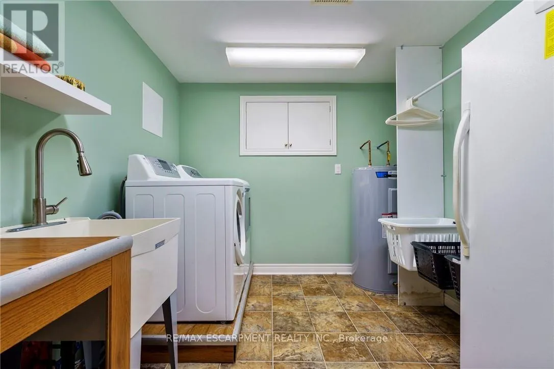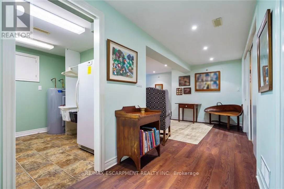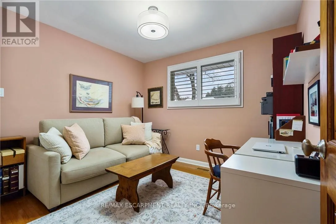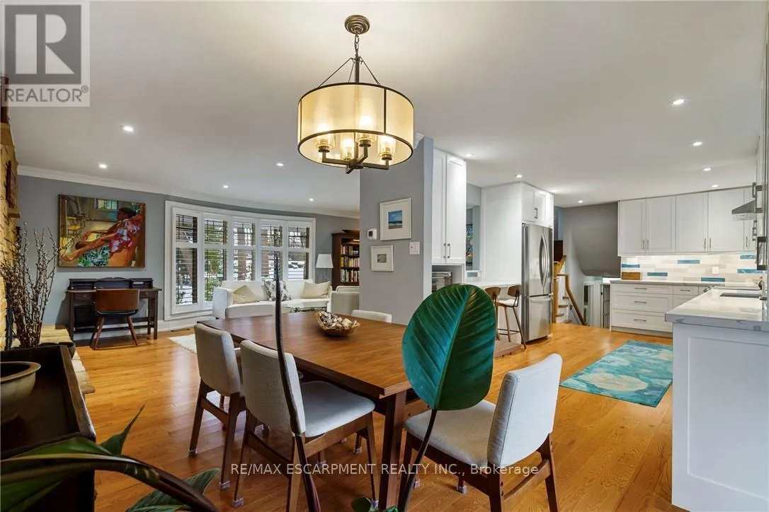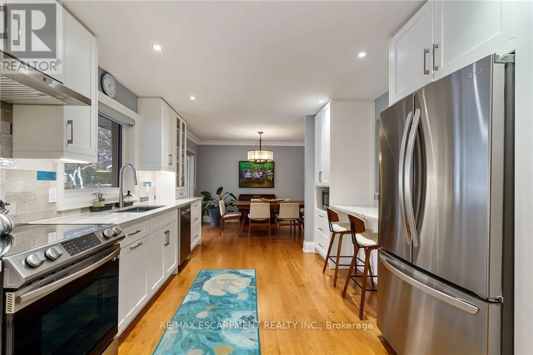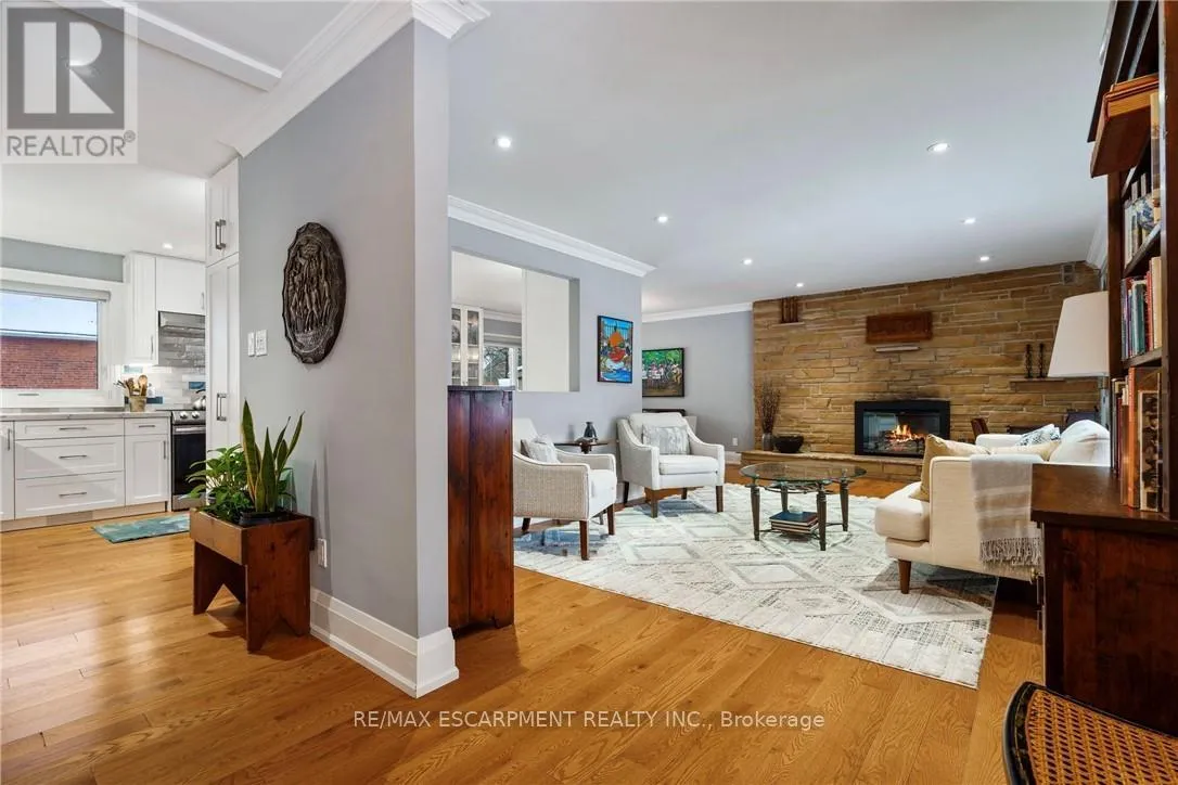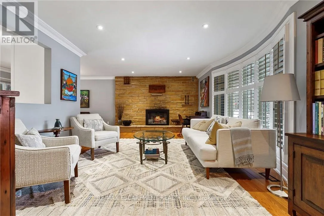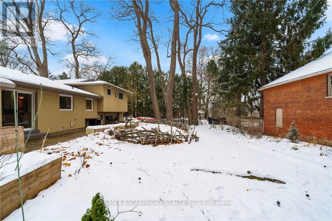 Cross Streets: South St W. ** Directions: Osler Dr to South St W to Hatfield Pl. Tucked away on a quiet, private street yet steps from University Plaza, the Rail Trail, and just minutes to McMaster University and Hospital, this extraordinary 4-bedroom, 2-bath, four-level side split offers the perfect blend of serenity and convenience in the heart of Dundas. Set on a beautifully landscaped 95' x 125' lot with a stylish stucco façade, the home is flooded with natural light throughout, highlighting its warm and inviting spaces. The main floor features hardwood floors flowing through a bright living room with a charming bay window and stone fireplace, a dining room with sliding doors to the backyard, and a modern kitchen with quartz countertops, abundant cabinetry, and stainless steel appliances-ideal for cooking and gathering. Upstairs offers three generous bedrooms and a luxurious 4-piece bathroom with a double vanity and oversized shower. The lower level provides exceptional versatility with a cozy family room showcasing a gas fireplace, a second full bathroom, and an additional bedroom with a walkout to the private backyard-perfect for guests, in-laws, or a home gym. The fully finished basement expands your living space with a spacious recreation room, a large laundry room, and abundant storage. Outside, the fully fenced yard is designed for relaxation and entertaining, featuring mature landscaping, a full-length interlocking patio, and convenient garage access. With its unbeatable location, beautiful updates, and thoughtful layout, this home is a rare Dundas find you won't want to miss. (id:27476)