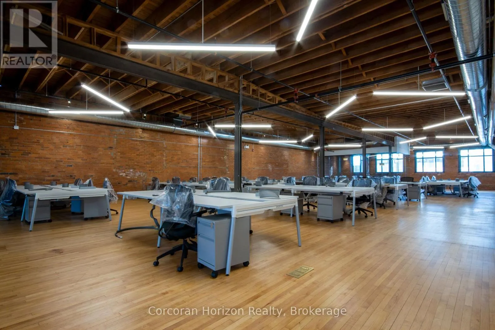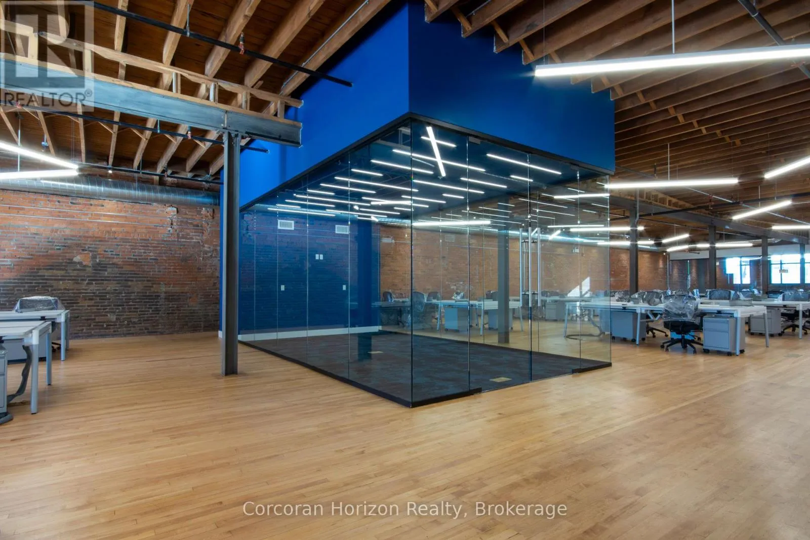 NE corner of King Street East and Hughson Street North adjacent to King William Urban Rentals Stunning, turn-key penthouse office space in the heart of Hamilton's central business district! This beautifully rebuilt building blends historic character with modern infrastructure, creating one of the most impressive office environments in the city. Exposed stone and brick walls, steel posts, and gleaming hardwood floors are complemented by glass-enclosed offices and meeting rooms for a sophisticated, contemporary feel. A spacious kitchen and seating area are located toward the rear of the unit, adjacent to a unique "yoga / conference room" featuring a roll-up garage door. Need a breath of fresh air? Step out onto the shared rooftop terrace for a break or informal meeting. Just steps from everything - courthouses, banks, Restaurant Row, transit, shopping, and more - this exceptional space is ideal for any company looking for an office that stands out for its quality, design, and employee experience. Note: Furniture pictured not included in listing offering. (id:27476)