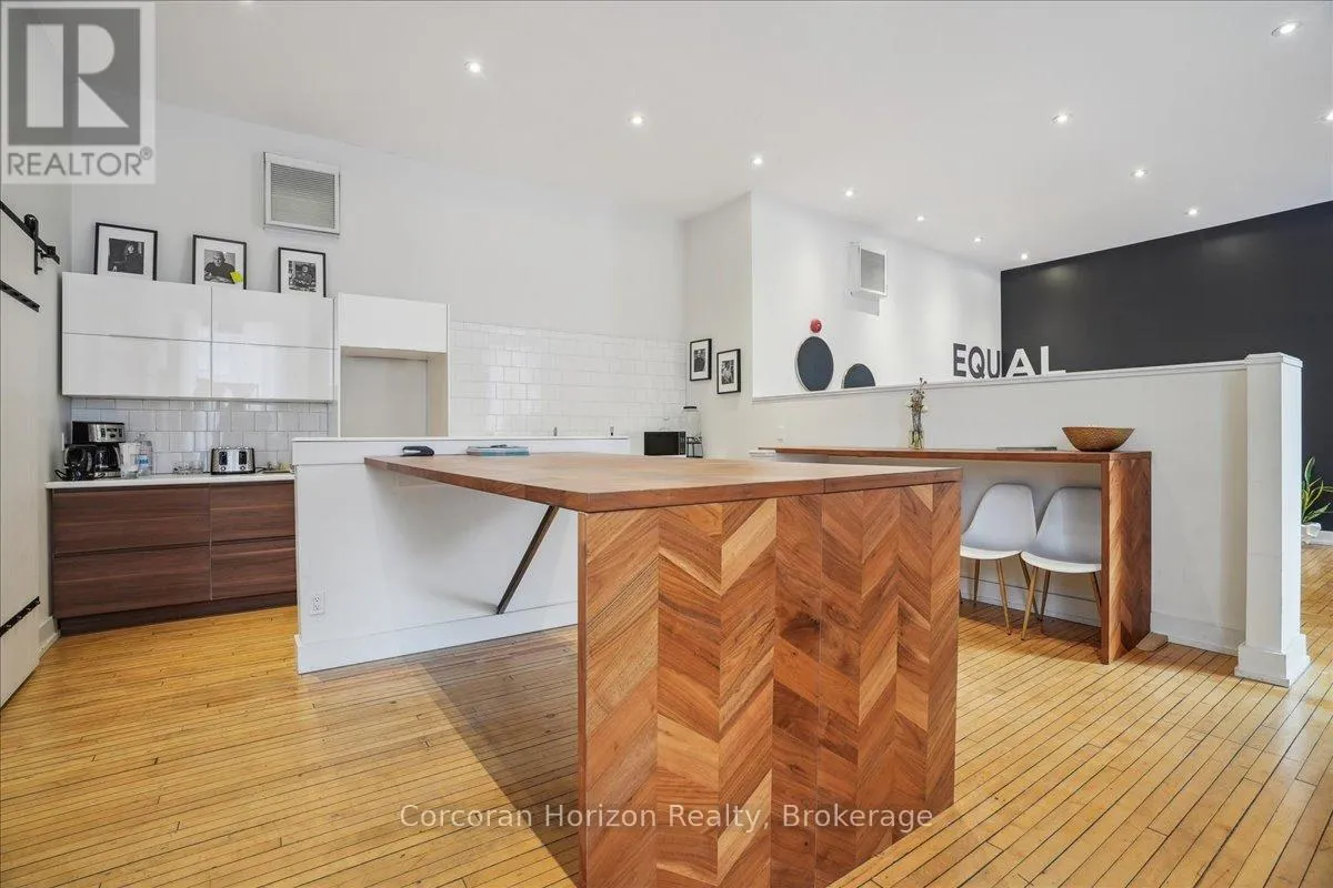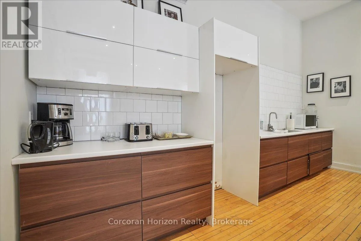 King William St & Hughson St N Cozy and pristine office space available on Hamilton's Restaurant Row! Located in the much sought-after Empire Times building in the heart of the King William restaurant district. Surrounded by new developments and established landmarks like the Mule, the French, the Diplomat, and Berkley North, the unit's incredible location means you'll never want for good neighbours! In combining two separate buildings, owner and developer Core Urban has managed to create one of the leading hubs for professional and hospitality spaces in the city. Enter through the high-visibility King William Street entrance and take the glass-walled two sided elevator up to the second floor and enter directly into your unit, which includes bull-pen open work area, kitchenette, storage room, and back office. Fob-controlled elevator access means peace of mind that only your staff and clients have the privilege of entering this the unit. This signature location offers immediate access to restaurants, banks, courthouses, public transit, and so much more. Available for rent June 1 at one of Hamilton's finest buildings. Note: furniture shown in photography belongs to prior tenant and not available for use. Square footage provided by landlord. (id:27476)