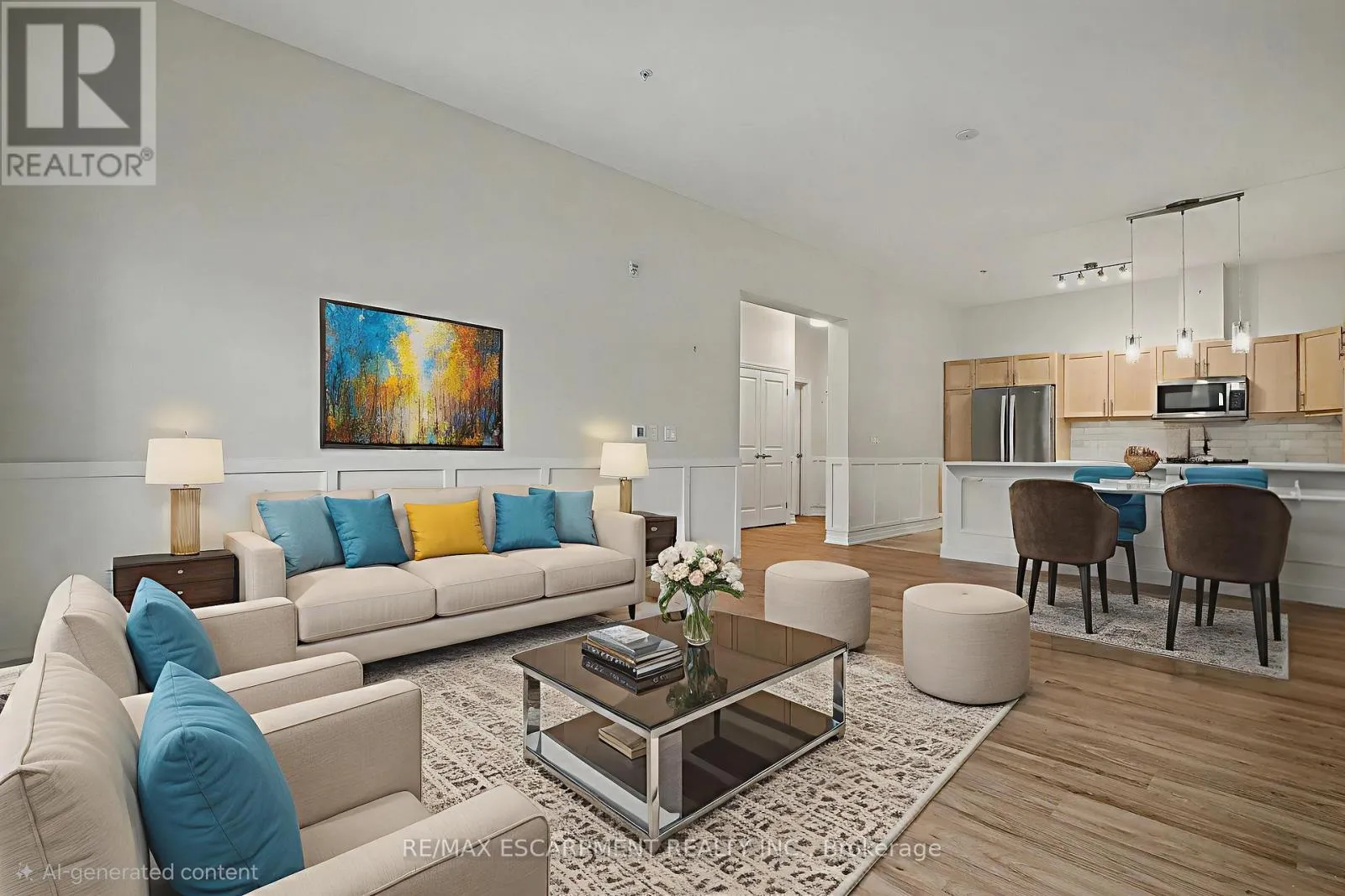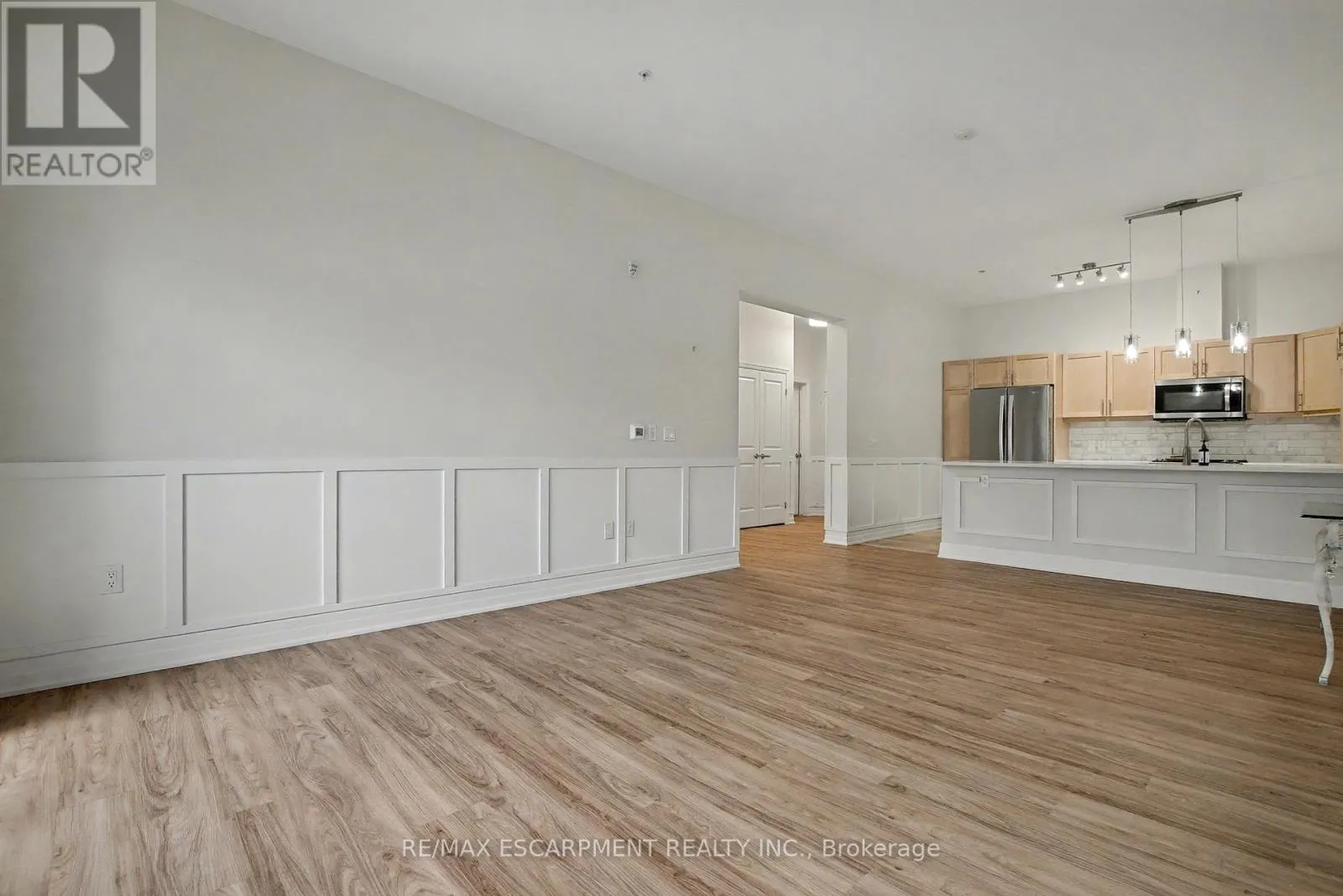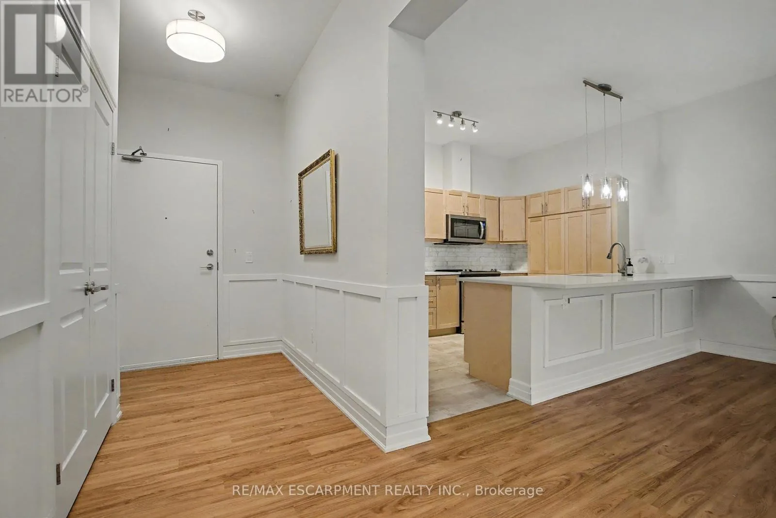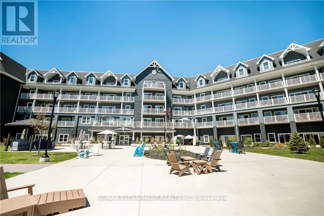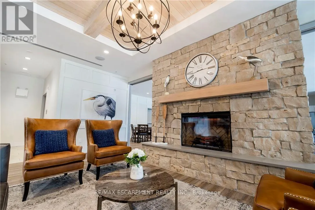 Cross Streets: Garth Street & Rymal Rd W. ** Directions: South East Corner of Garth Street & Rymal Road West. Welcome to the Upper Mill Pond apartments at St. Elizabeth Village, a gated 55+ community offering a vibrant lifestyle with modern conveniences. This home is one of the larger one bedroom layouts at 890 square feet and features open concept living with soaring 10 foot ceilings and luxury vinyl flooring throughout. The kitchen flows seamlessly into the spacious living and dining area and includes a peninsula with seating for casual meals or entertaining. The living space is bright and welcoming, with South-facing windows that fill the home with natural light all day. Step outside to the large 384 square foot private outdoor terrace, available exclusively to this unit, providing a rare opportunity for outdoor living and entertaining. The home has been tastefully updated with wainscoting throughout, a custom stone fireplace in the living room, and built-in cabinets in the bedroom for added storage. Additional conveniences include underground parking and a private storage locker. Residents of this building enjoy access to outstanding amenities including a heated indoor pool, gym, saunas, hot tub, and golf simulator. The Village also offers a wide range of services just steps away such as a doctors office, pharmacy, massage clinic, and public transportation. Within a five minute drive you will also find grocery stores, shopping, and restaurants. This home combines thoughtful updates, a unique outdoor terrace, and a welcoming community atmosphere, creating an exceptional opportunity to enjoy all that St. Elizabeth Village has to offer. (id:27476)