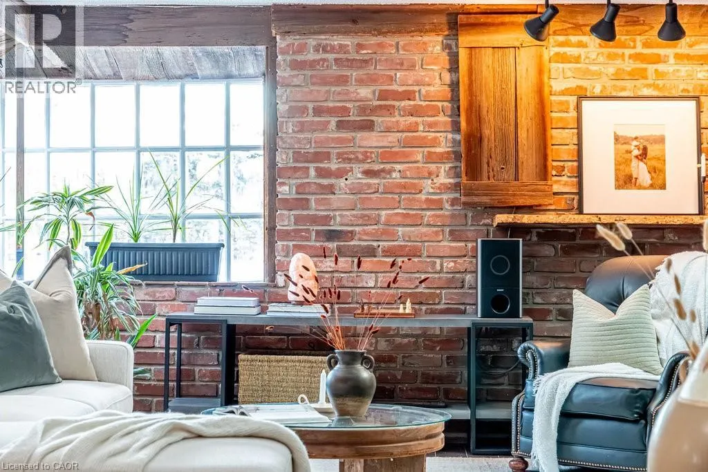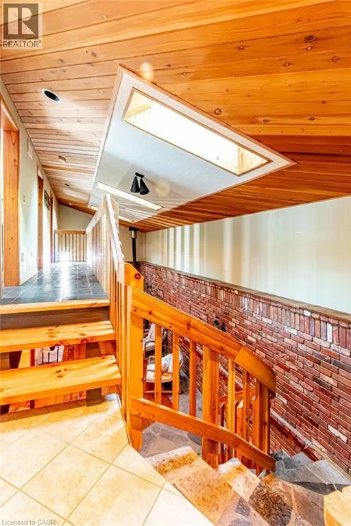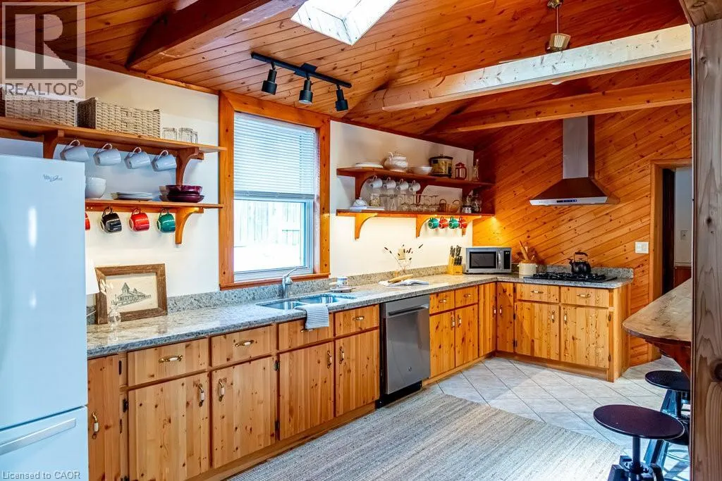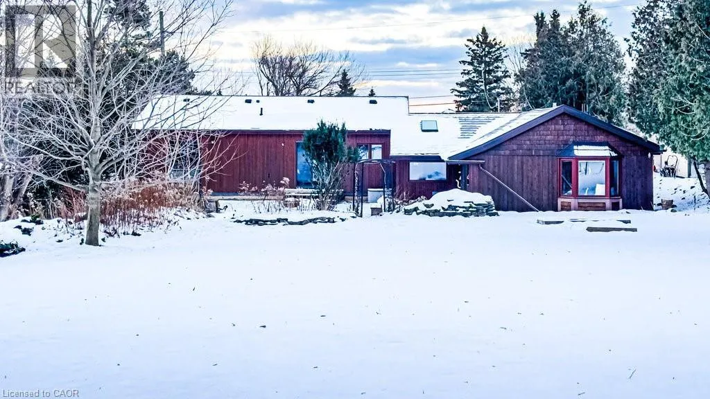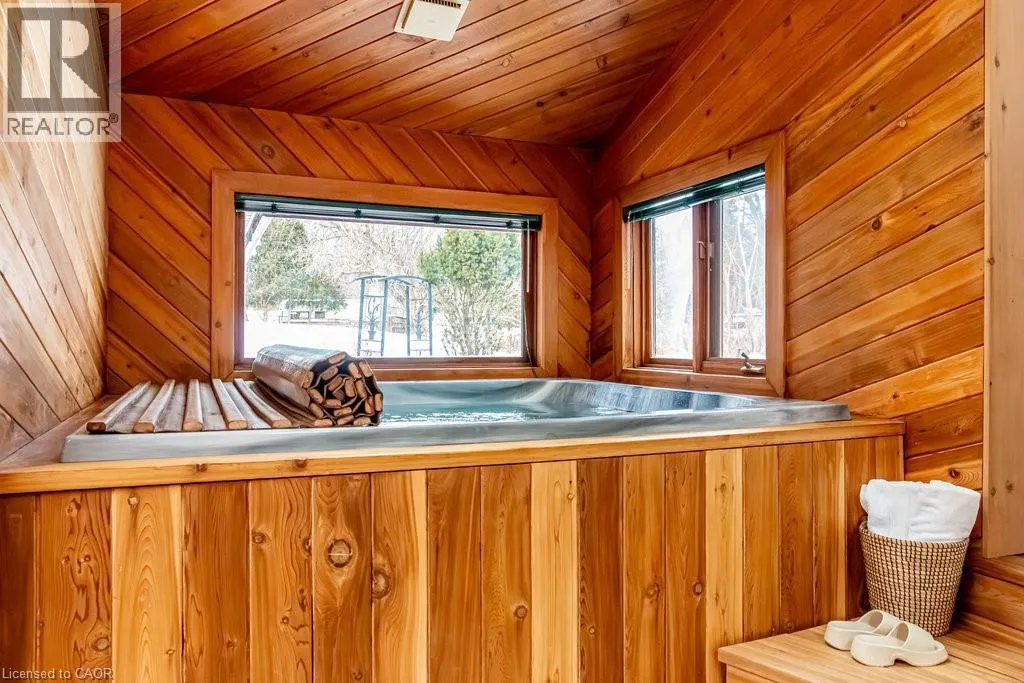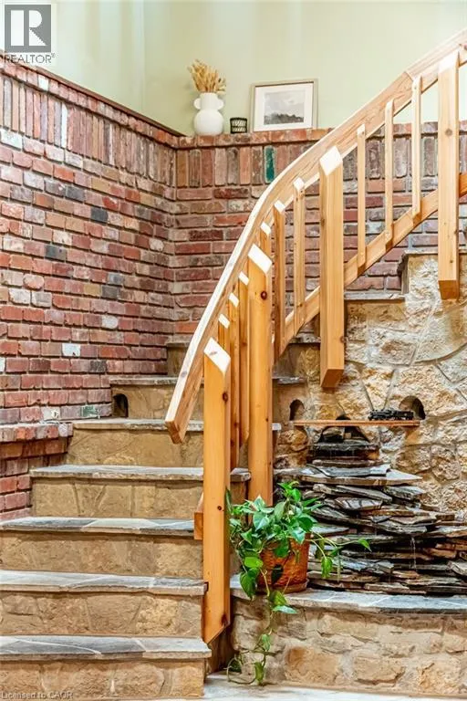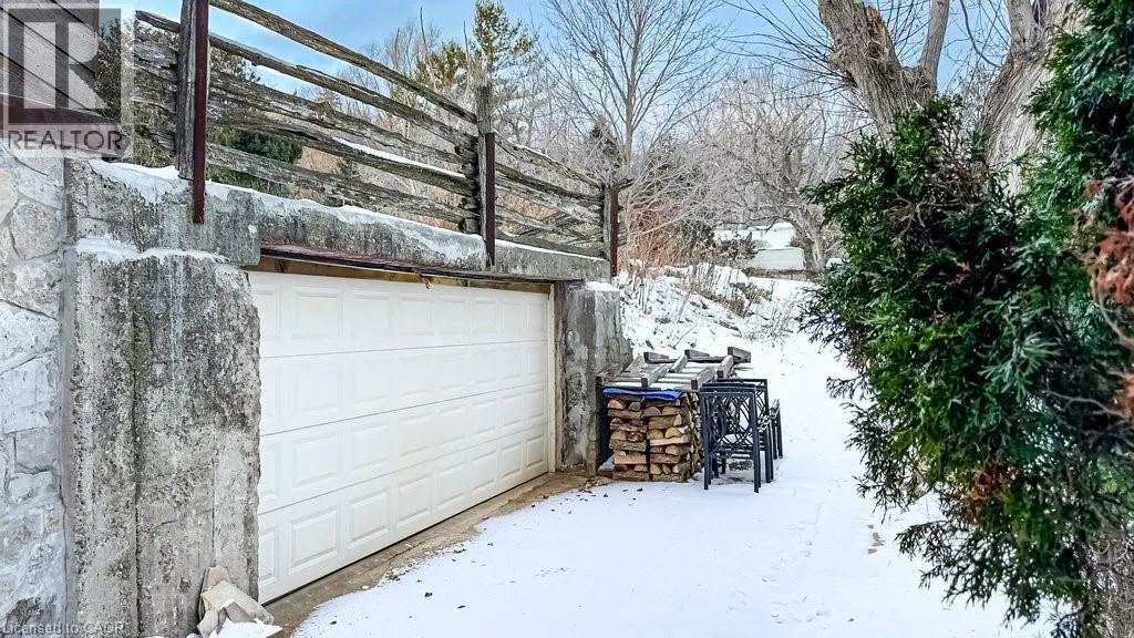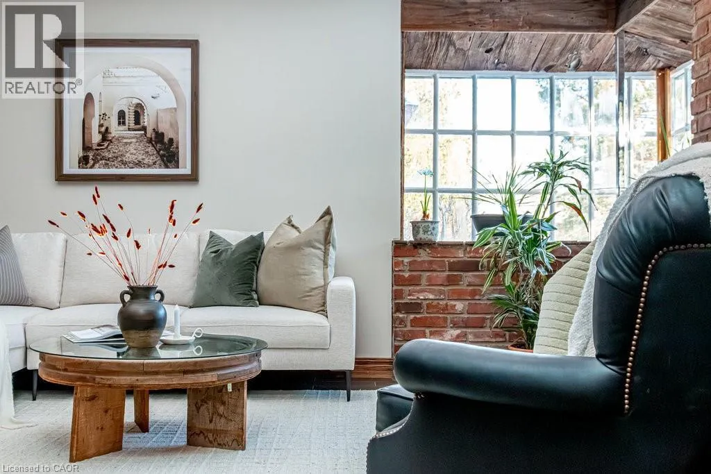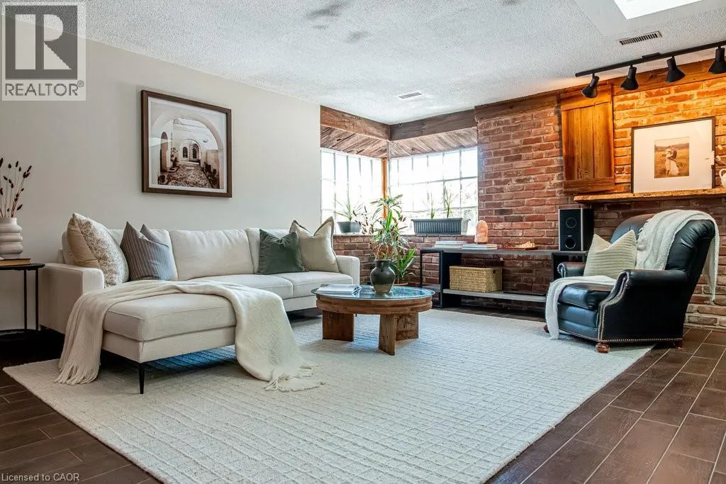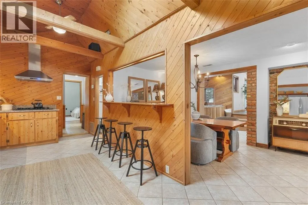 Old Guelph Road to Home Street. Tucked on a quiet cul-de-sac with Escarpment views and access to the Bruce Trail, this rare mid-century modern ranch features a loft and blends modern style with rustic, handcrafted character. Wrapped in natural textures - flagstone, reclaimed brick, and warm woods - and bathed in sunlight from 19-foot vaulted pine ceilings and multiple skylights, this 3 bed, 2 bath home (including 2 bedrooms and a full bath in the airy loft) delivers major one-of-a-kind energy. Set on a private 84 à 215 ft lot, it offers a true sense of retreat. The foyer introduces the homeâs boutique atmosphere with natural timber, masonry accents, angled ceilings, and soft daylight. An indoor hot tub adds unexpected luxury, framed by picture windows overlooking the serene backyard. The main living areas flow easily from here: a warm living room with gas fireplace, crafted wood shelving, and a charming corner window, an open dining space connected to a stunning kitchen with exposed beam trusses, granite counters, built-in gas cooktop, floating shelves, and a modern chimney hood. A main-floor primary suite sits privately at the rear with a 3 piece ensuite and convenient laundry nearby. The lower level is a true entertainerâs playground, showcasing floor-to-ceiling brick, a spacious bar, tranquil indoor waterfall, and a natural wood-burning stove. This impressive space remains visually linked to the main floor with an open view to the loft above. Recent updates include 2019 furnace, AC, and owned water heater, and a 2017 metal roof with 8 skylights, and a 20 à 20 insulated garage with inside entry. (id:27476)