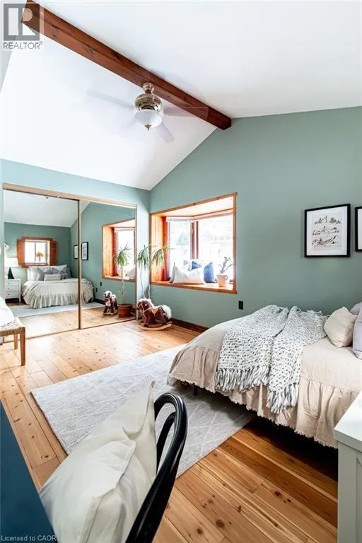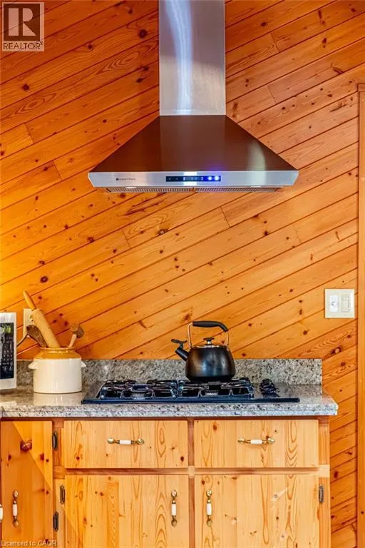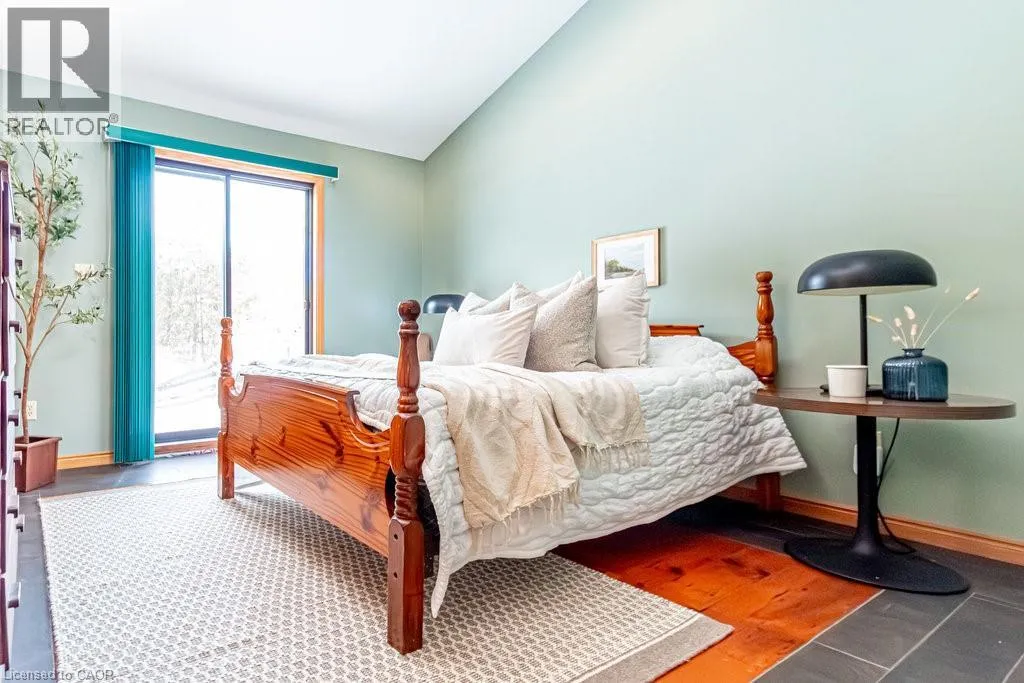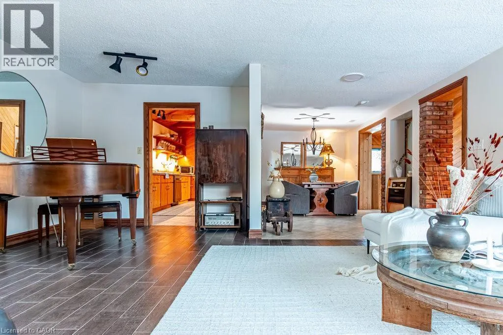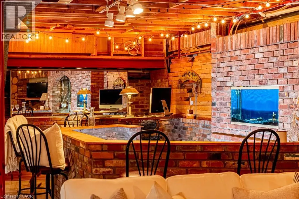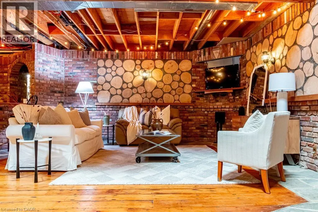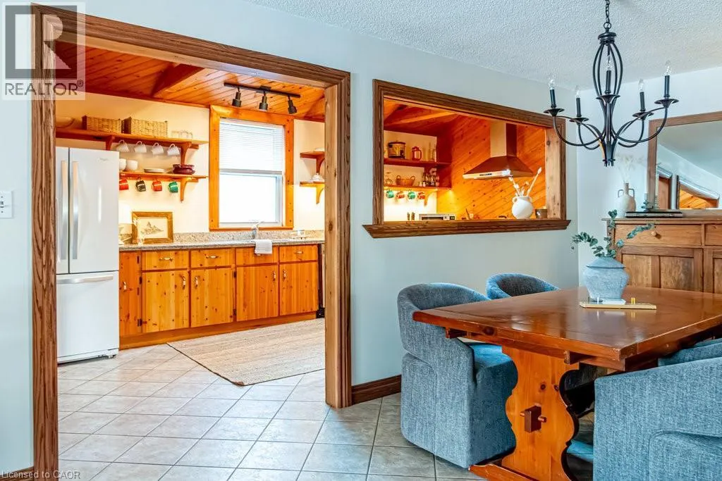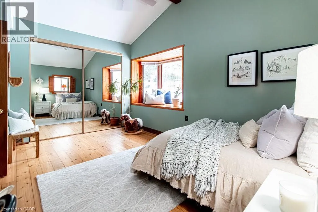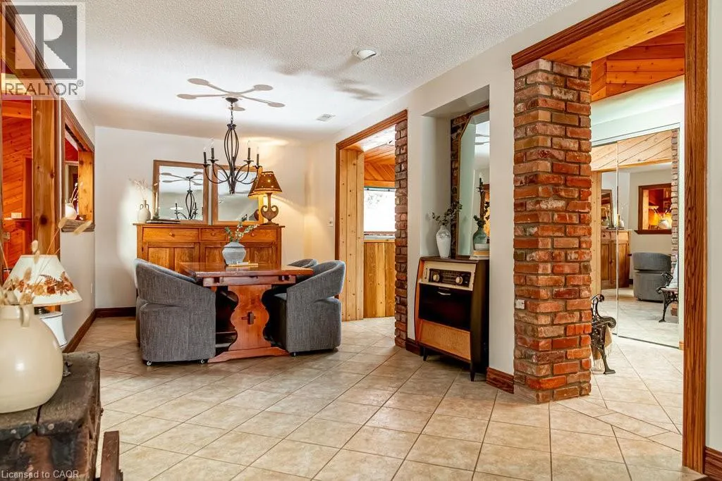 Old Guelph Road to Home Street. Tucked on a quiet cul-de-sac with Escarpment views and access to the Bruce Trail, this rare mid-century modern ranch features a loft and blends modern style with rustic, handcrafted character. Wrapped in natural textures - flagstone, reclaimed brick, and warm woods - and bathed in sunlight from 19-foot vaulted pine ceilings and multiple skylights, this 3 bed, 2 bath home (including 2 bedrooms and a full bath in the airy loft) delivers major one-of-a-kind energy. Set on a private 84 à 215 ft lot, it offers a true sense of retreat. The foyer introduces the homeâs boutique atmosphere with natural timber, masonry accents, angled ceilings, and soft daylight. An indoor hot tub adds unexpected luxury, framed by picture windows overlooking the serene backyard. The main living areas flow easily from here: a warm living room with gas fireplace, crafted wood shelving, and a charming corner window, an open dining space connected to a stunning kitchen with exposed beam trusses, granite counters, built-in gas cooktop, floating shelves, and a modern chimney hood. A main-floor primary suite sits privately at the rear with a 3 piece ensuite and convenient laundry nearby. The lower level is a true entertainerâs playground, showcasing floor-to-ceiling brick, a spacious bar, tranquil indoor waterfall, and a natural wood-burning stove. This impressive space remains visually linked to the main floor with an open view to the loft above. Recent updates include 2019 furnace, AC, and owned water heater, and a 2017 metal roof with 8 skylights, and a 20 à 20 insulated garage with inside entry. (id:27476)