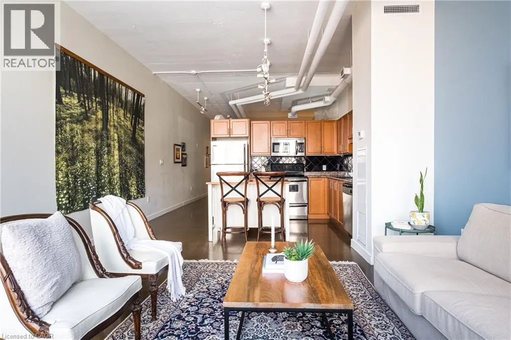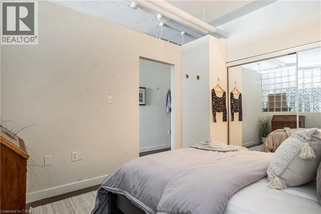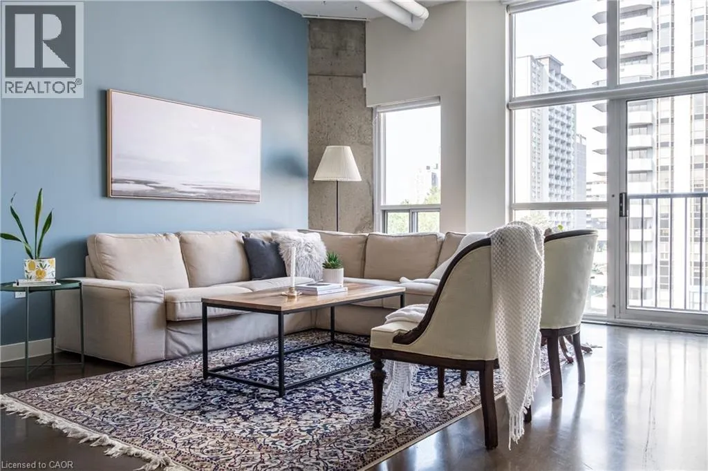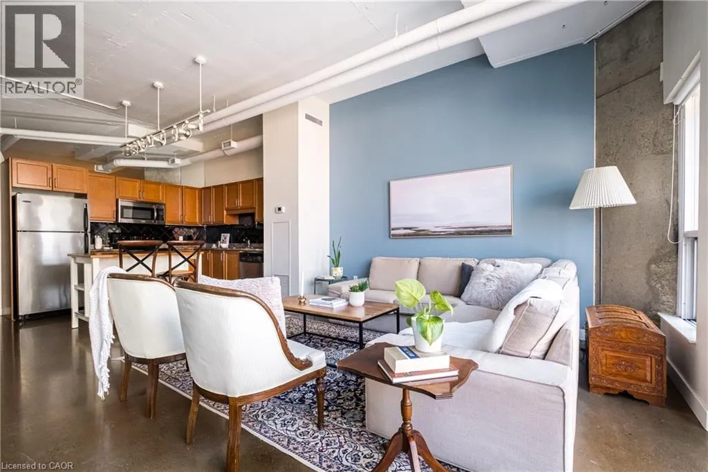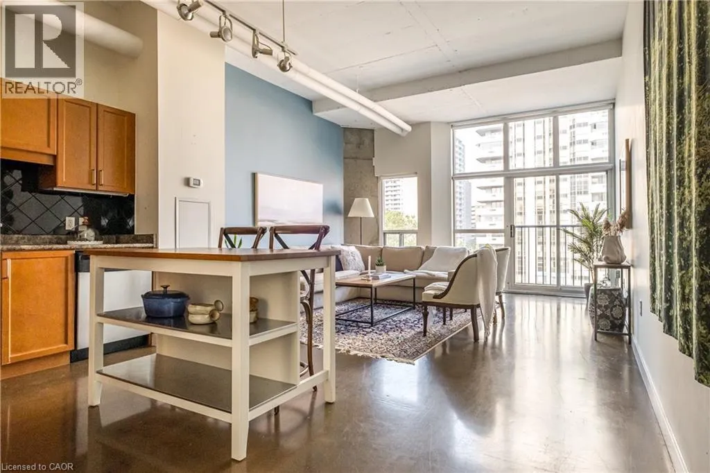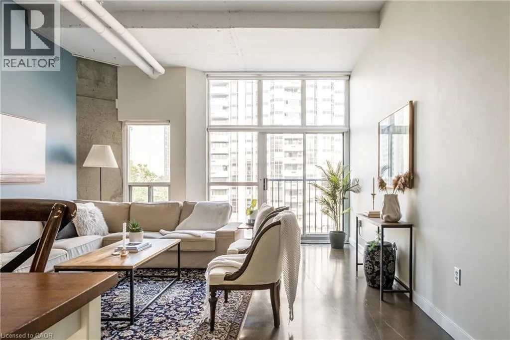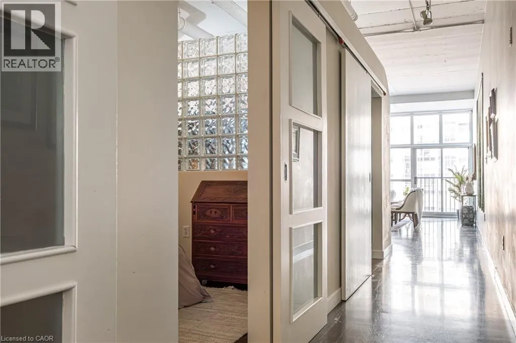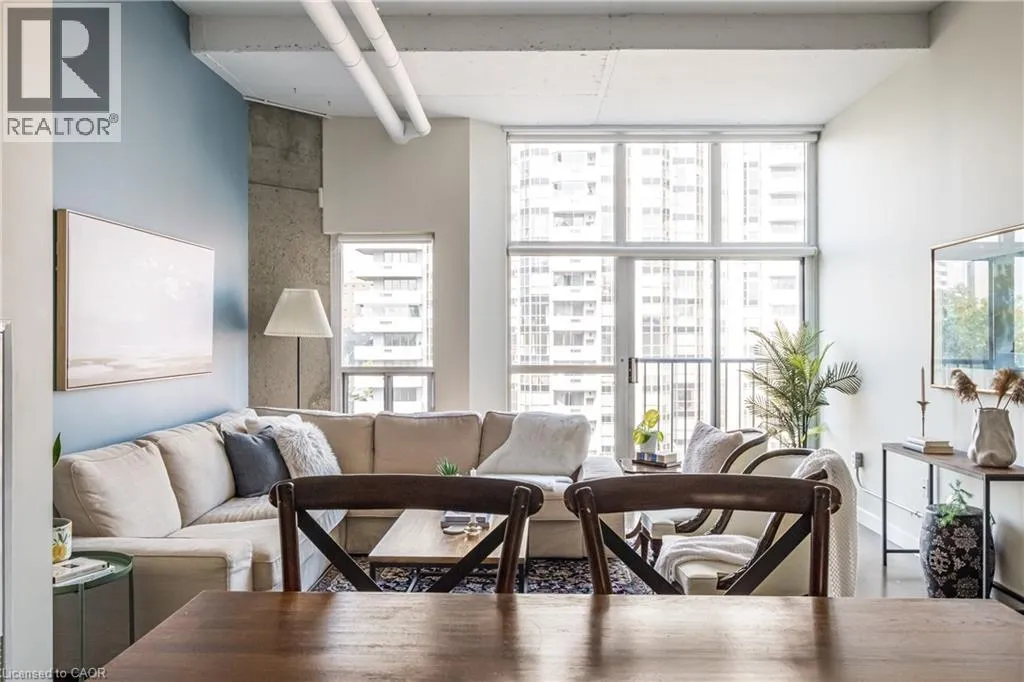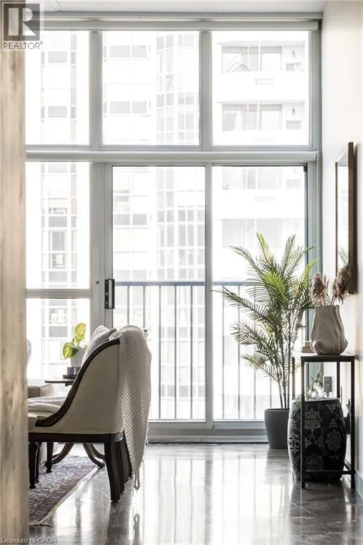 Bay St S between Jackson St and Main St Experience urban chic living at the Core Lofts! This super cool condo boasts a modern industrial vibe with polished concrete floors, soaring 10+ft ceilings with exposed pipes and beams, glass bock accents and floor-to-ceiling windows for a ton of natural light. This 834 sqft unit features 1 bedroom plus a den that can also serve as a home office or an additional bedroom, a 4pc bath, convenient in-suite laundry and an open-concept living and dining area. The kitchen features stainless steel appliances with ample cupboards and storage and the spacious open living area is perfect for entertaining with a Juliette balcony to enjoy west-facing sunset views. Residents enjoy premium building amenities, including a gym, party room, guest suites, and rooftop patio with BBQ perfect for taking in breathtaking city skyline views. The unit include an underground parking spot and convenient lockers on 8th-floor. This sought-after building in a prime downtown location is close to St. Joseph, McMaster and all area hospitals + the David Braley Medicine Centre making it ideal for medical professionals. Within walking distance to the new TD Coliseum, the Convention Centre, the Downtown Core, restaurants, shopping and amenities, Art Gallery of Hamilton, Central Library, Farmersâ Market and just minutes to trendy Locke St S. Public transit direct to McMaster University, Go-transit, and easy access to the 403 make this cool and convenient condo at the Core Lofts the perfect choice to call home! RSA (id:27476)