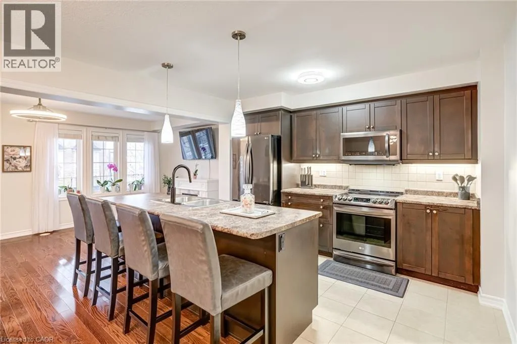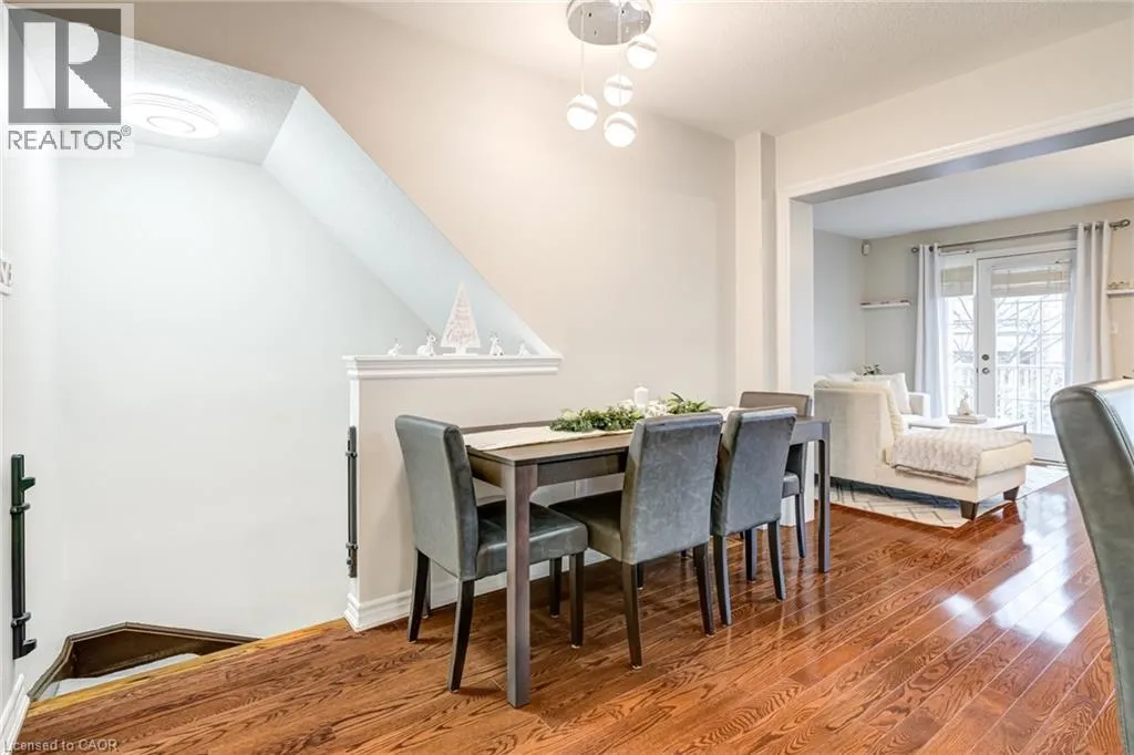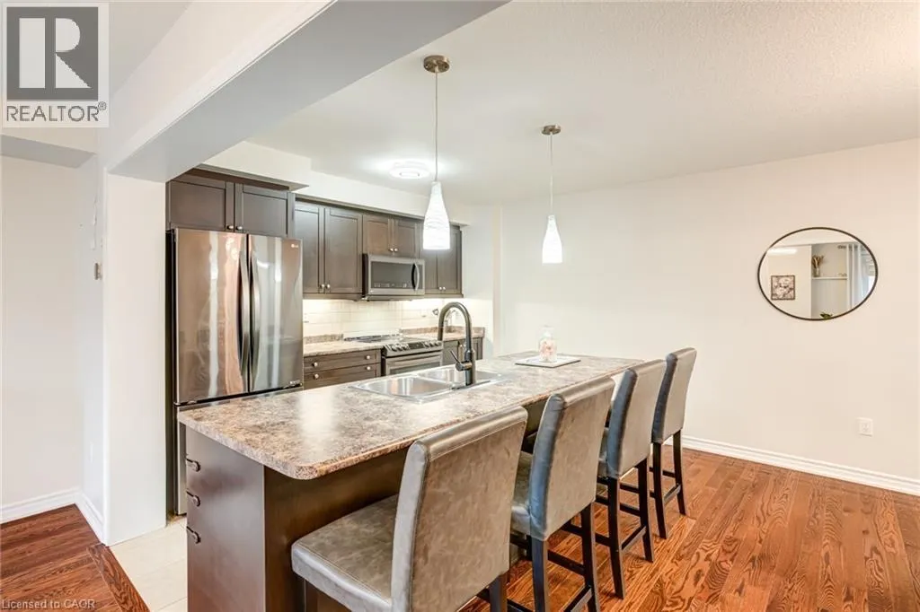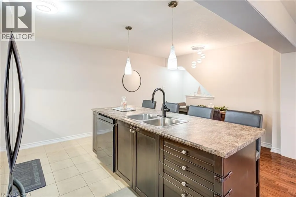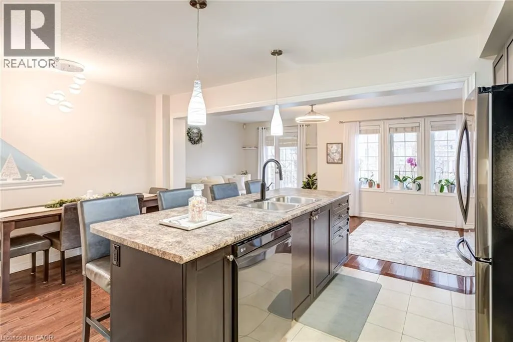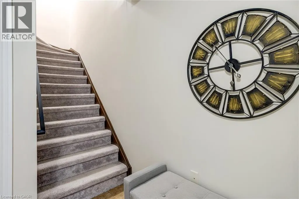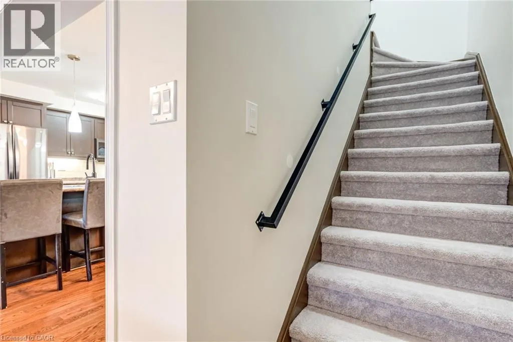 North on Upper Wellington St., West on Sirente Dr Absolutely stunning home with custom lighting and upgrades throughout. This 2 bedroom, 1.5 bath, home offers warmth and style from every angle. Enjoy this beautiful, open, and airy main floor, with hardwood flooring, overflowing with natural light leading to the spacious terrace for those BBQ days. Large kitchen with oversized island is both practical and inviting. 2019 kitchen appliances makes cooking feel like a dream. Newer carpeting on stairs and top floor (2021) Top floor includes two fantastic sized bedrooms. Primary bedroom offers large walk-in closet and ensuite privilege. Great floor plan with plenty of storage space, and attached garage with auto-garage door opener, allow for organization and functionality in your day-to-day living. 2 pc powder room renovated in 2024. Newer washer/dryer (2021). Perfectly cared for home, immaculately maintained, and conveniently located, a must see! (id:27476)