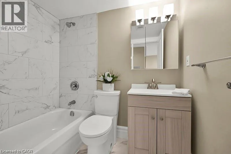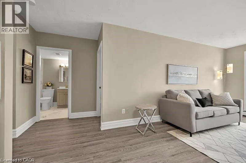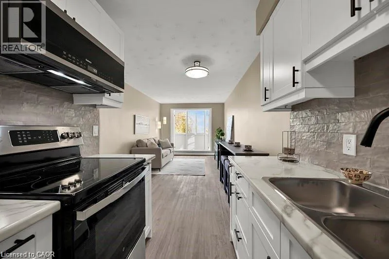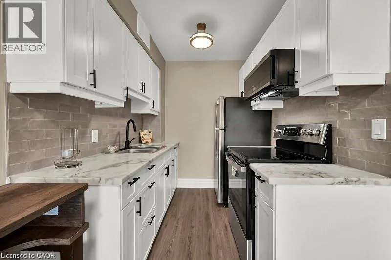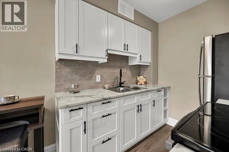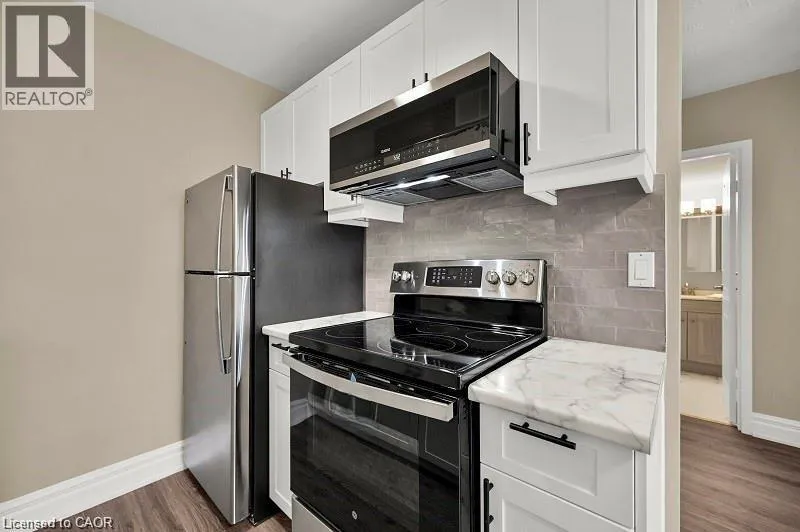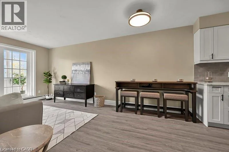 QUEEN STREET BETWEEN HUNTER AND Jackson Live in style in this fully renovated boutique-style suite in one of downtown Hamiltonâs most walkable locations. The bright, open-concept living/dining area flows into a sleek modern kitchen with stainless steel appliances, smart storage and contemporary finishes, making it easy to settle in and start enjoying your space from day one. Carpet-free flooring and updated woodwork throughout create a clean, modern look, while the refreshed 4-piece bathroom features ceramic tile and quality fixtures. The spacious bedroom offers sliding double closet doors and great storage, and the west-facing sunroom adds flexible bonus space â perfect for a home office, reading nook or cozy lounge area. Comes partially furnished with moveable breakfast bar and matching stools, bedroom set and several great curated storage accent pieces. Residents also enjoy an outdoor common BBQ area, ideal for relaxed evenings and casual entertaining. Rent conveniently includes heat, hydro and water, so monthly budgeting is simple and predictable. This quiet, well-maintained building is an ideal choice for renters looking for high-end renovations, partial furnishings and a turnkey downtown Hamilton lifestyle â just move in and enjoy. (id:27476)