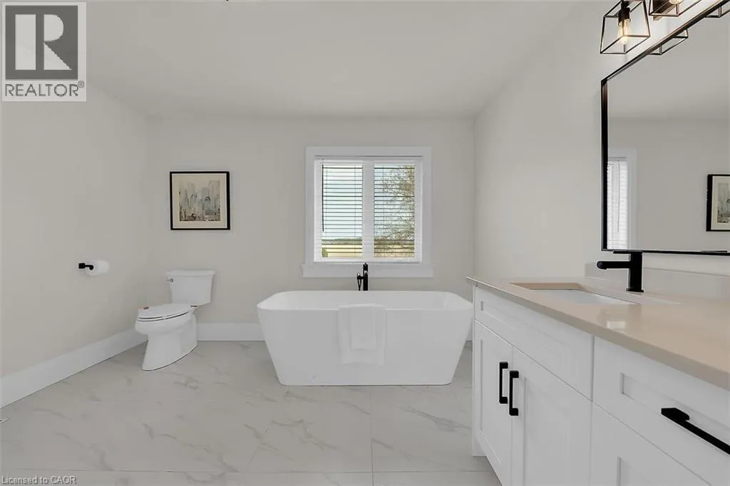 From Hwy 6, East on Airport Road, Property is on left hand side. Rent to own option available. Luxury custom home built in 2023. Escape to the country with the convenience of all amenities just a short drive away! Minutes from Hwy 6 & Hwy 403, with quick access to shopping, restaurants and Hamilton Airport. The main floor features an open concept layout with a combination of engineered hardwood and tile floors, and an abundance of natural light. The den is situated at the entry of the home and provides a great work from home space. The kitchen offers quartz counters and backsplash, stainless steel appliances and a large island that is great for entertaining. There is also an upper level family room which is ideal for large and growing families. The stunning primary suite features a lavish ensuite with freestanding soaker tub and separate shower plus an enormous walk in closet. The upper level hosts 3 additional bedrooms, main 5 piece bath and a convenient laundry room. Enjoy the outdoors on your covered rear porch complete with scenic farm views. (id:27476)