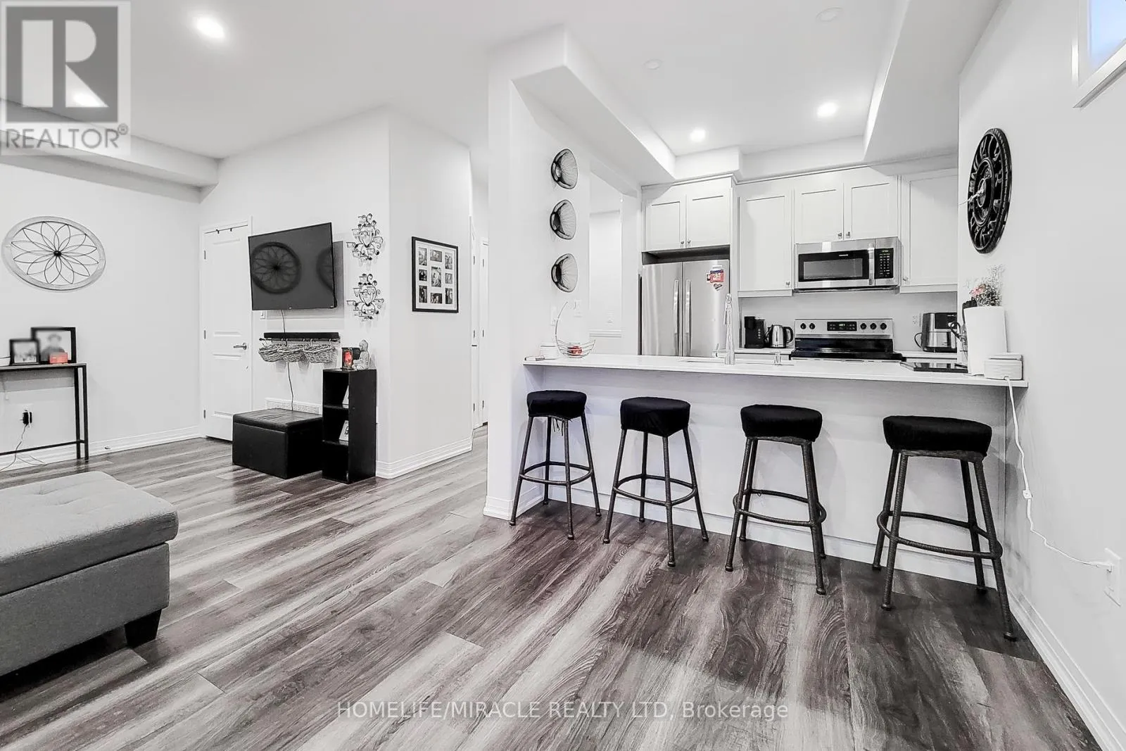 Woodward and Barton This stylish end-unit, 3-storey townhome offers over 1,400 sq. ft. of thoughtfully designed living space, featuring 3 bedrooms and 2 bathrooms. The ground level includes a versatile foyer ideal for a home office and an attached garage with interior access. The main level impresses with a contemporary kitchen featuring stainless steel appliances, quartz countertops, and a generous island, along with a breakfast area and balcony access. The sun-filled family room, powder room, and convenient stacked laundry complete the space. The upper level hosts three well-appointed bedrooms and a full bathroom. Fully finished on all levels with no basement or backyard, this home is ideally situated near major highways, the lake, shopping, schools, and parks. (id:27476)